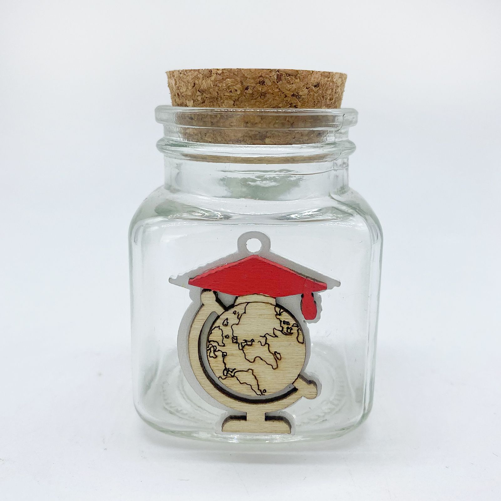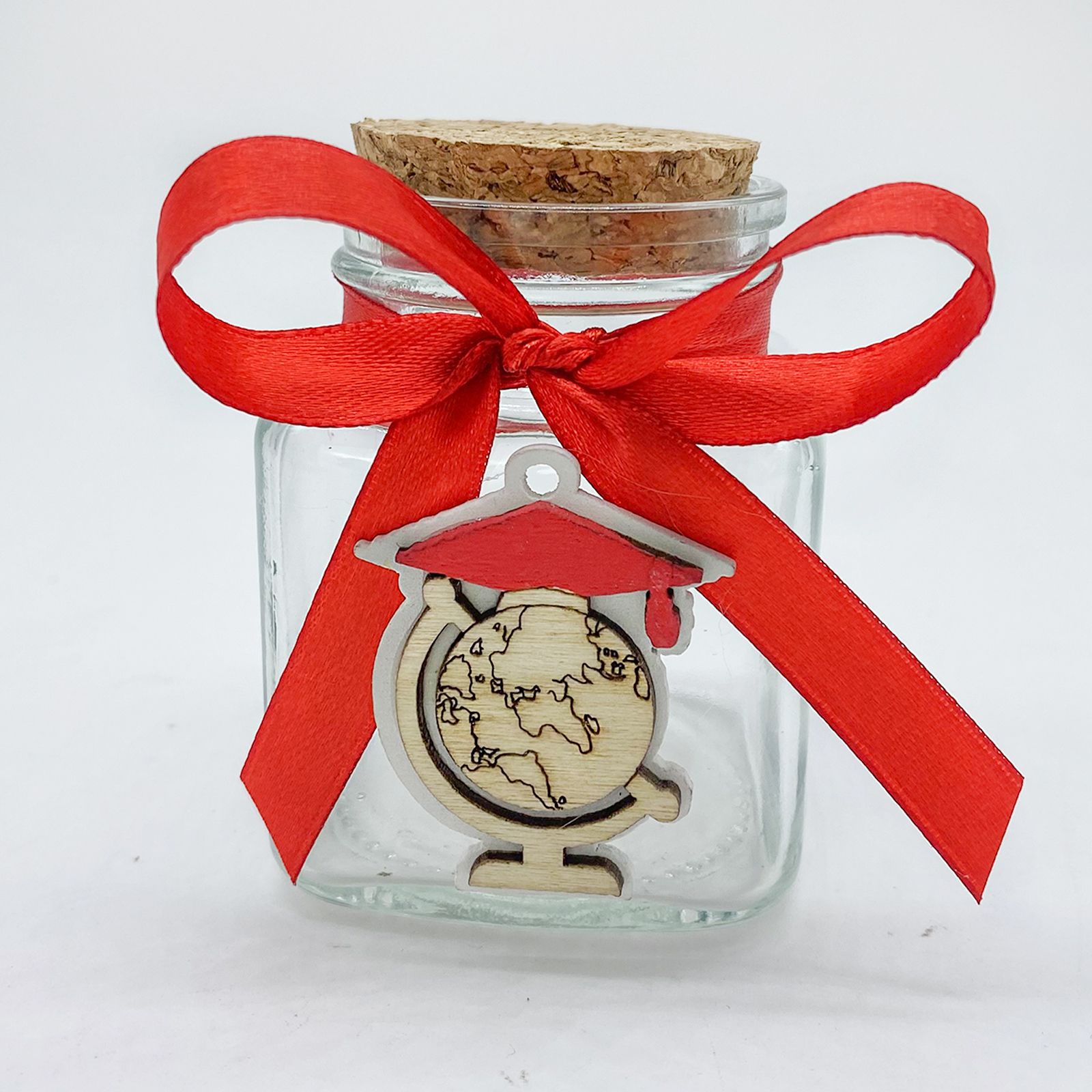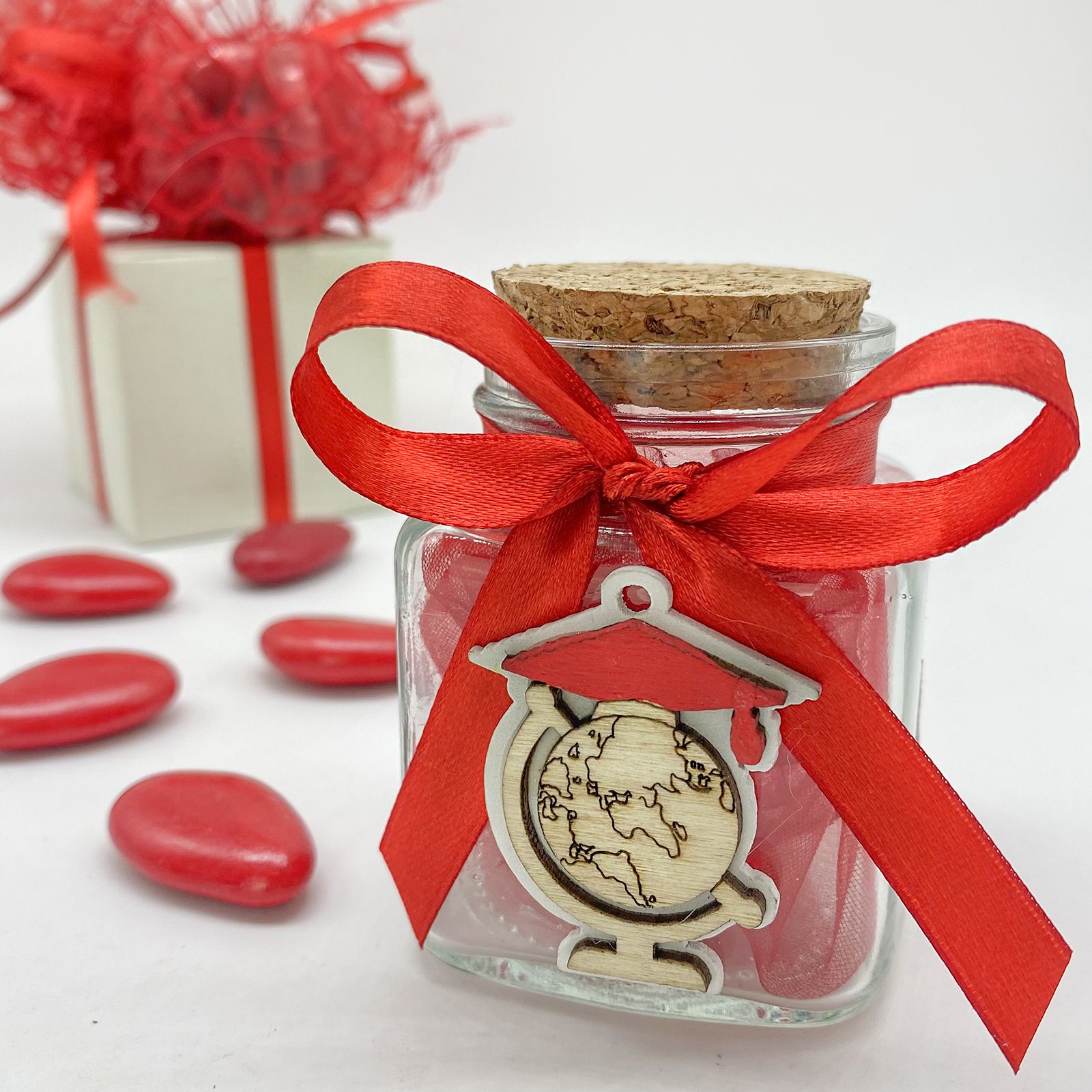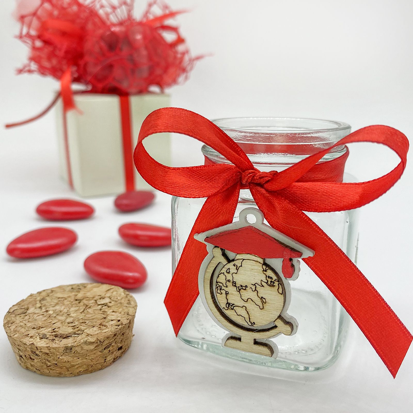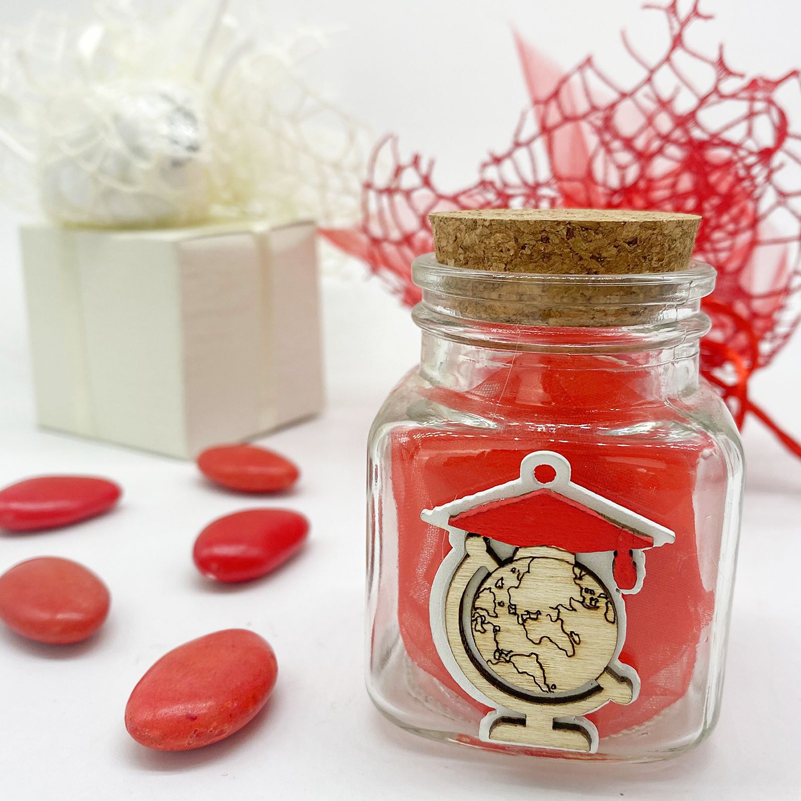 Un regalo significativo per celebrare il traguardo della laurea. Il barattolino in vetro con tappo in sughero è arricchito da una splendida applicazione in legno raffigurante un mappamondo dalle tonalità naturali. Sul mappamondo si trova un piccolo tocco che rappresenta il cappello rosso, simbolo universale della laurea.