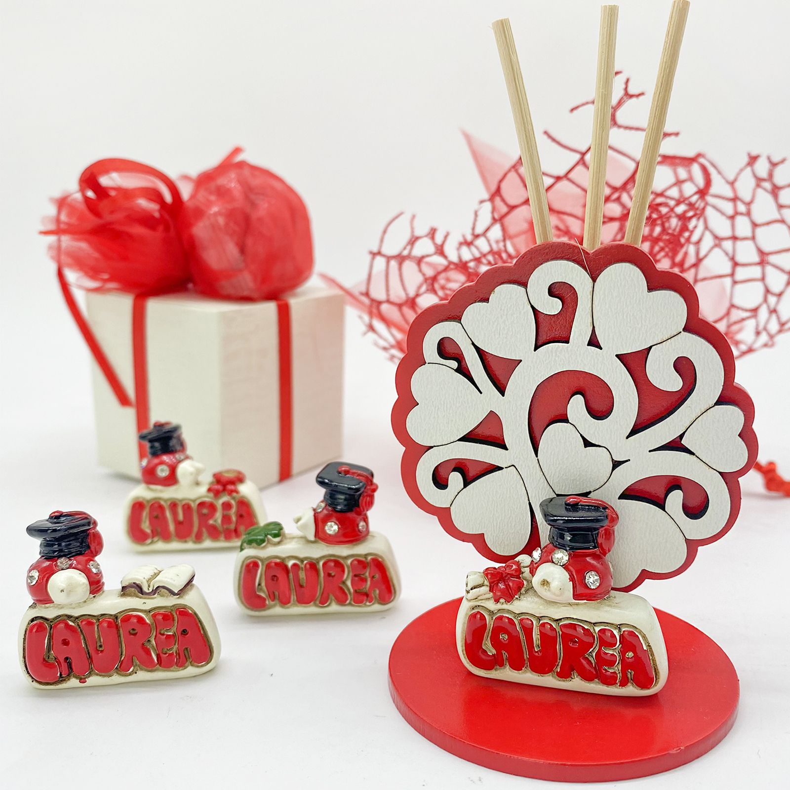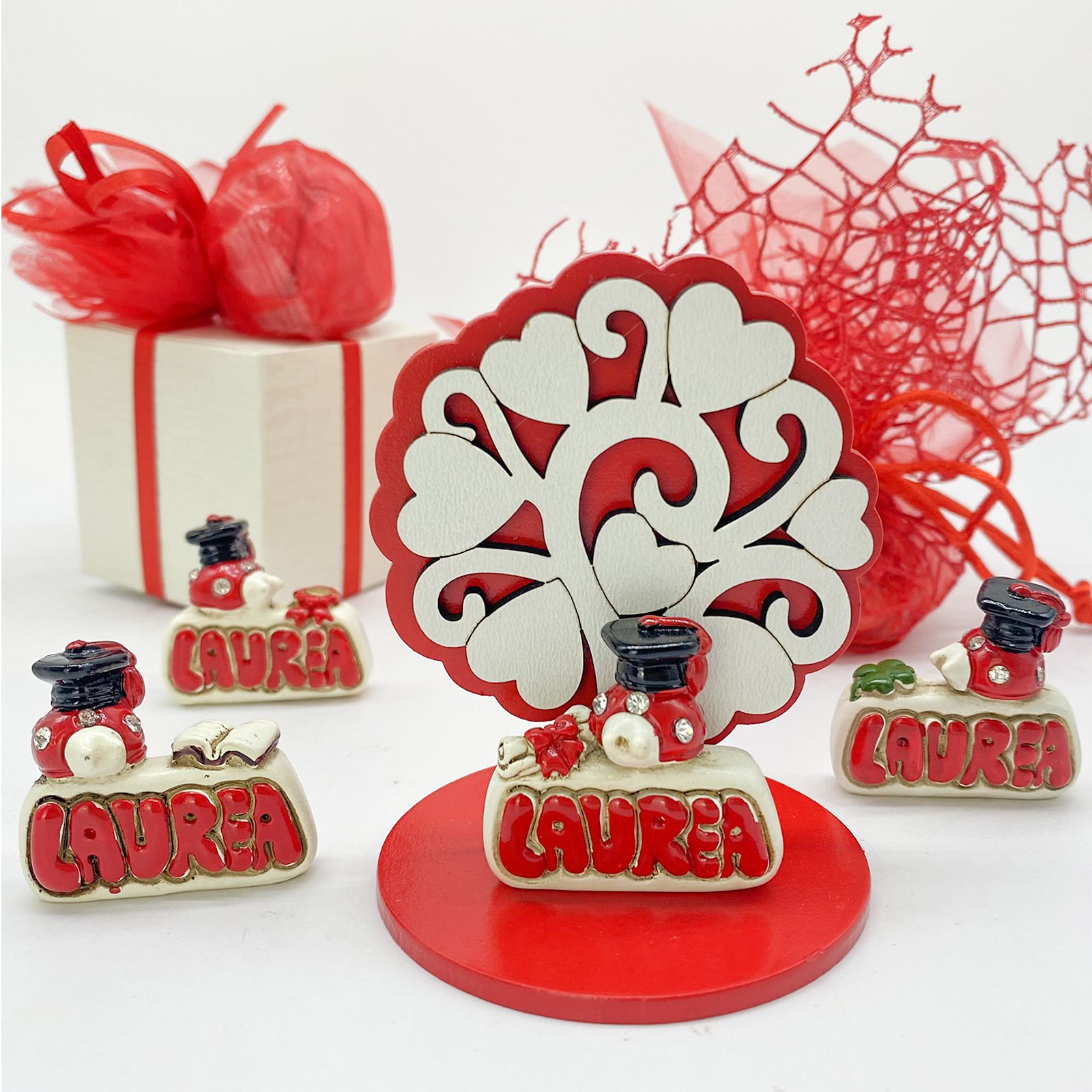 Il set comprende un albero della vita in legno con foglie bianche che rappresentano la crescita e il nuovo percorso intrapreso dopo la laurea e la scritta laurea in resina con coccinella portafortuna con tocco e strass che simboleggia fortuna e successo nella vita futura, assortita in quattro varianti.