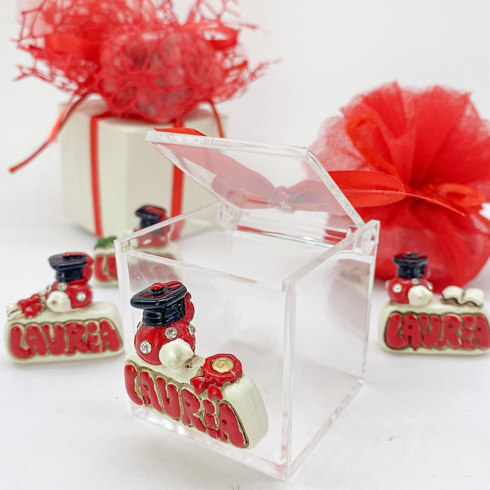 Regalare la SCATOLINA PLEXIGLASS CON APPLICAZIONE IN RESINA LAUREA simboleggia l'affetto e la gratitudine per la persona che ha raggiunto questo importante traguardo nella sua formazione. È un gesto significativo e carico di buoni auspici per il futuro del laureato, rendendo questa bomboniera un ricordo indimenticabile di un momento così speciale.