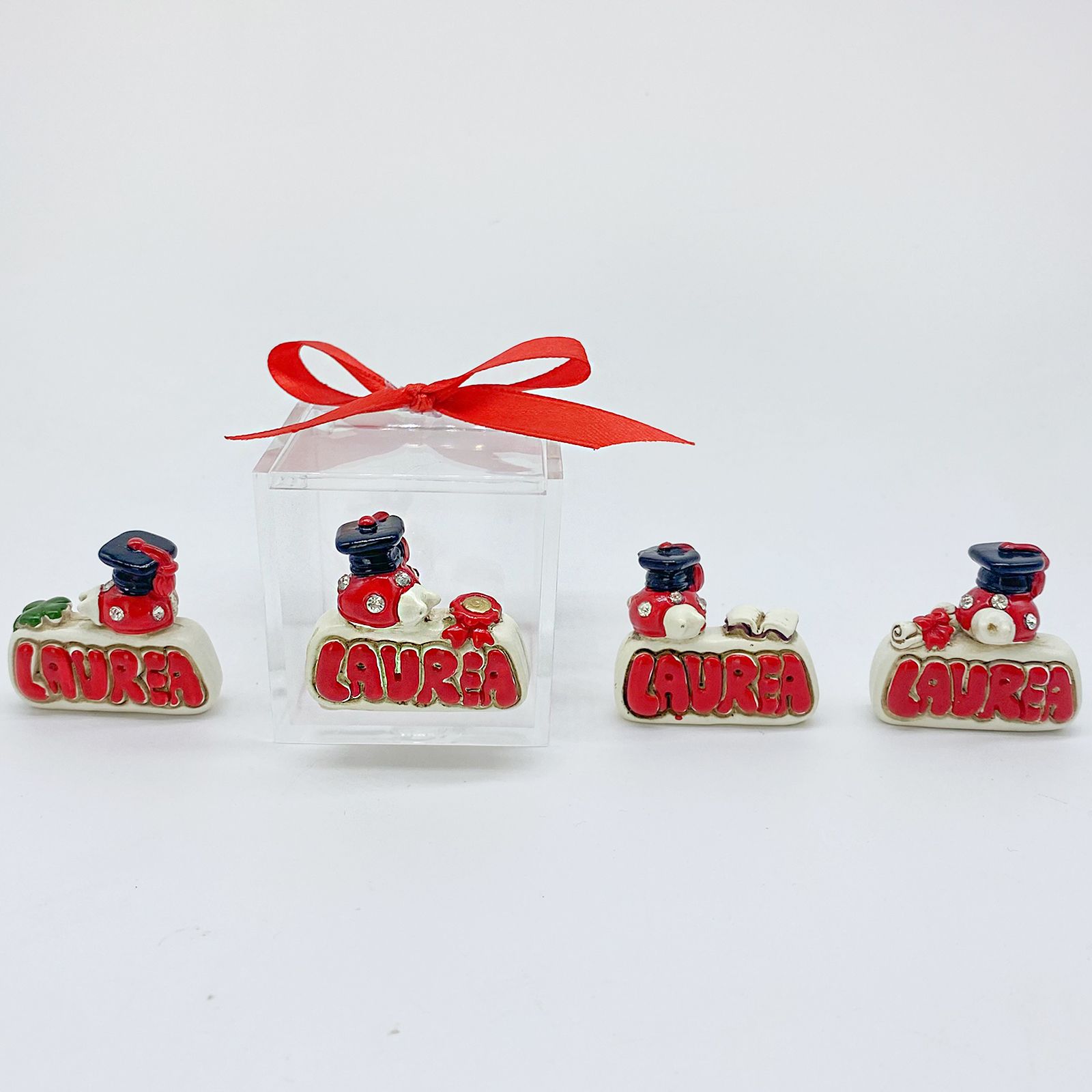 La SCATOLINA PLEXIGLASS è un'elegante e trasparente bomboniera a forma di cubo, perfetta per festeggiare la laurea con stile. La caratteristica distintiva di questa bomboniera economica è l'applicazione in resina a forma di laurea, posizionata vicino alla scatolina. L'applicazione presenta la scritta "Laurea" e una graziosa coccinella con strass e un tocco nero, simboli di buon auspicio e successo nel futuro del laureato. Disponibile in 4 varianti diverse, che aggiungono un tocco di originalità e personalità alla bomboniera questa bomboniera è ideale per essere utilizzata come segnaposto durante la festa di laurea, aiutando gli invitati a trovare il proprio posto e creando un'atmosfera di gioia e festa. Inoltre, può essere riempita con confetti o dolcetti, rendendola un dolce regalo da portare a casa come ricordo speciale dell'evento.