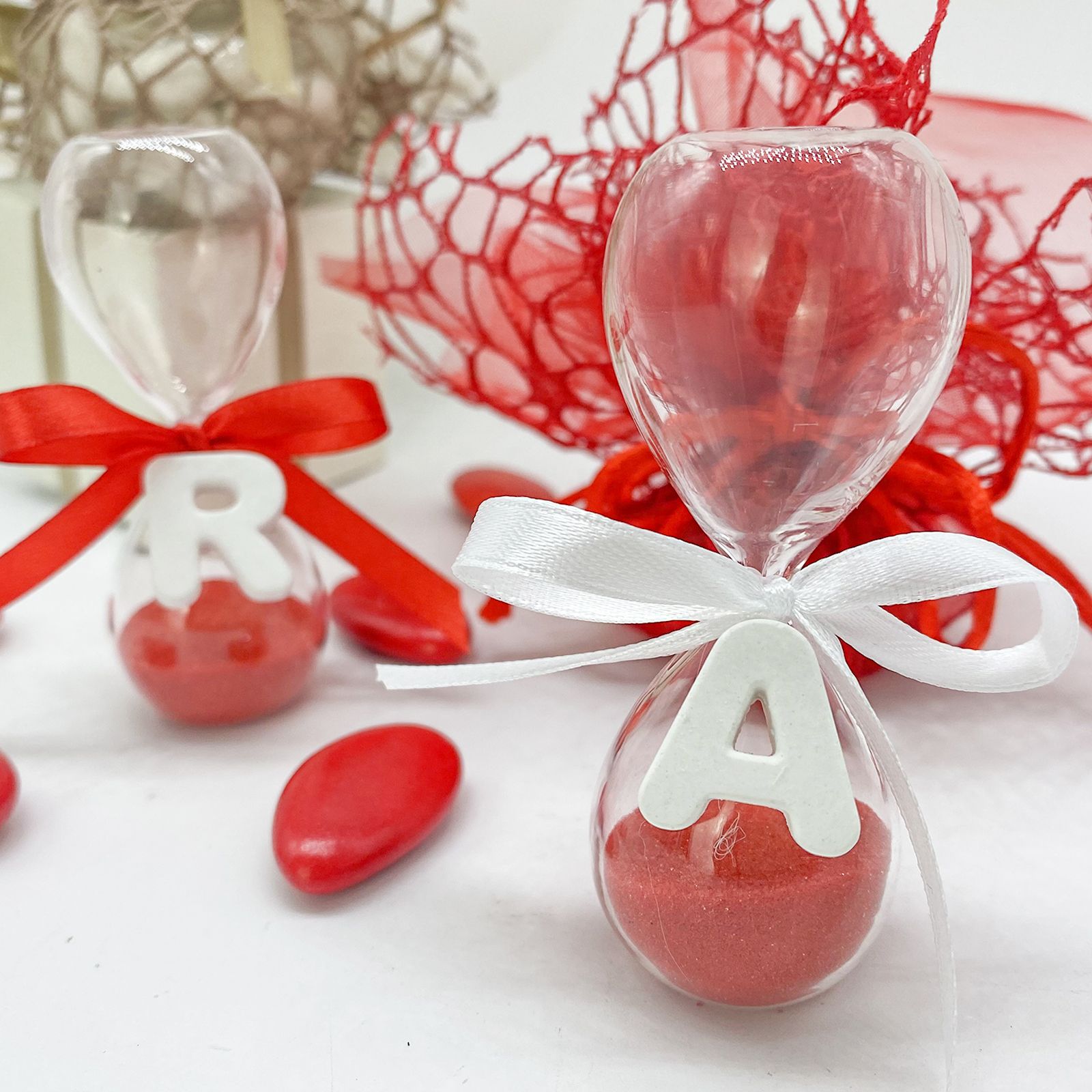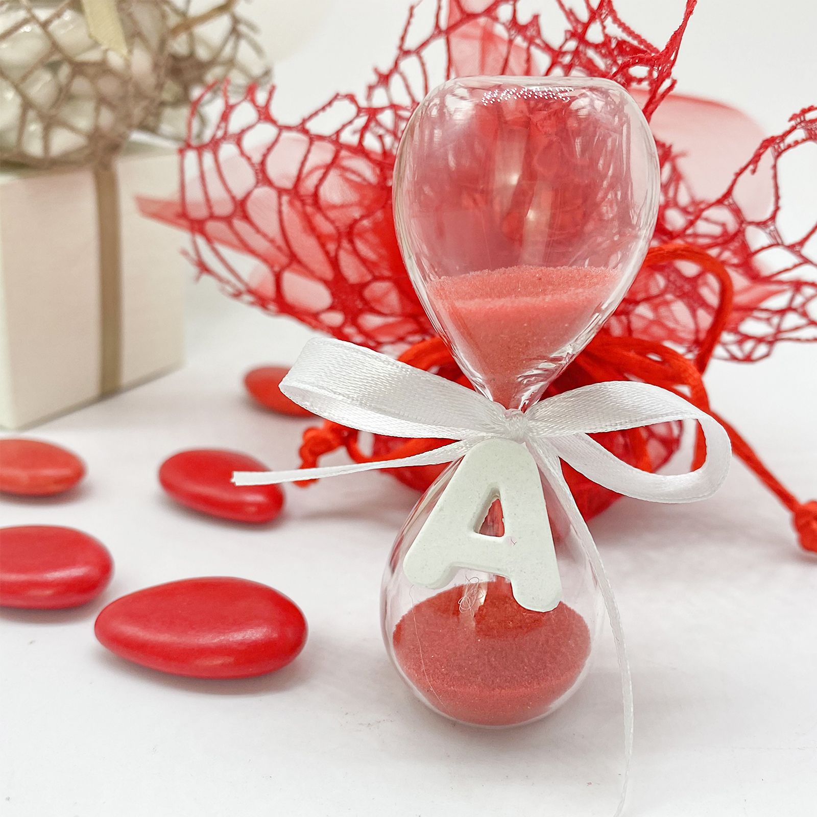 La clessidra è composta da vetro di alta qualità con sabbia rossa, mentre l'elegante letterina iniziale in gesso aggiunge un tocco di personalizzazione.