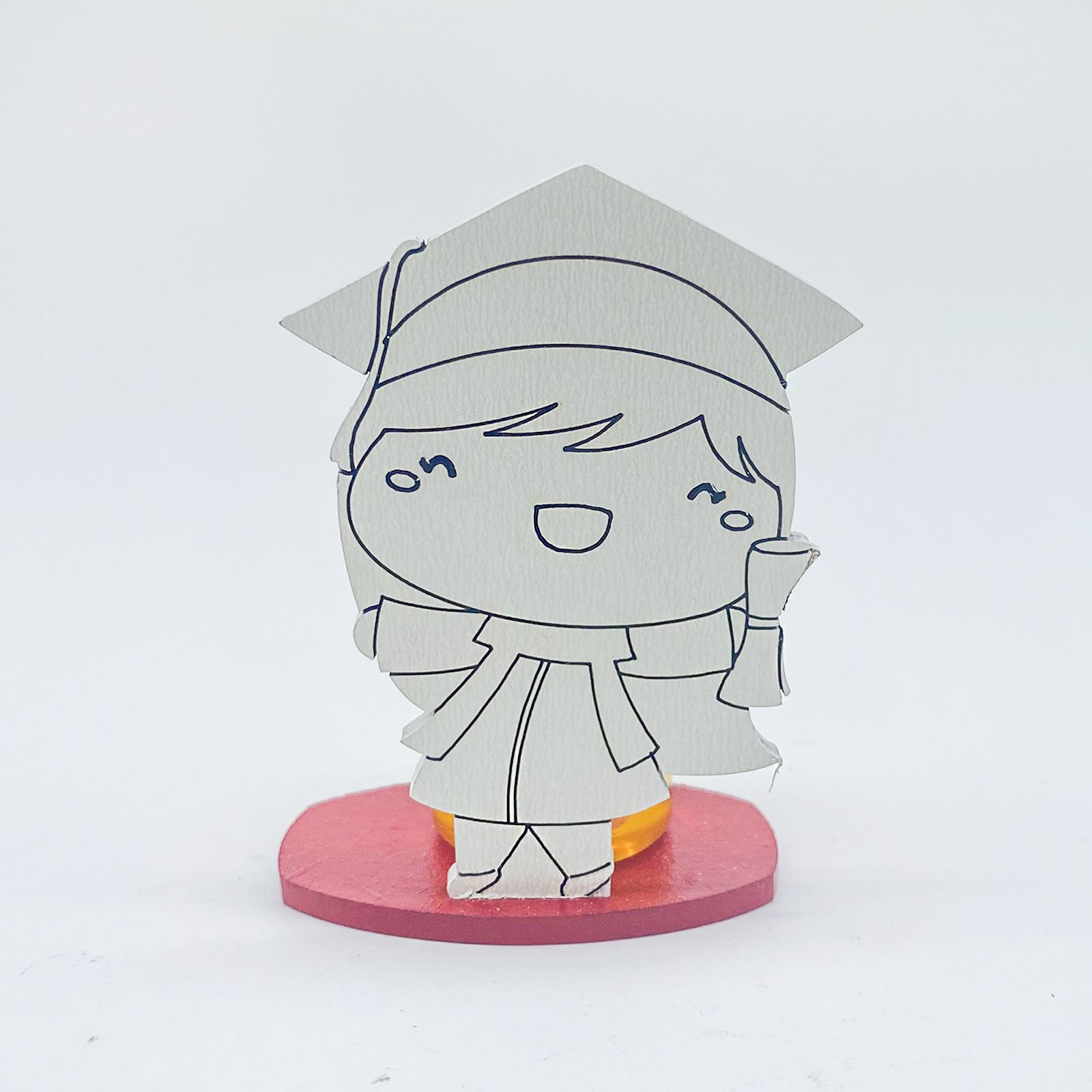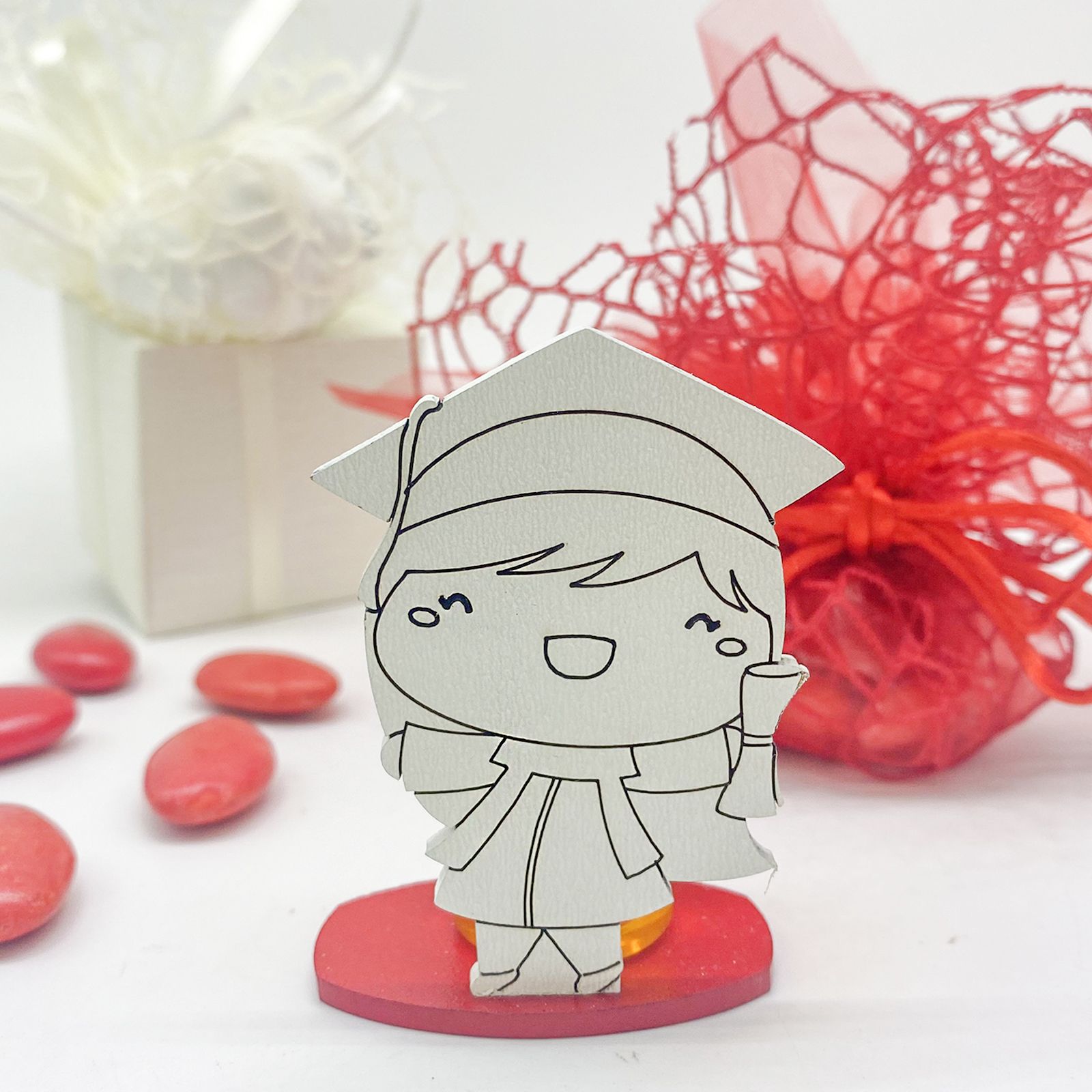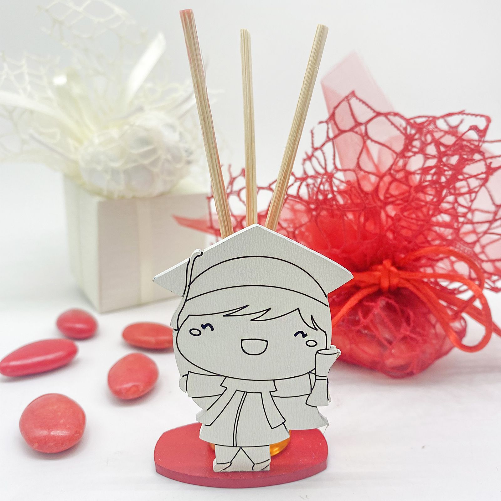 Questa bomboniera unica presenta una figura stilizzata sorridente con un grazioso tocco e una pergamena, simboli di un importante traguardo. Il profumatore è realizzato con cura, con una base in legno rosso e dettagli in tonalità bianco ottico con rifiniture color tortora.