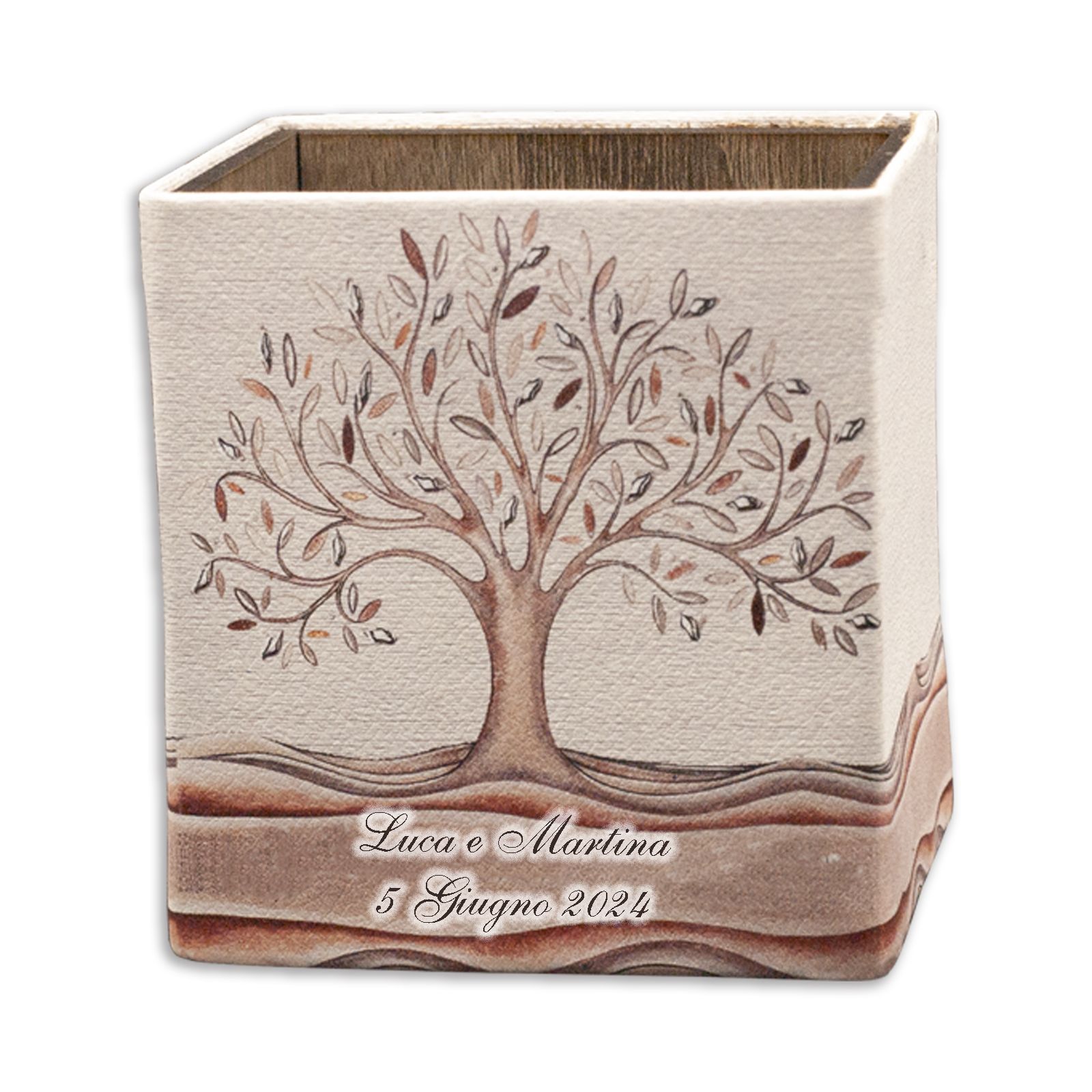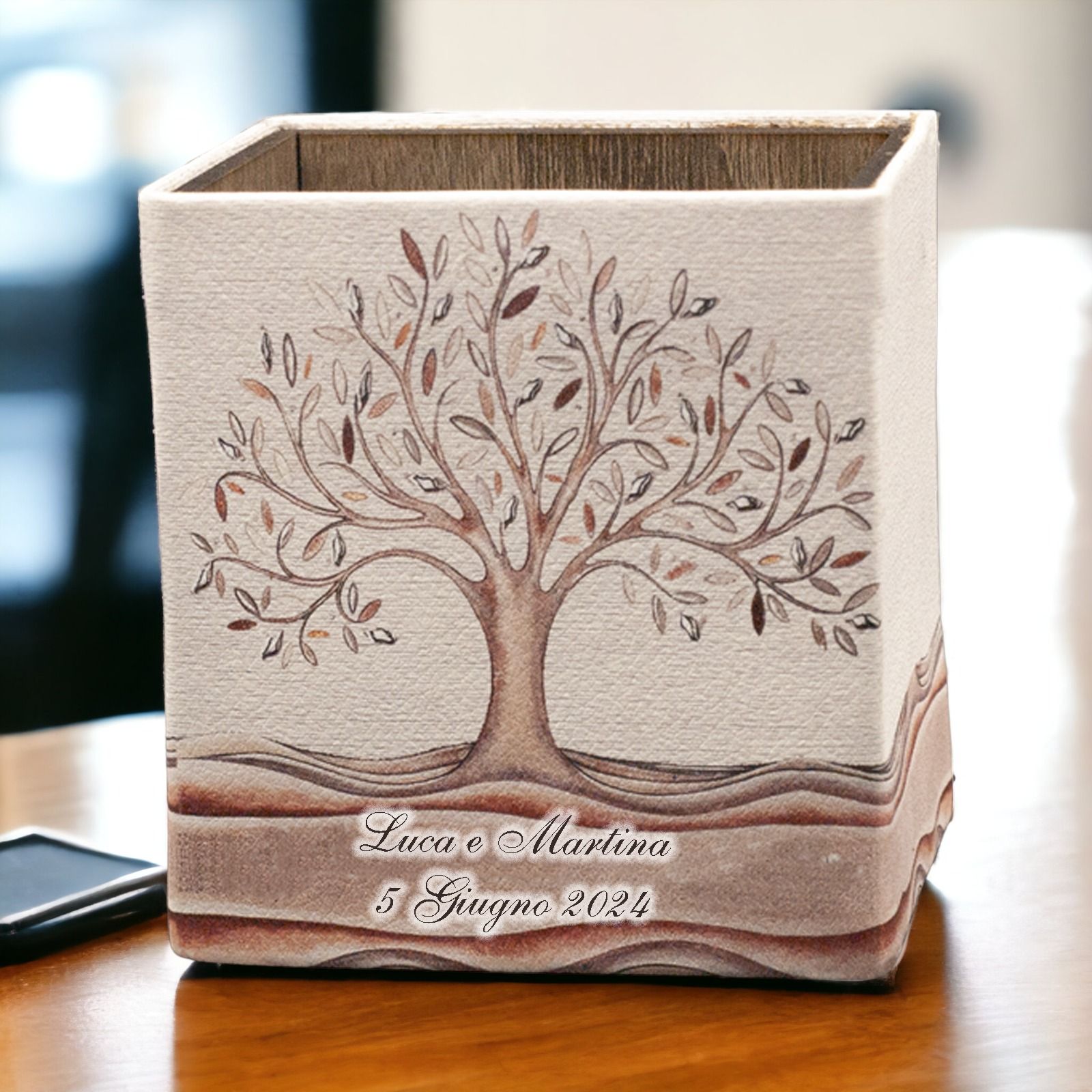 La nostra bomboniera laurea è un elegante porta penne realizzato con materiali di alta qualità, come ecopelle e legno, e presenta un significativo albero della vita.