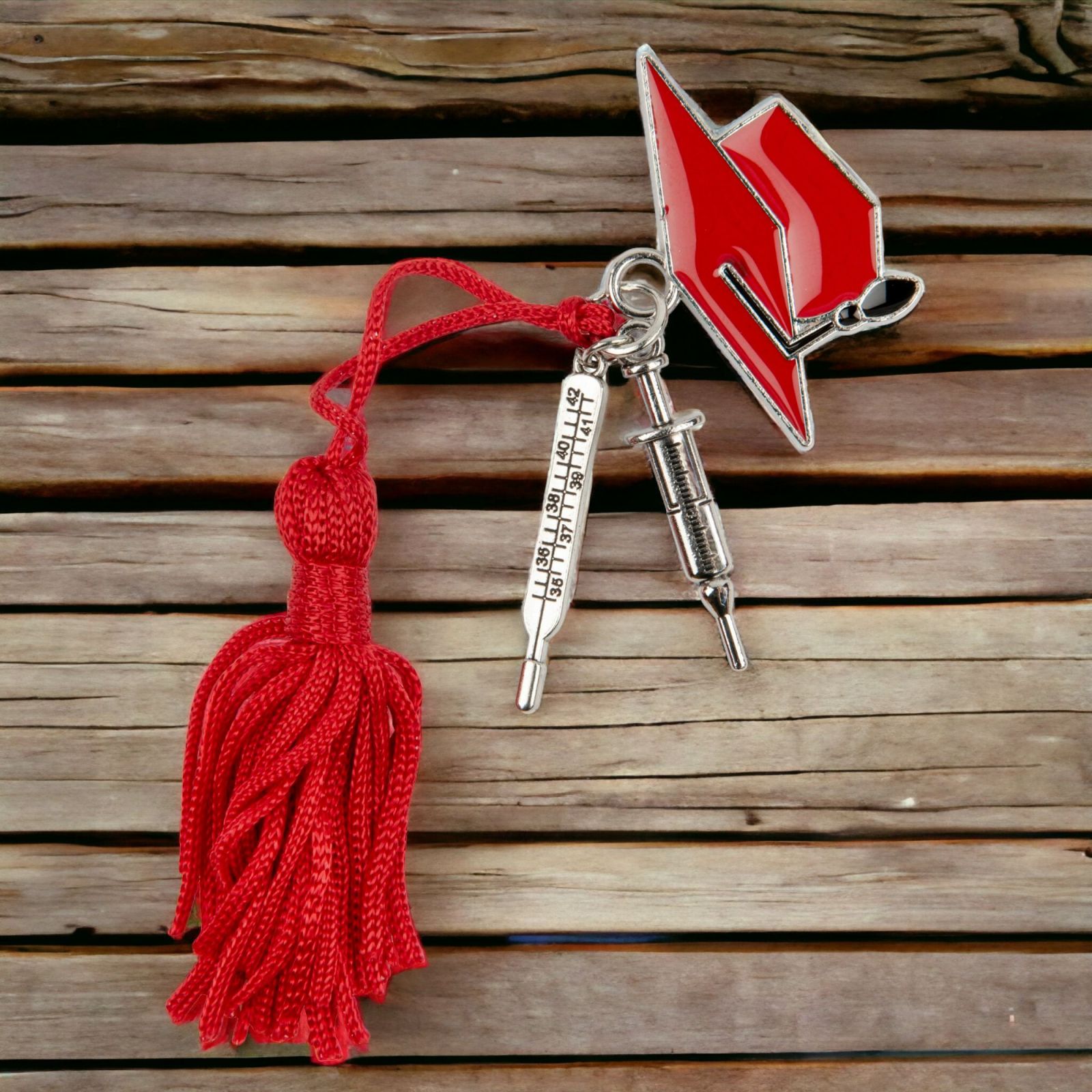 Regala un ciondolo con siringa e termometro con nappina e tocco rosso per i tuoi invitati a un evento importante.