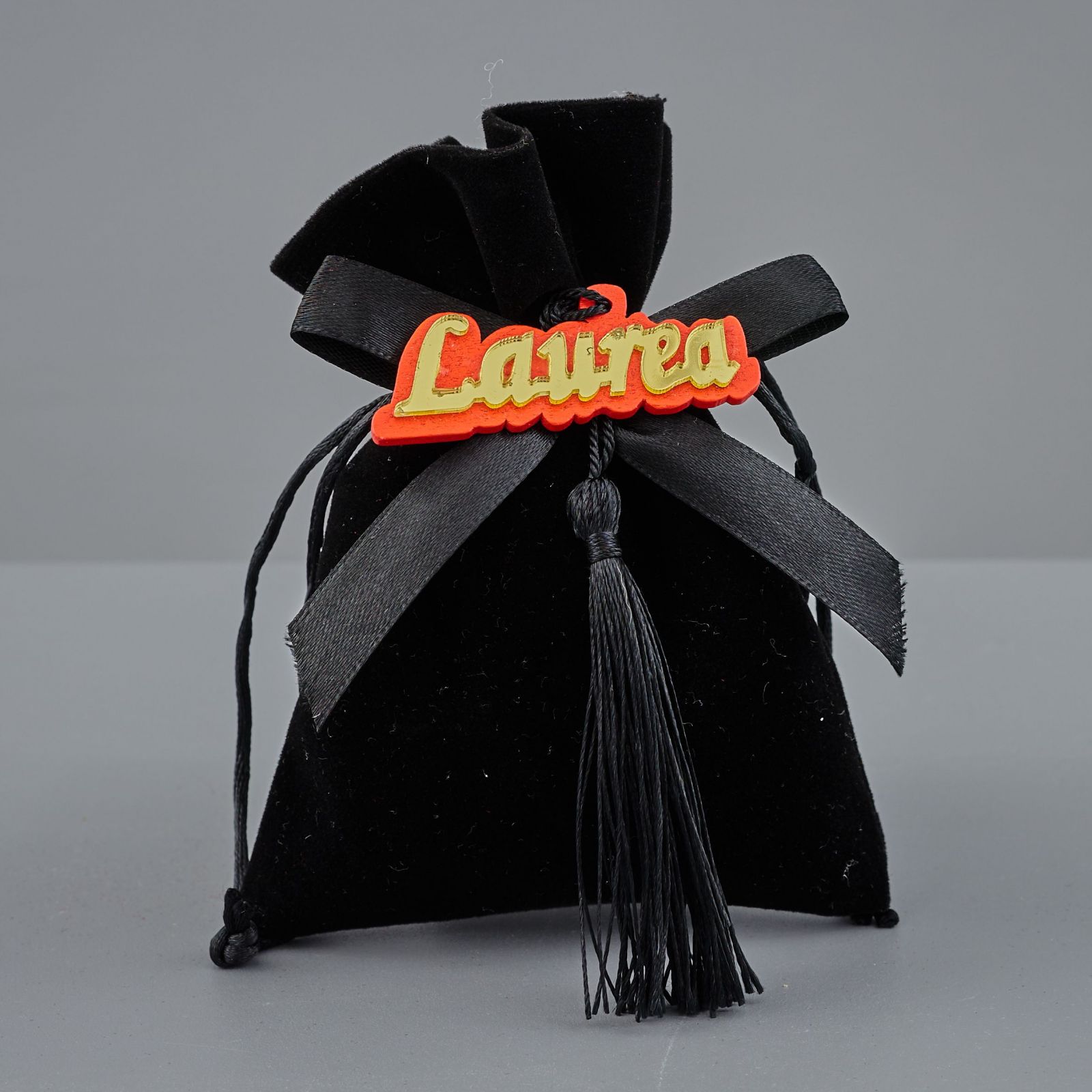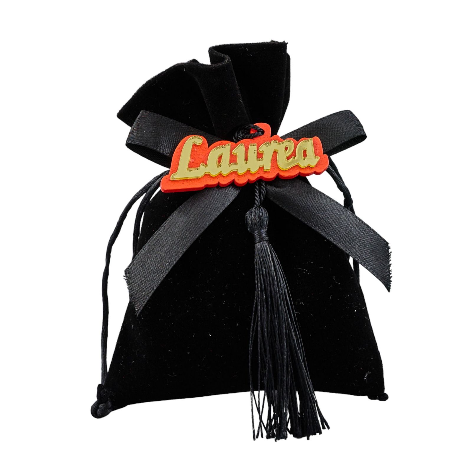 Regala un magico ricordo da tenere sempre con sé: il sacchetto per confetti nero con fiocco in tinta e scritta laurea in plexiglass!