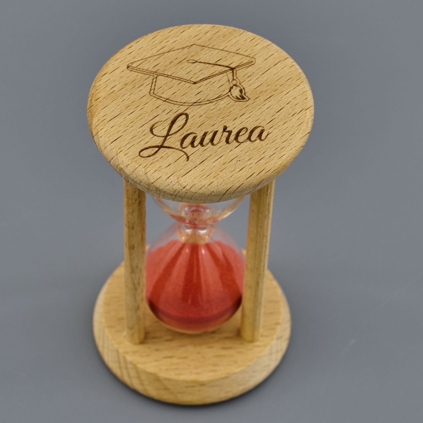 Regalare una bomboniera è un gesto simbolico che esprime gratitudine e affetto; per una laurea in qualsiasi facoltà, una clessidra con sabbia rossa con struttura in legno e incisione di un tocco e della scritta "laurea" è un dono ideale ed unico.