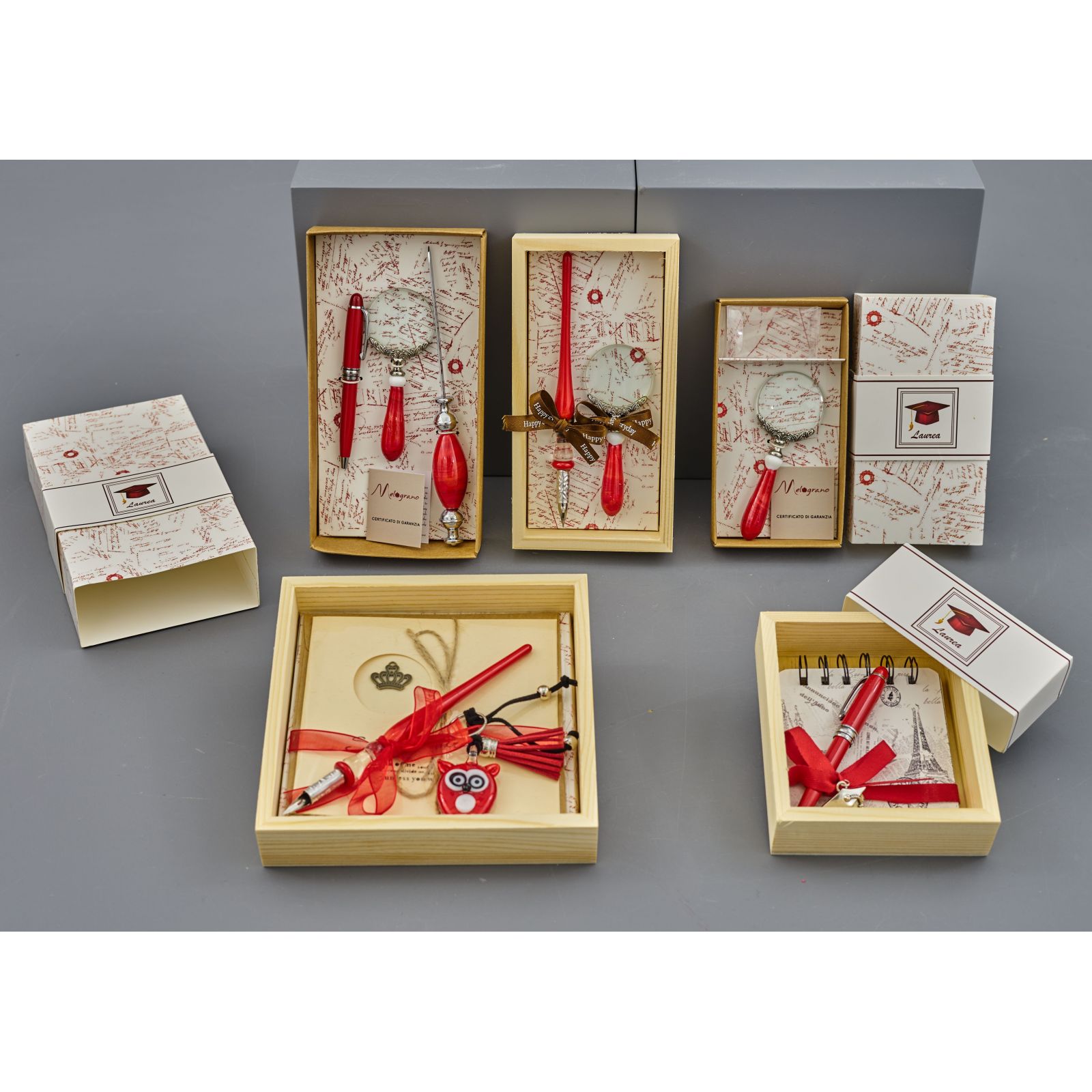 Regala utilità e simbolismo con questo set composto da una penna stilografica, un porta chiave con gufetto e un block notes in un pratico box in legno! Un regalo perfetto per amici e invitati alla tua laurea, che racchiude sia un valore utile che simbolico. Le penne stilografiche per laurea sono un augurio per una futura carriera di successo e possono essere un ricordo prezioso di un importante evento. Il prezzo si riferisce al kit completo, già pronto da regalare.