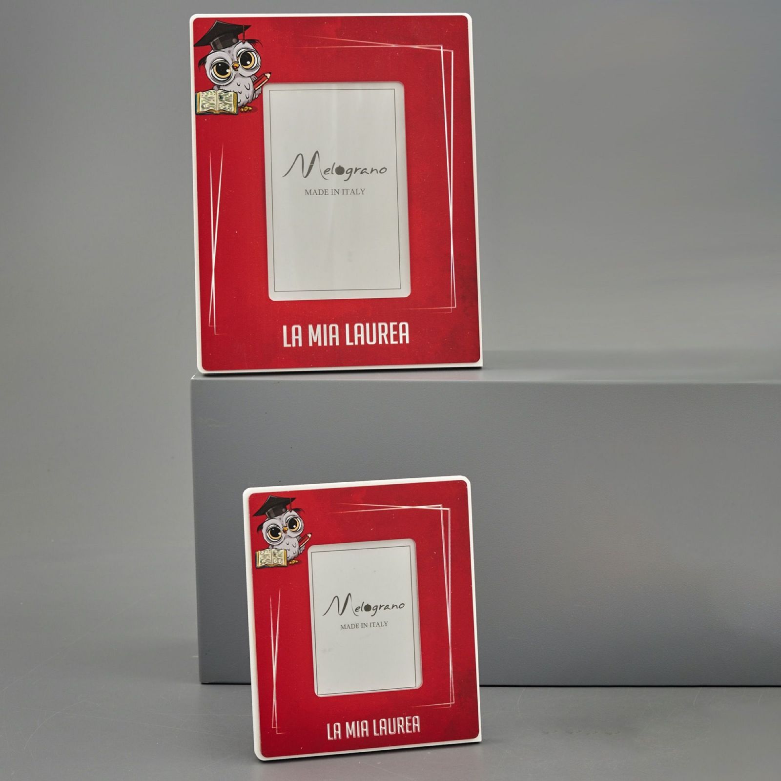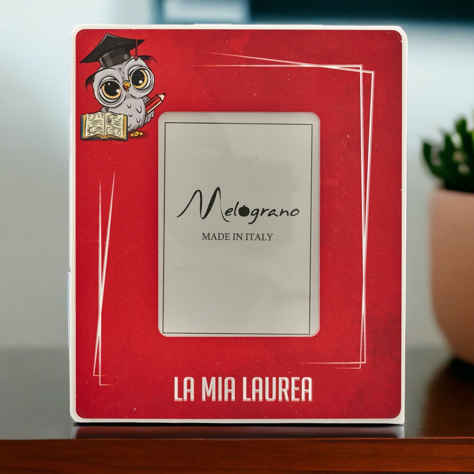 Celebra il successo con la nostra cornice portafoto rossa dedicata alla laurea, impreziosita dalla dolce scritta: "La mia laurea" e dall'immagine di un simpatico gufetto con tocco e pergamena. Un regalo originale e particolare per commemorare questo importante traguardo.