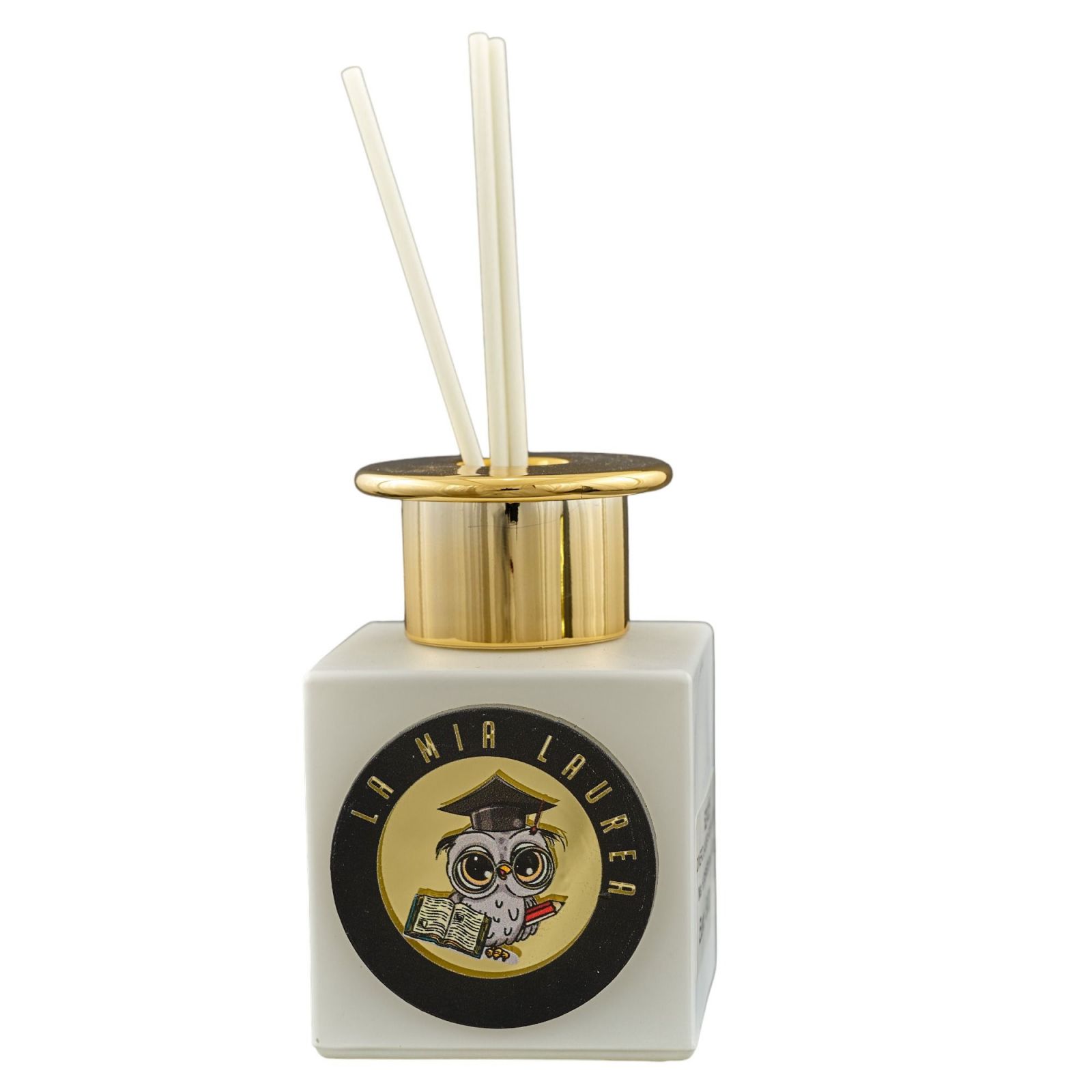 Realizzato con cura e attenzione ai dettagli, questo profumatore è di colore bianco con un tappo color oro e cerchio nero, aggiungendo un tocco di raffinatezza al tuo ambiente. Il gufetto laureato e la scritta "La Mia Laurea" conferiscono un significato speciale al prodotto.