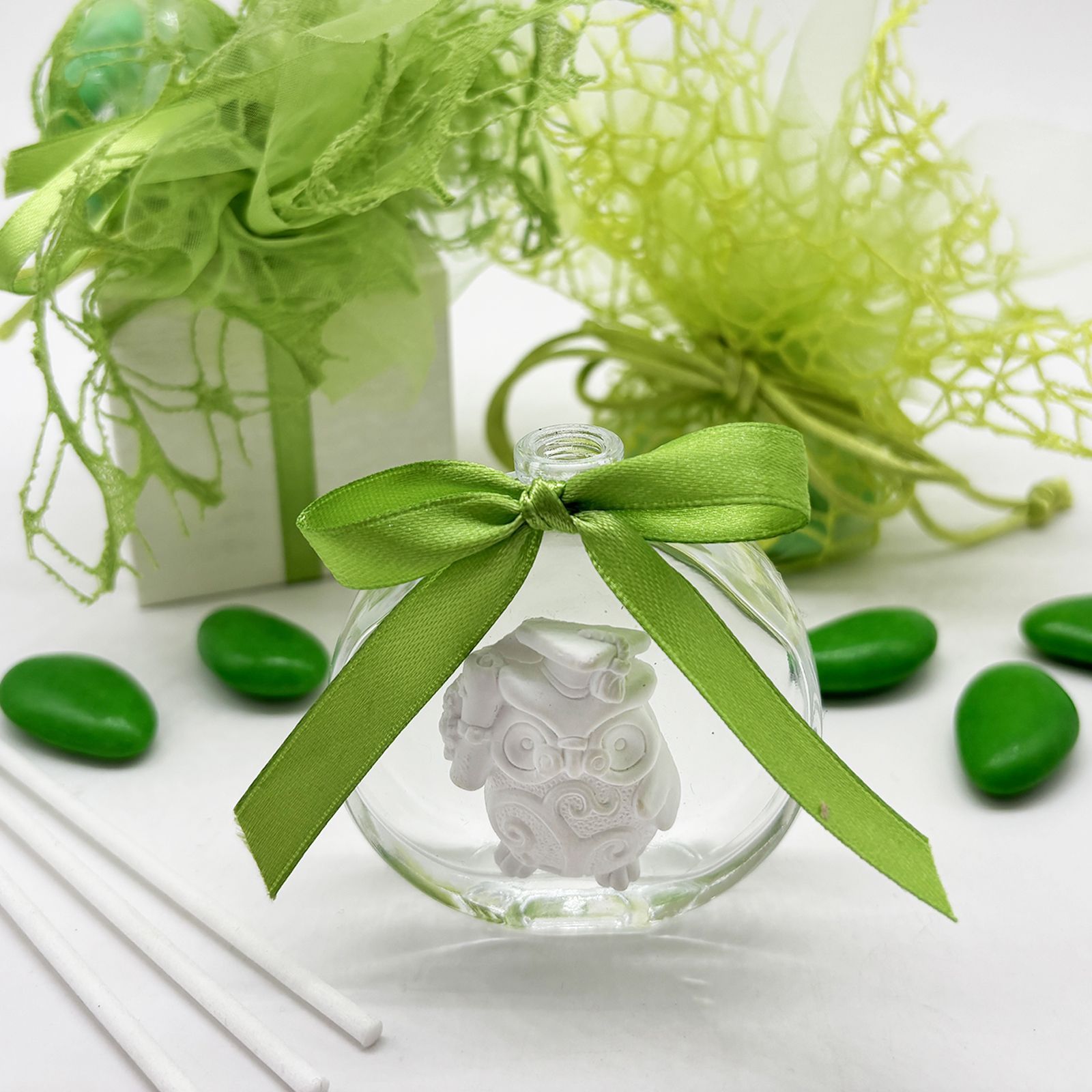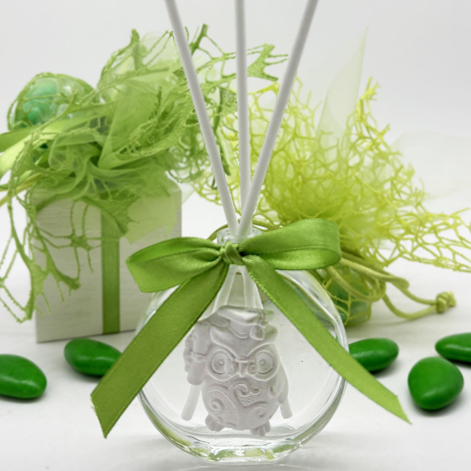 Condividi questo profumatore come ricordo speciale del tuo grande traguardo. Il gufetto, simbolo di saggezza e portafortuna, riempirà le case dei tuoi cari di gioia e positività.