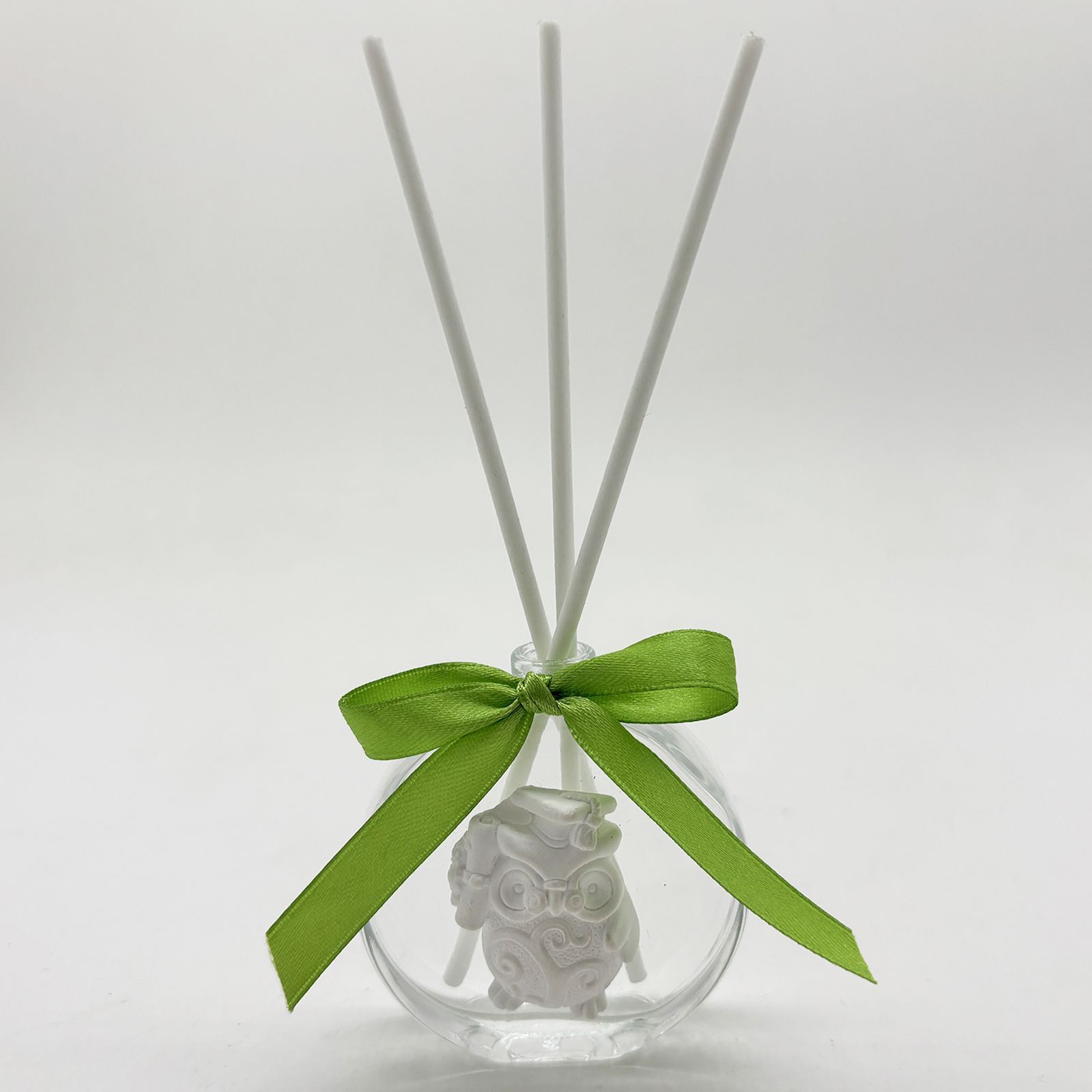 Le dimensioni del profumatore sono 6,5 x 6 cm, mentre il gufetto misura 4 x 3 cm. Il gessetto bianco aggiunge un tocco di eleganza a questo dono, che sarà sicuramente apprezzato dai tuoi invitati. Sono inclusi anche tre bastoncini spargiessenza in omaggio.