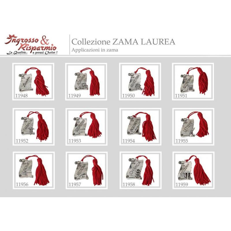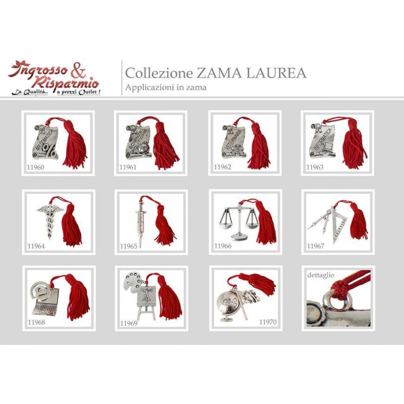 Pergamene Laurea in metallo (zama) rettangolari argentate, con incisione centrale scritta "Laurea" e coccarda posta nell'angolo sinistro superiore. In altro, un occhiello che permette a questa applicazione di essere utilizata come ciondolo laurea, al quale è legata una nappa rossa.