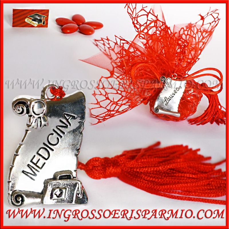 Placchette Laurea in metallo argentato (zama) con incisione centrale scritta "Medicina" in obliquo e applicazione di nappina rossa adornativa. La pergamena è decorata con una coccarda in alto a sinistra e borsa medico in basso a destra, come simbolo della professione.