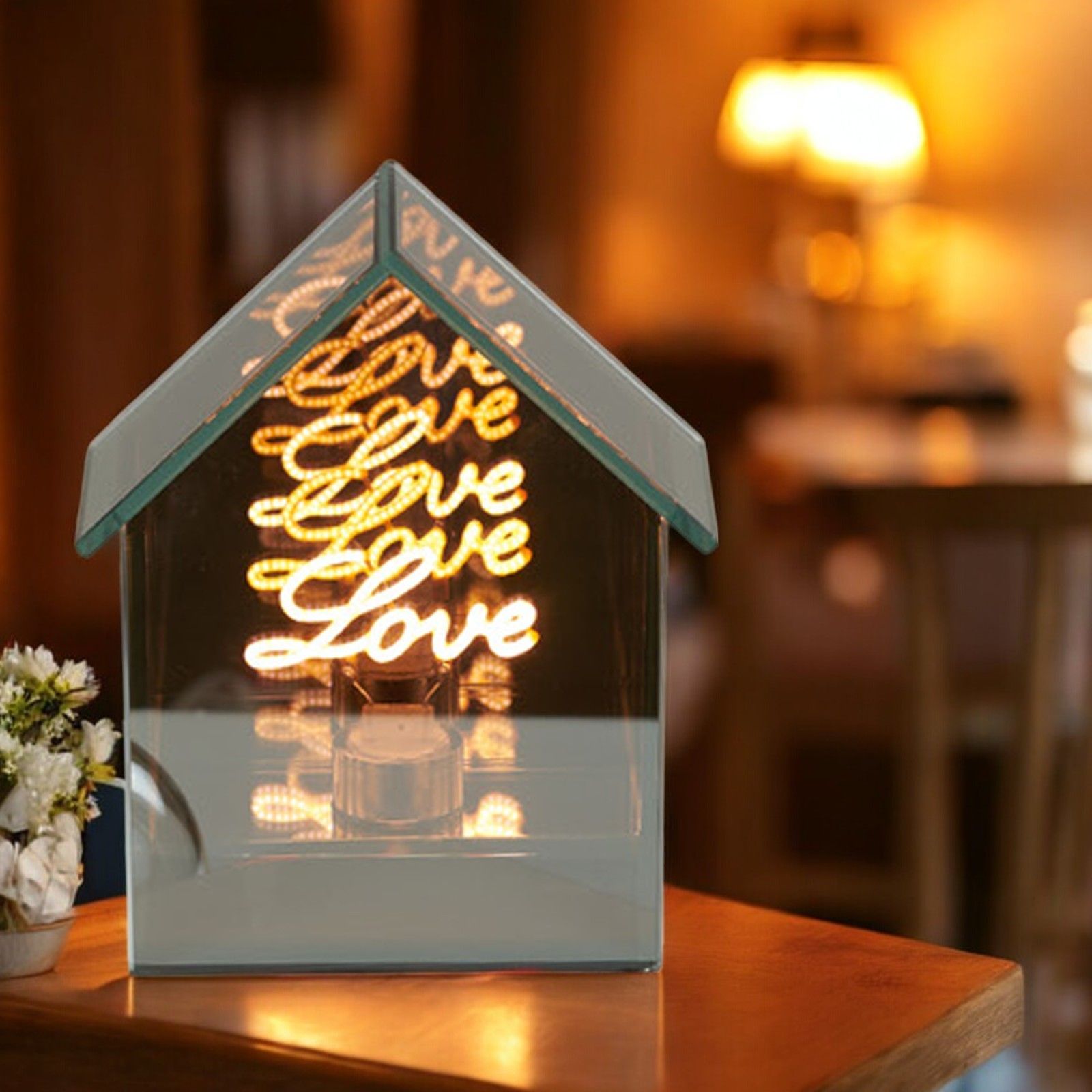 Nella nostra collezione di bomboniere per matrimonio e anniversario, ti presentiamo questa bellissima lampada a forma di casetta con scritta love che si illumina all'interno. Un regalo unico e originale per i tuoi invitati che renderà speciale il tuo evento.