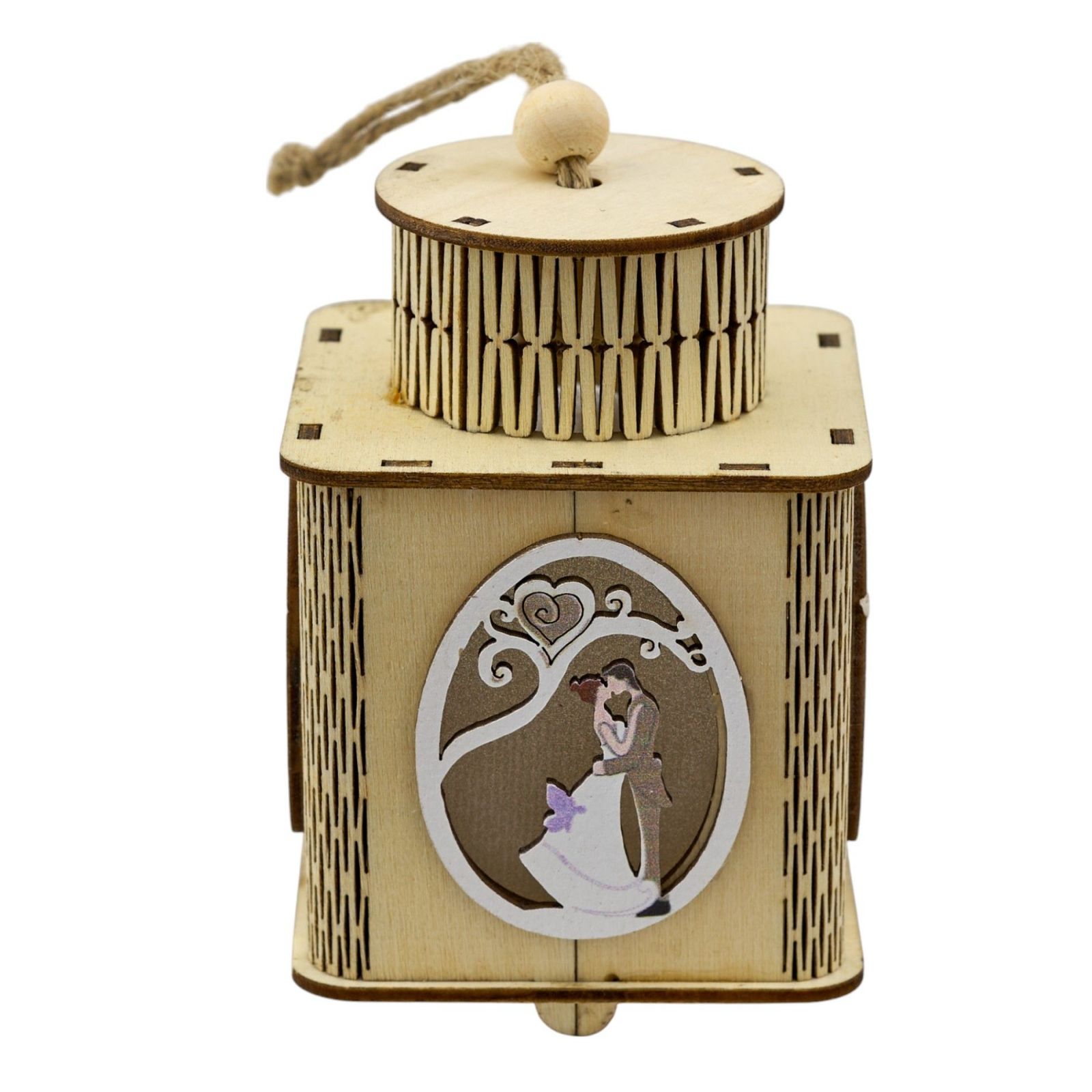 Realizzata in legno color legno e bianco, questa bomboniera ha dimensioni di circa 7 x 7 x 10 cm e rappresenta un simbolo di amore e felicità. La luce delicata del led crea un'atmosfera romantica e magica, ideale per rendere indimenticabile il tuo evento. Un'aggiunta elegante che cattura l'essenza del momento.