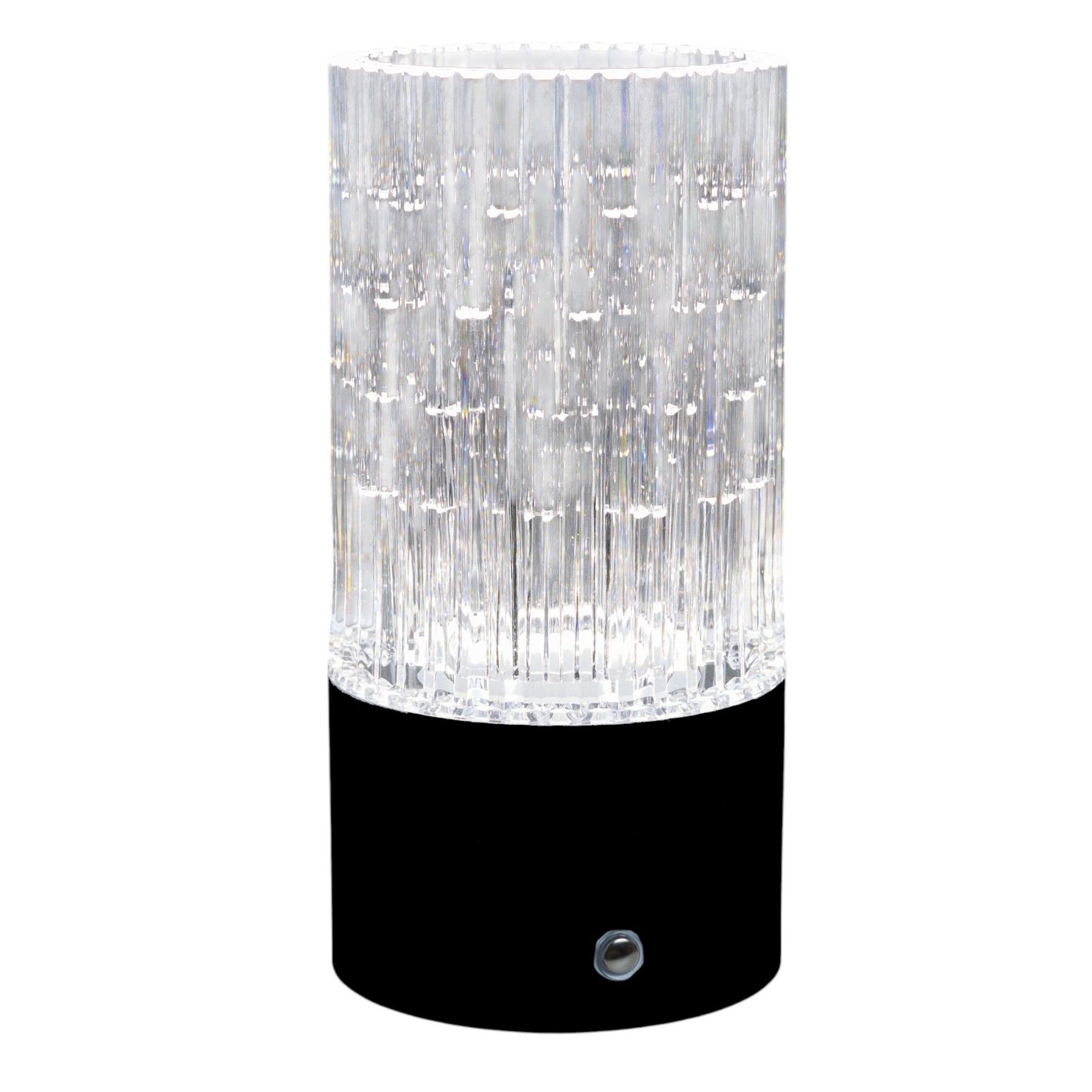 Realizzata in plexiglass di alta qualità, la lampada ha dimensioni di d.9 x h. 18 cm circa ed è dotata di una base nera che si adatta perfettamente a qualsiasi tipo di arredamento. La sua forma elegante e moderna la rende un'opzione versatile e adatta a qualsiasi stile di matrimonio.