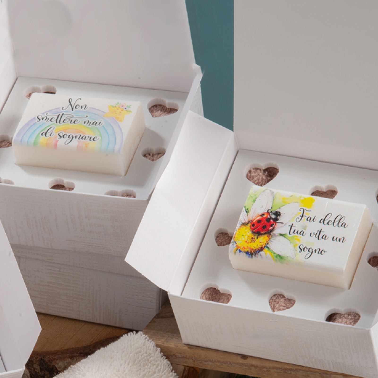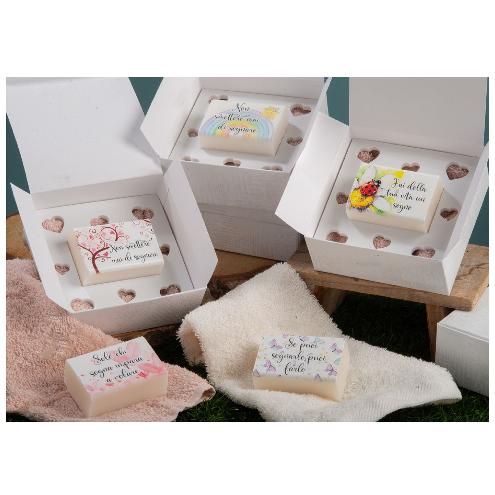 Nel nostro negozio troverai il perfetto regalo per ogni occasione speciale. Il Set collezione "Clean" comprende un sapone con incarto decorato con fiori e una frase delicata, un portasapone traforato con cuori e un piccolo asciugamano colore casuale. Ogni pezzo è curato nei minimi dettagli per garantire una bomboniera unica e speciale.