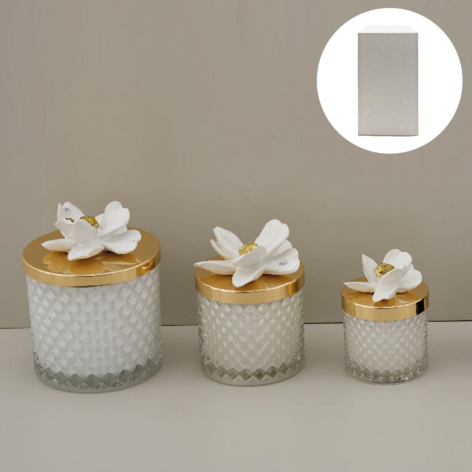 Sorprendi i tuoi ospiti con un dono elegante e ricco di significato. La nostra splendida candela in vetro lavorato, impreziosita da un raffinato coperchio dorato decorato con un delicato fiore bianco, è il regalo ideale per celebrare momenti speciali. Un oggetto dal design unico, pensato per aggiungere un tocco di stile alla tua cerimonia.
