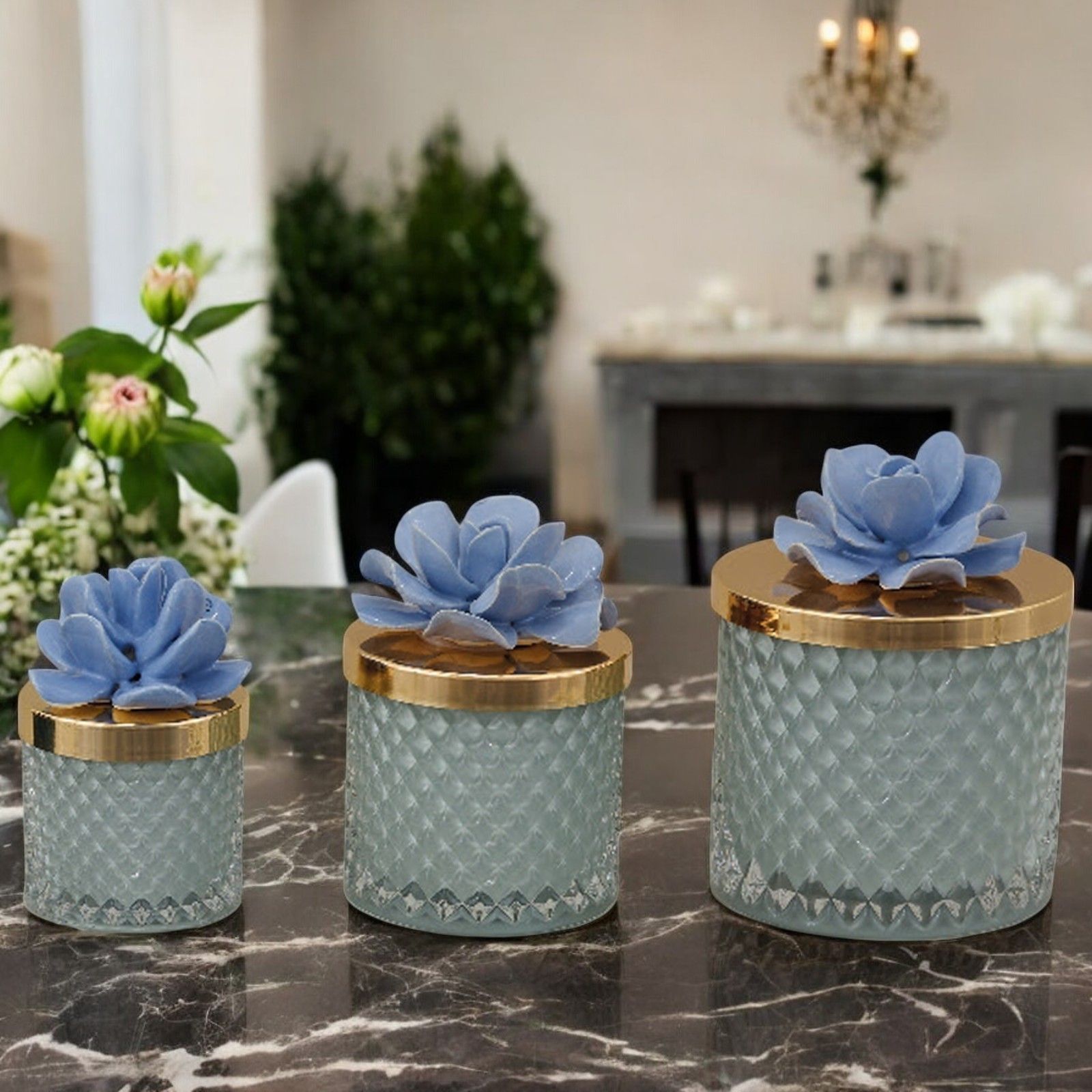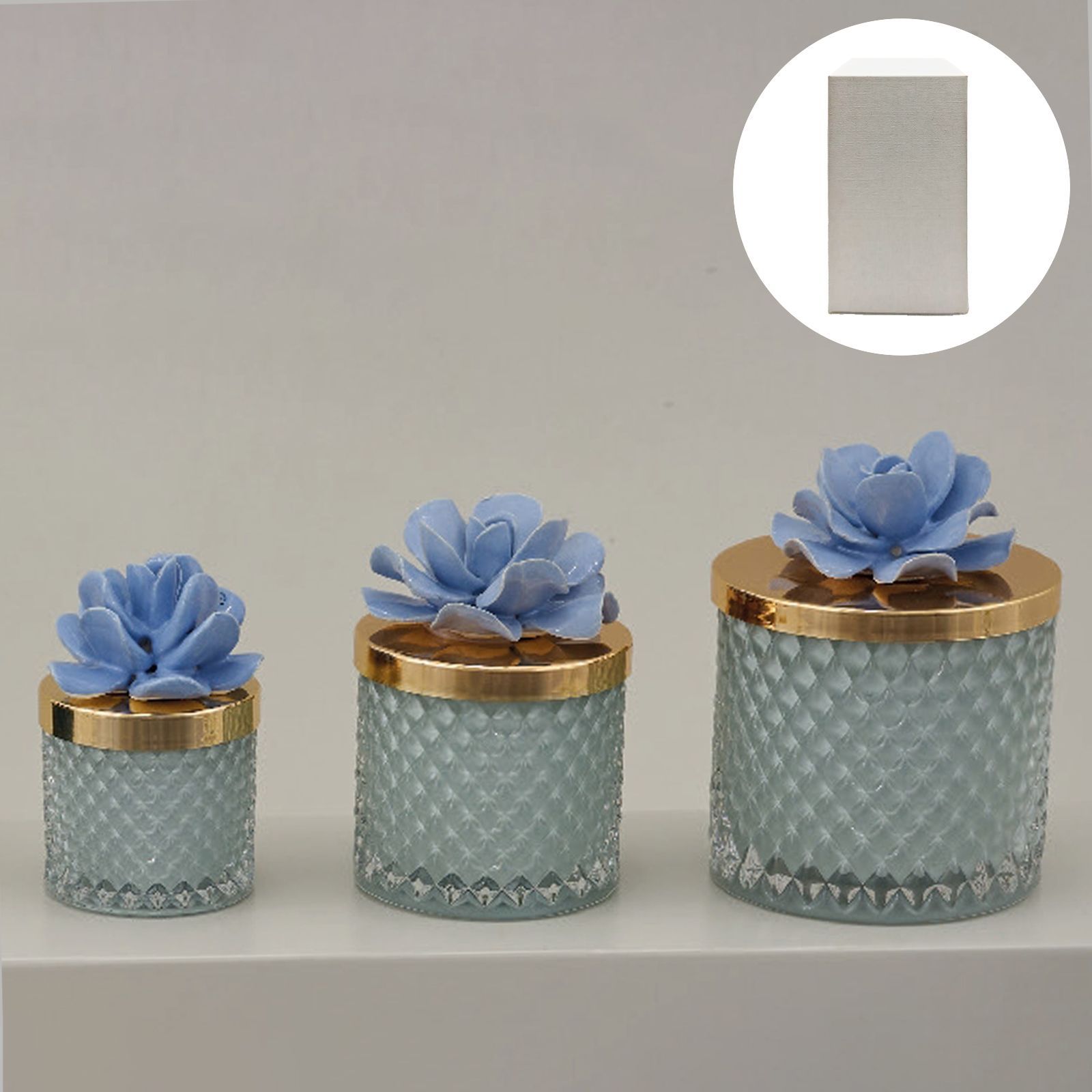 Nella vasta gamma di bomboniere matrimonio e anniversario, questa candela in vetro effetto diamante con coperchio con fiore si distingue per la sua eleganza e originalità. Realizzata in vetro di alta qualità e decorata con un coperchio color oro e un fiore color avion con centrale color oro, questa bomboniera è disponibile in tre diverse dimensioni per soddisfare ogni esigenza: