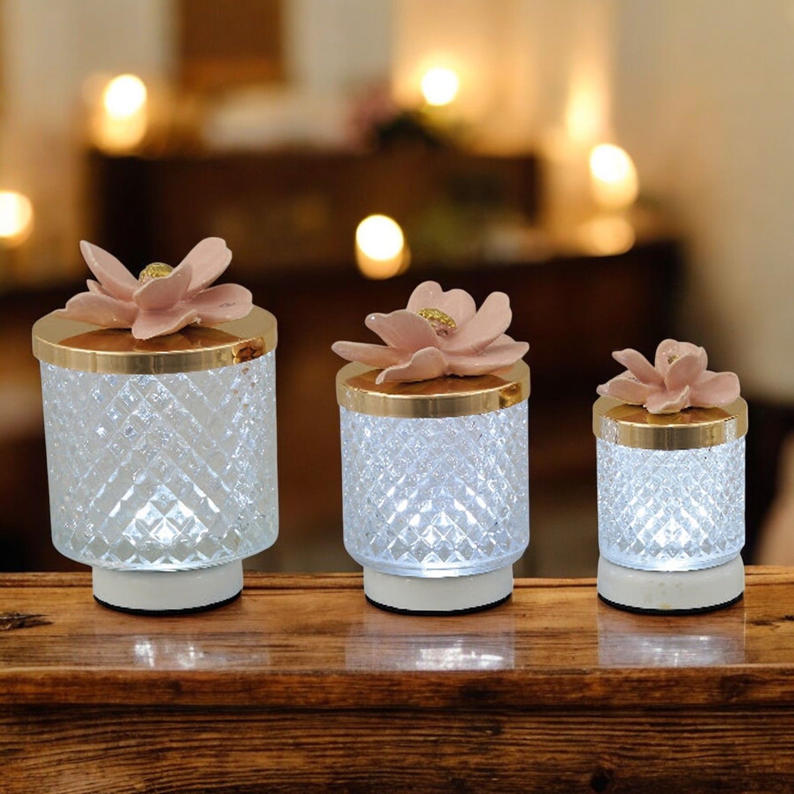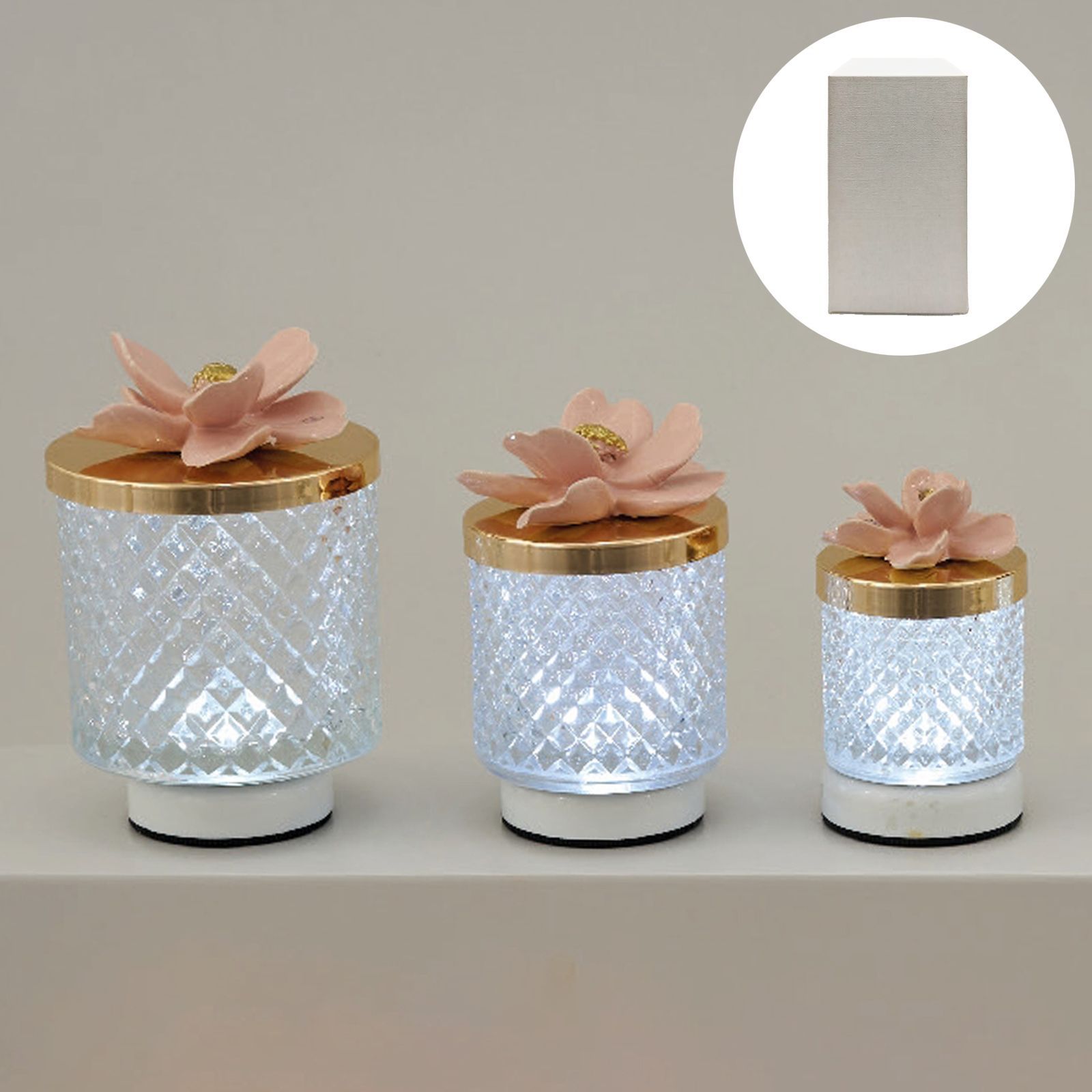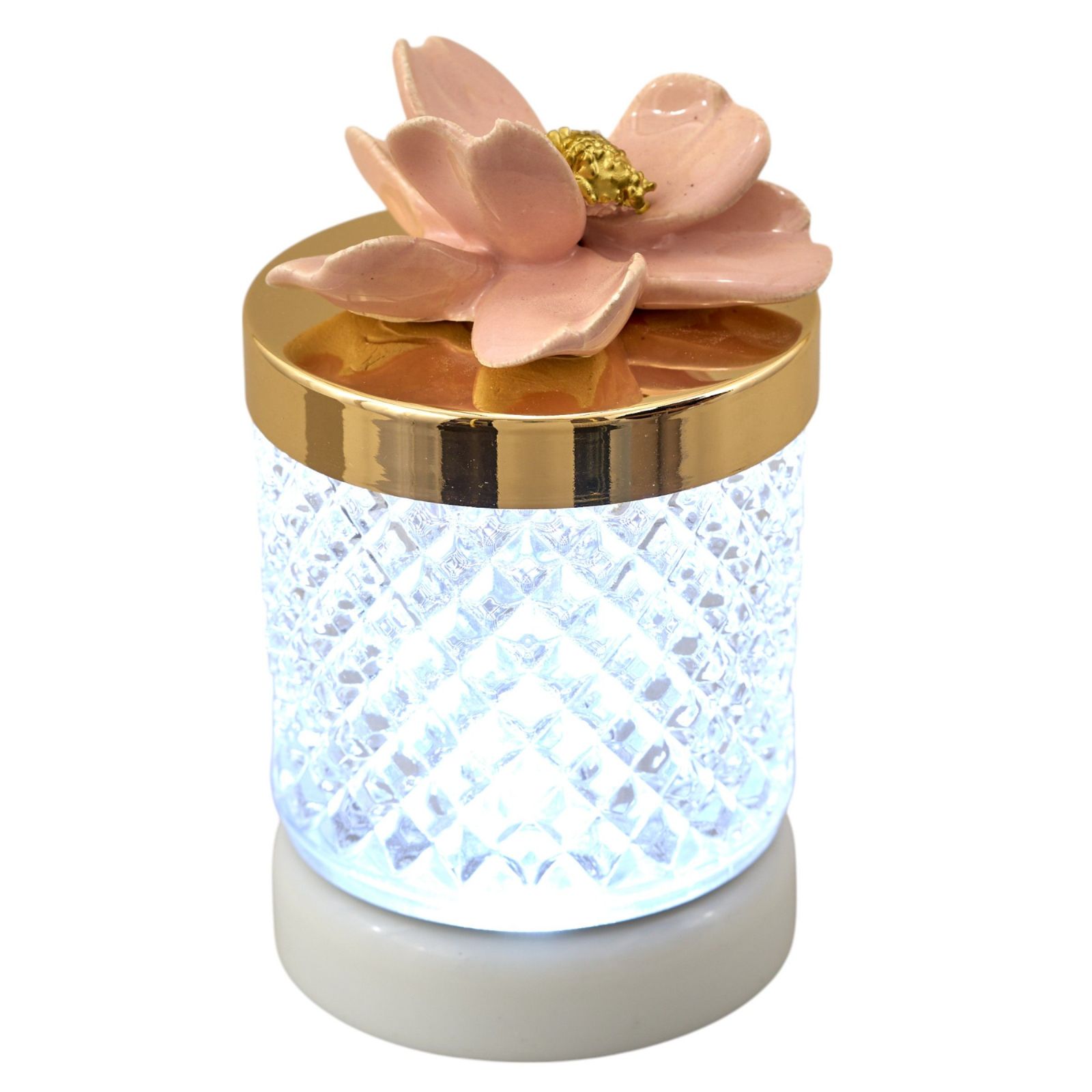Porta un tocco di classe ai tuoi eventi con una bomboniera raffinata ed esclusiva. La lampada effetto diamante, con coperchio dorato e fiore color cipria arricchito da un centrale in oro, è il regalo ideale per celebrare momenti unici come comunioni, cresime, matrimoni e anniversari. Questo oggetto elegante saprà conquistare il cuore di ogni invitato, rendendo speciale ogni cerimonia.
