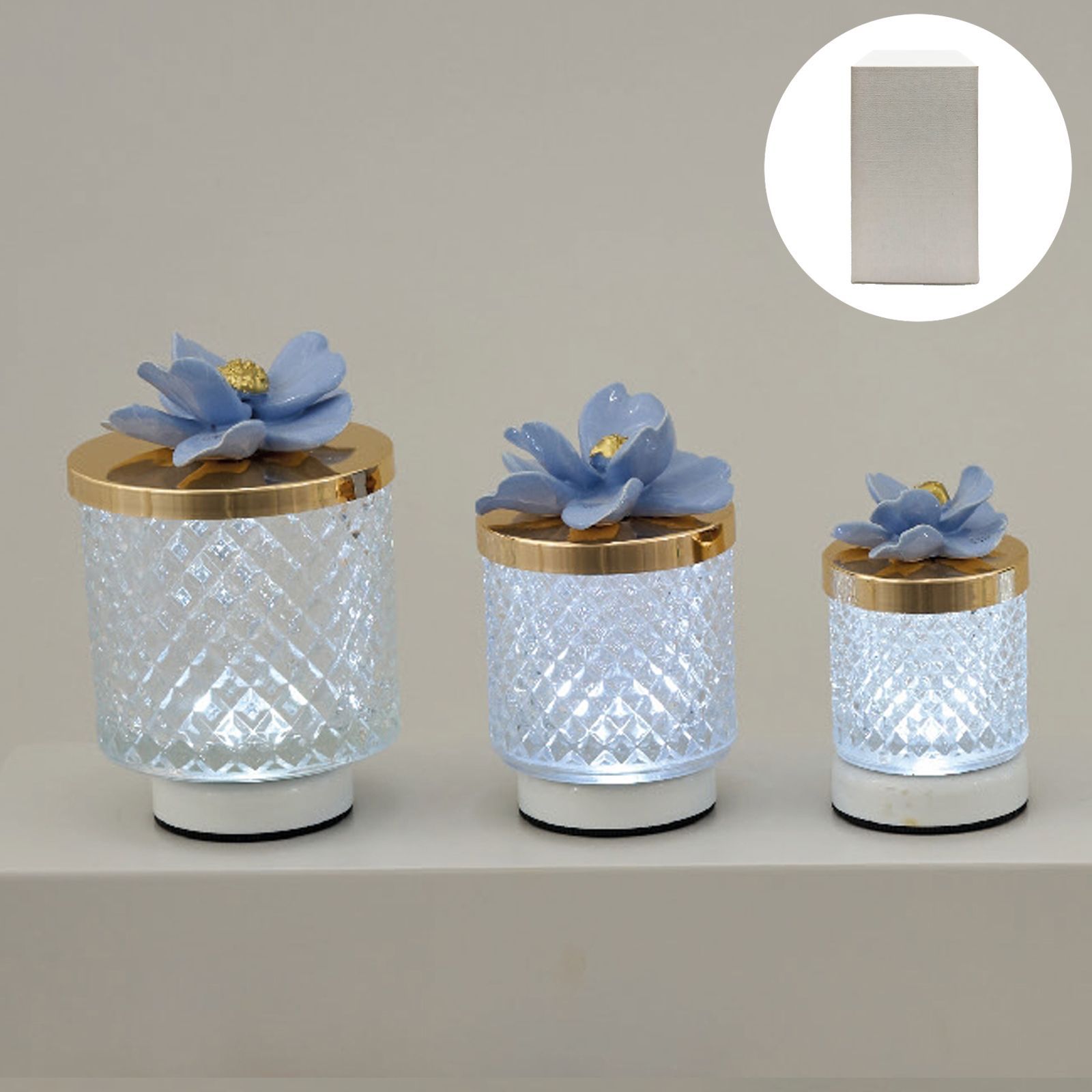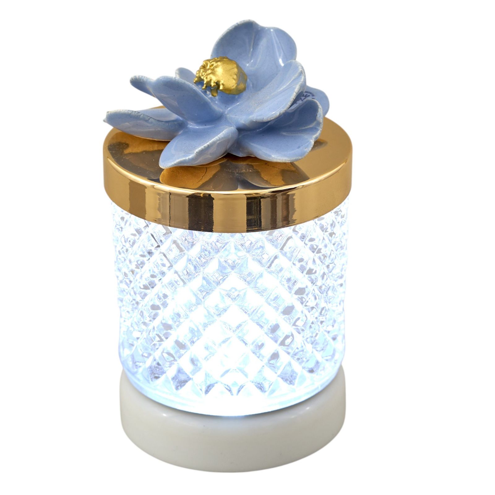 Il fiore color avion, simbolo di calma e armonia, si abbina perfettamente al coperchio dorato, creando un oggetto decorativo di grande classe. Questa bomboniera rappresenta un'idea regalo originale e utile, pensata per valorizzare ogni celebrazione con un tocco di raffinatezza.