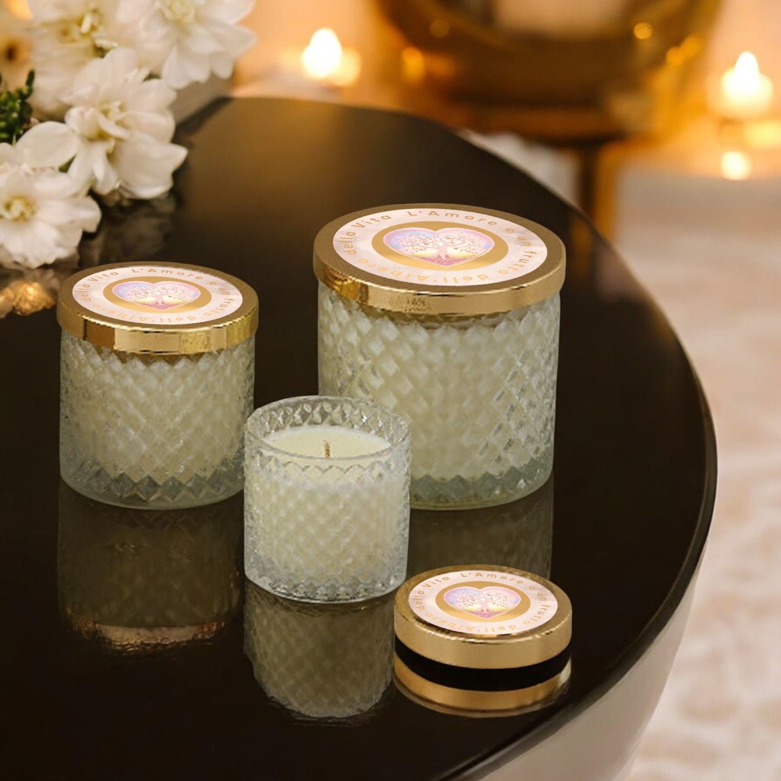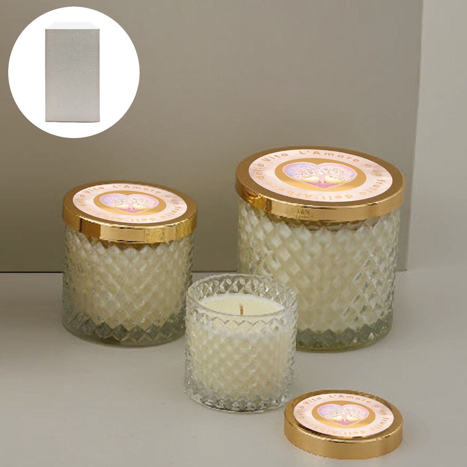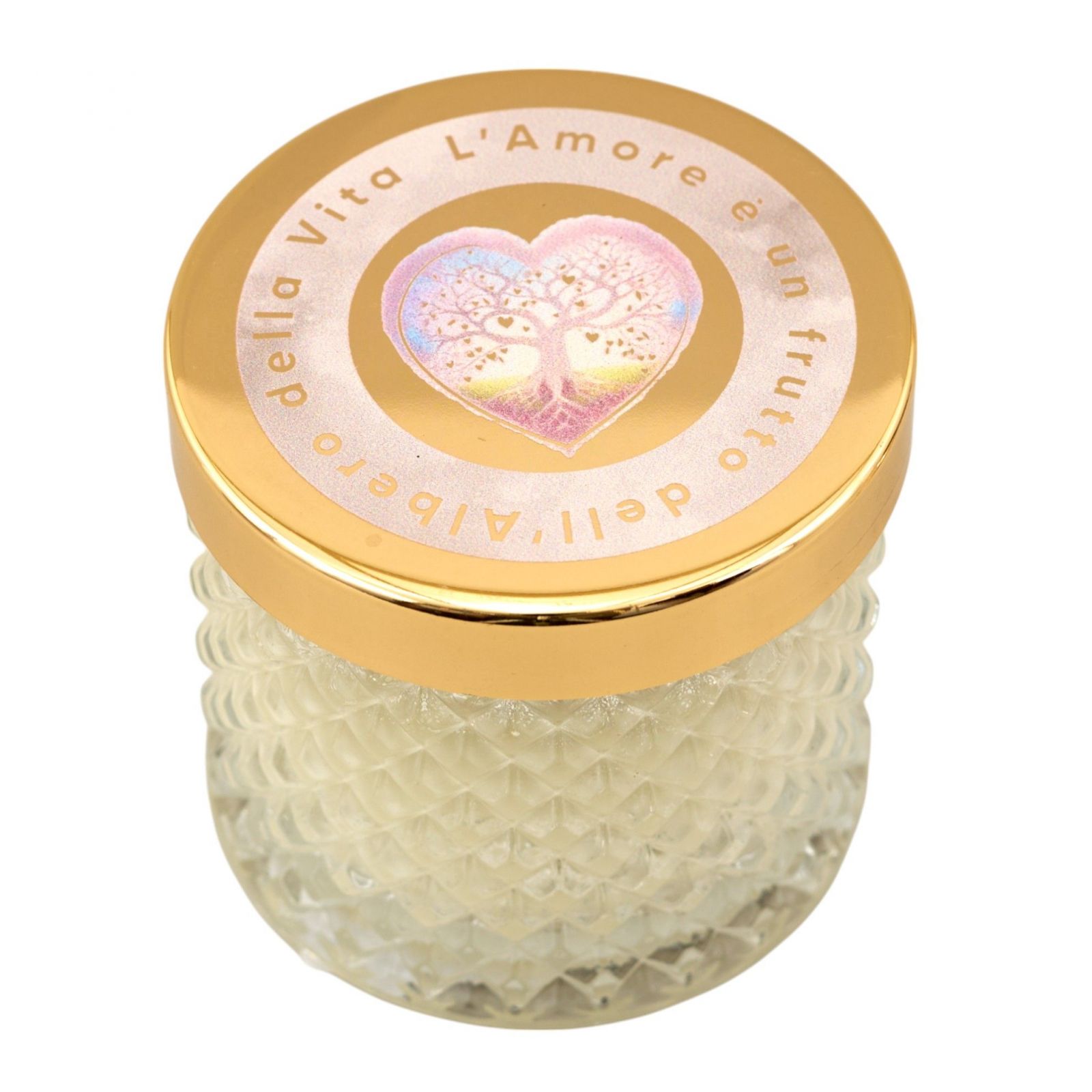 Impreziosisci le tue celebrazioni con una bomboniera unica e dal forte significato. Il vasetto effetto diamante, con coperchio dorato e decorato con un cuore e l'albero della vita, arricchito dalla scritta "L'amore è un frutto dell'albero della vita", è un regalo perfetto per matrimoni, anniversari e promesse. All'interno troverai una candela che emana una luce calda e romantica, perfetta per creare un'atmosfera speciale.