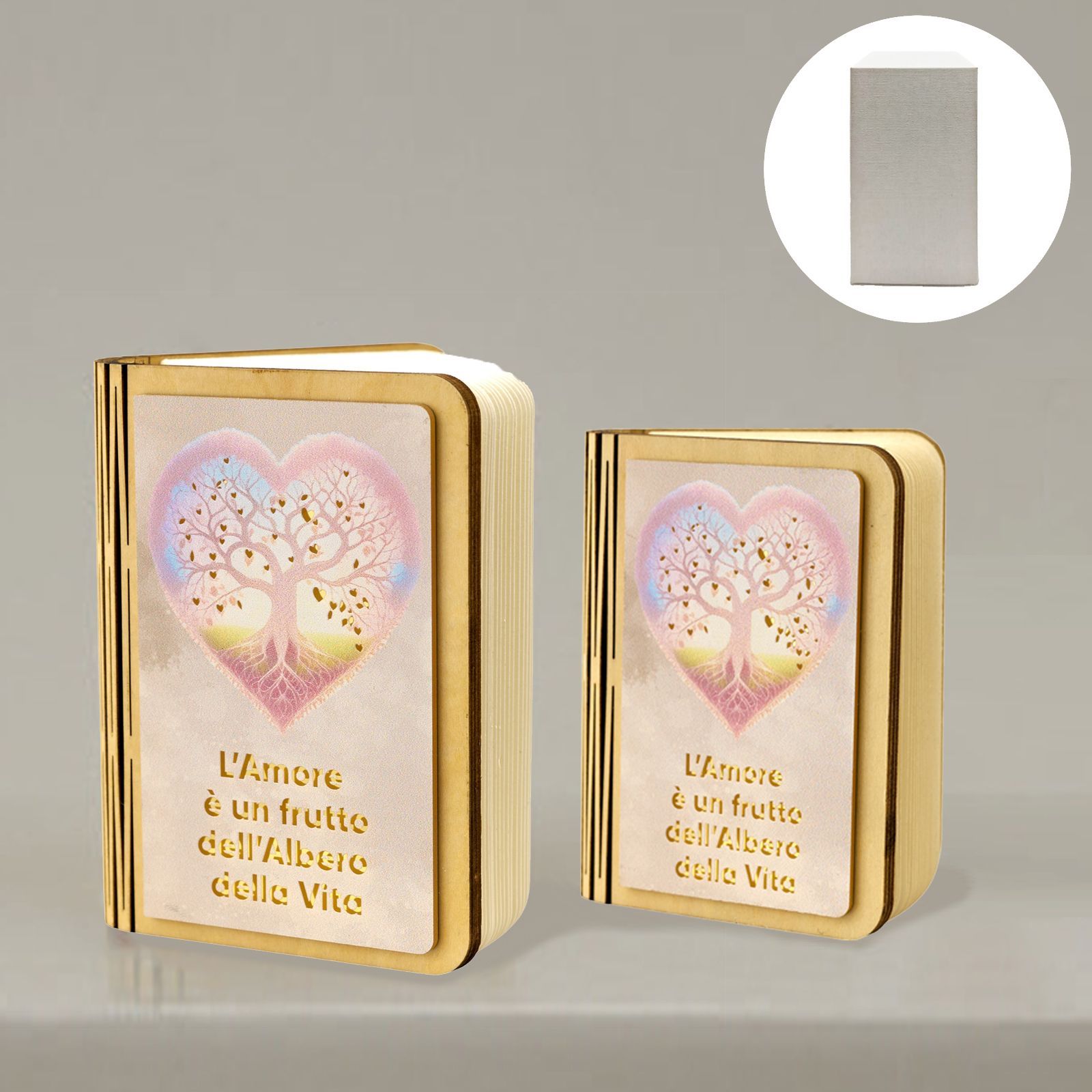 Questa elegante lampada a forma di libro con copertina decorata con un cuore albero della vita e la frase "L'amore è un ramo dell'albero della vita" è la scelta perfetta per celebrare eventi speciali come comunione, cresima, matrimonio o anniversario. Le dimensioni disponibili sono due: Standard (10 x 8 x 3 cm circa) e Grande (12x9x3 cm circa), per adattarsi alle esigenze di ogni occasione.