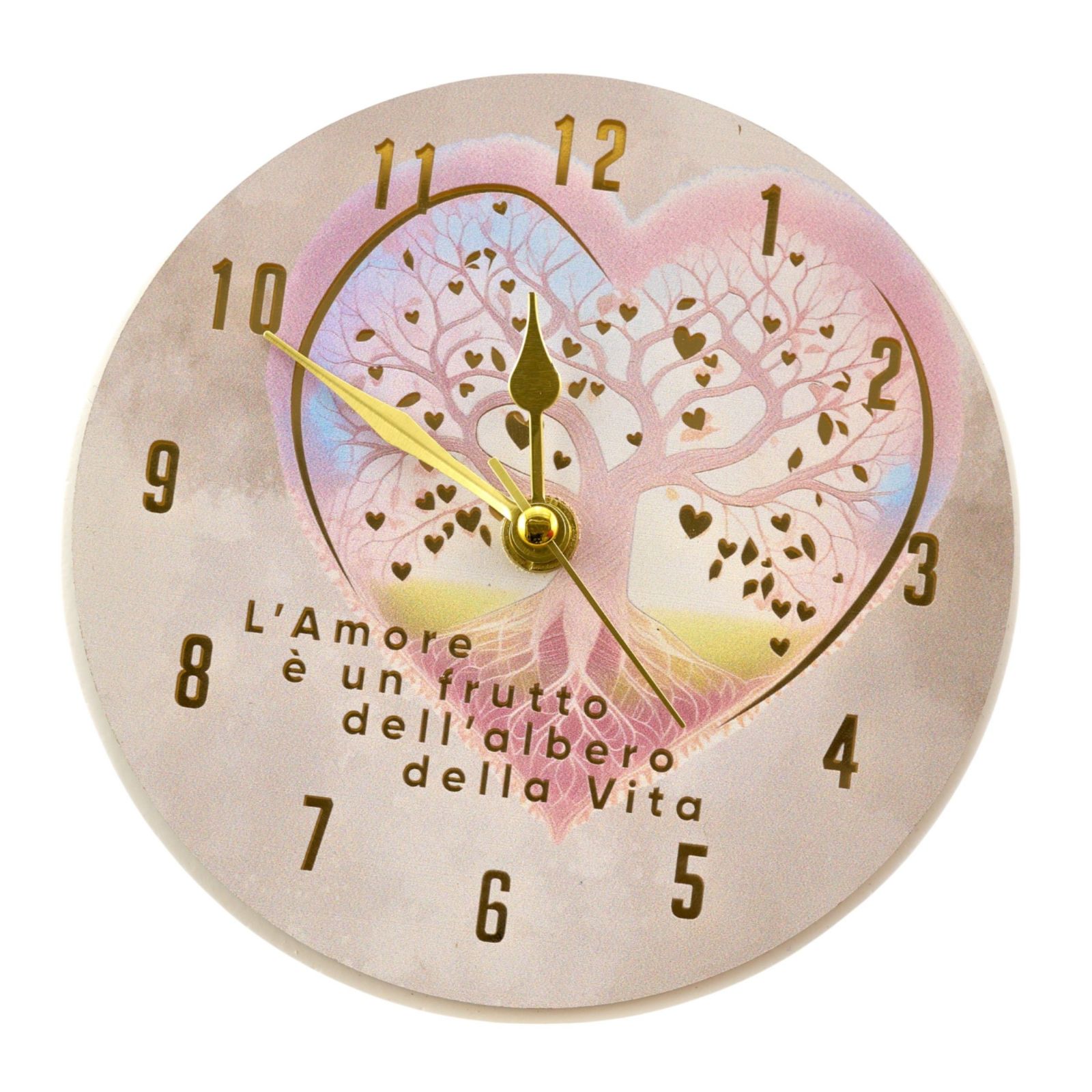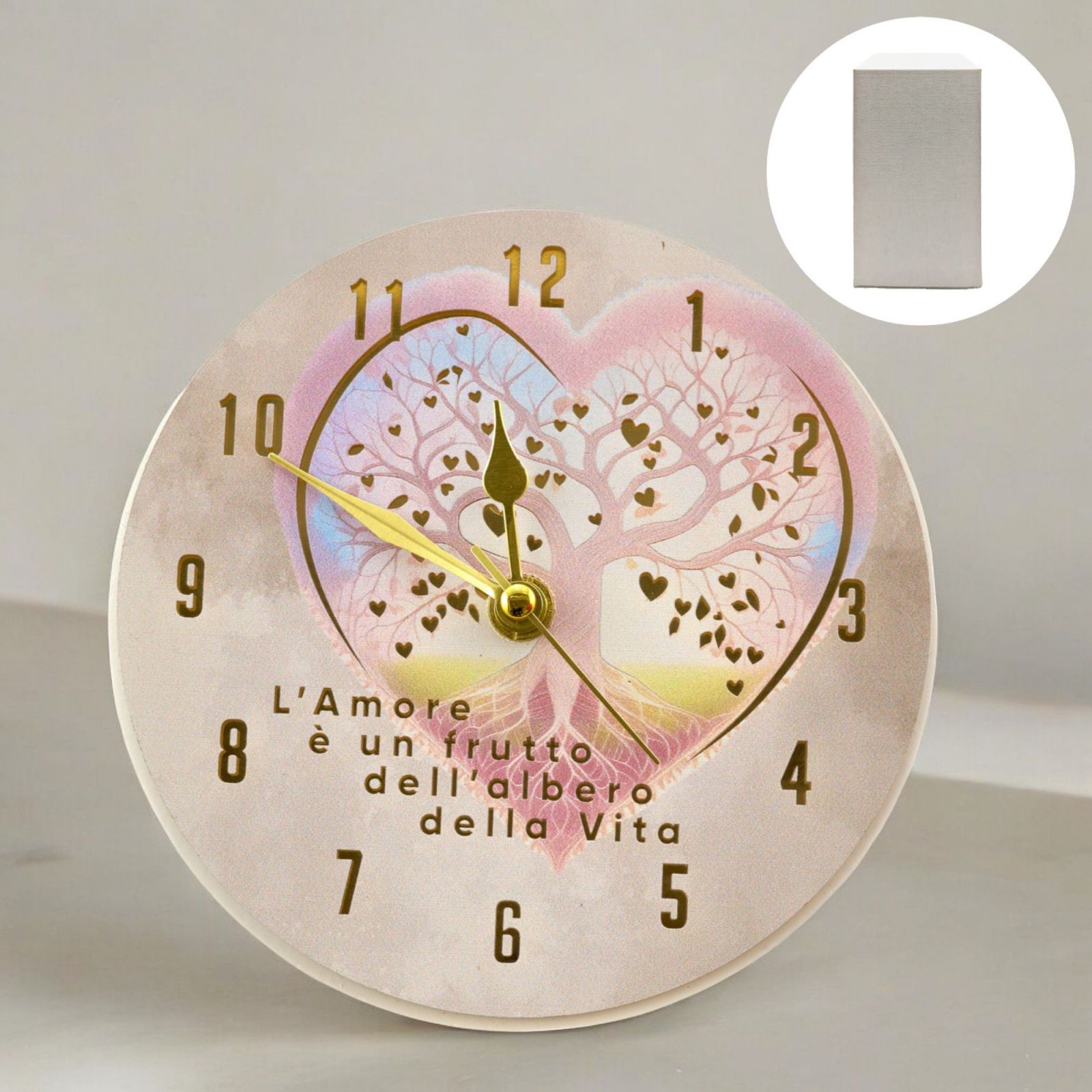 In occasione della tua cerimonia, regala un tocco di eleganza e romanticismo con questa bomboniera unica nel suo genere. L'orologio tondo con cuore centrale rappresenta l'amore come frutto dell'albero della vita, simbolo di prosperità e eternità.