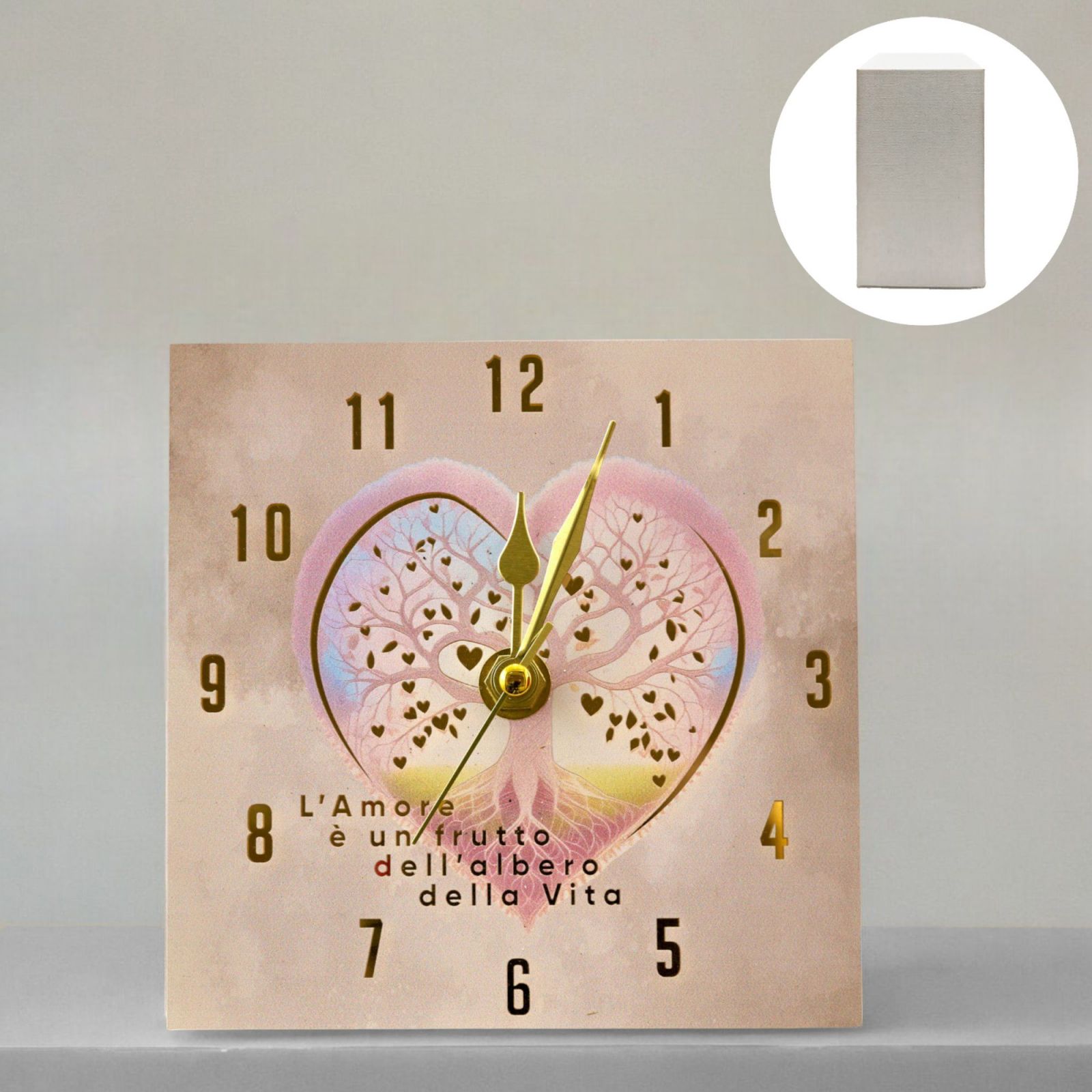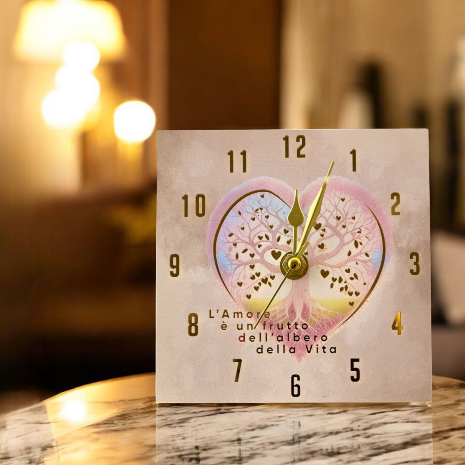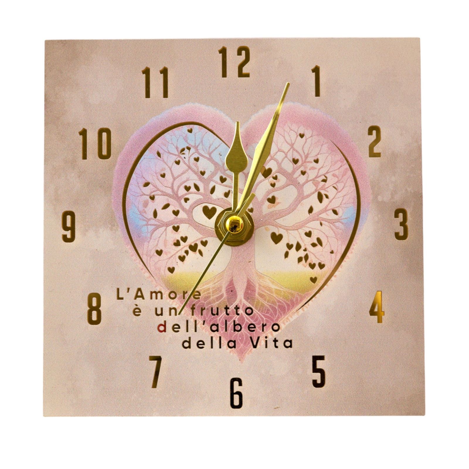 L'orologio è decorato con un cuore centrale e un albero della vita, accompagnato dalla frase "L'amore è un frutto dell'albero della vita". L'albero della vita è un simbolo antico e universale che rappresenta l'interconnessione di tutta la vita sulla Terra. In molte culture, questo albero simboleggia la crescita, la forza, la saggezza e l'eternità. Le sue radici affondano profondamente nel terreno, mentre i rami si estendono verso il cielo, creando un equilibrio tra il mondo materiale e quello spirituale. Questo rende l'albero della vita un simbolo perfetto di prosperità, amore e continuità, che si riflette nel significato profondo di questo orologio.