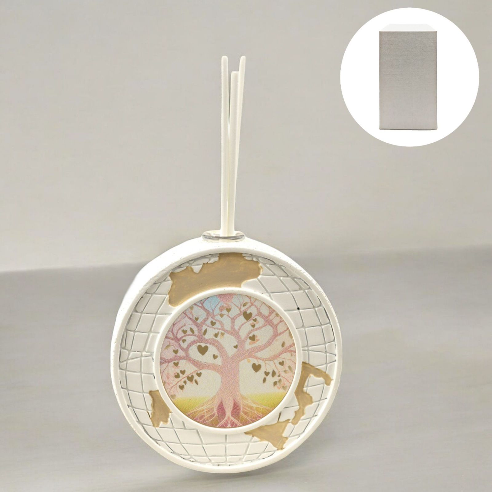 Questa bomboniera è il regalo perfetto per eventi speciali come comunione, cresima, matrimonio e anniversario. Realizzata in resina di alta qualità, è decorata con l'albero della vita e foglie a forma di cuore, simboli di amore e prosperità.