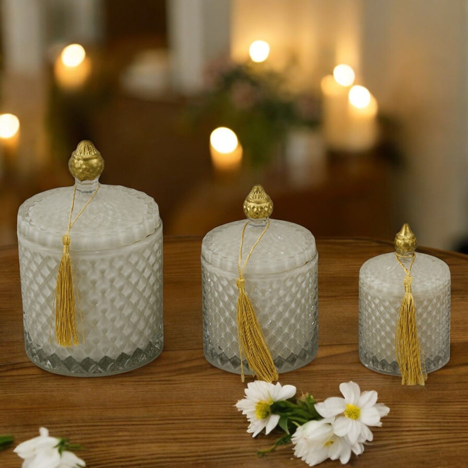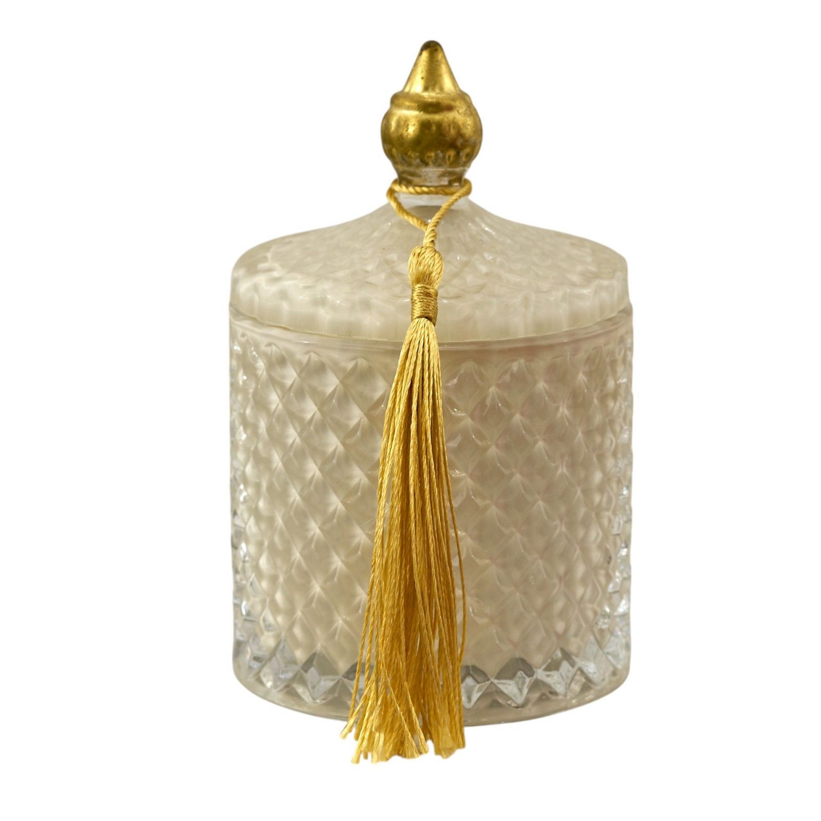 Eleganza senza tempo per un'occasione speciale: la candela effetto diamante con coperchio, decorata con dettagli in oro e una raffinatissima nappina oro. Perfetta come bomboniera matrimonio, questa candela sarà un regalo esclusivo che farà brillare il vostro evento, regalando un ricordo unico e indimenticabile.