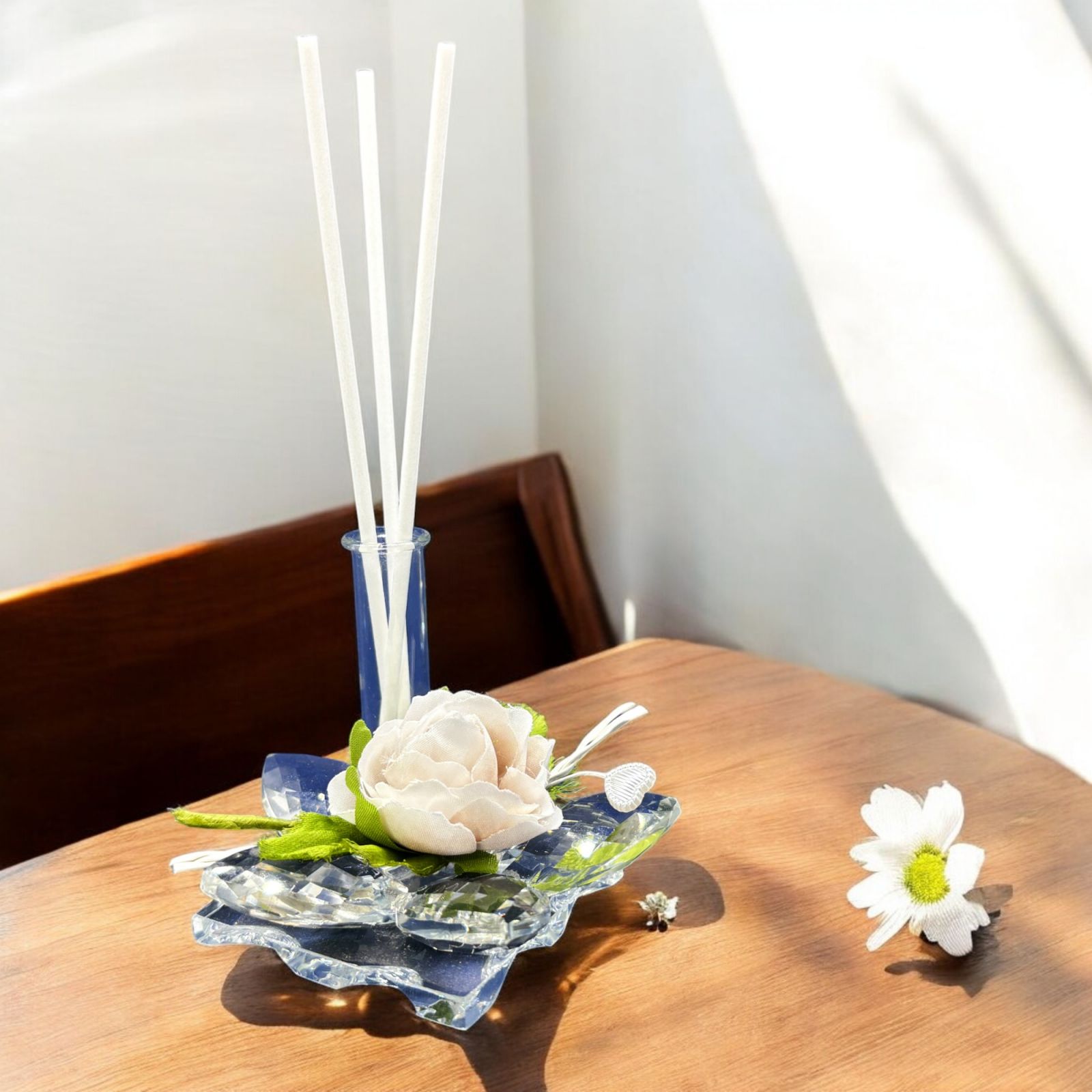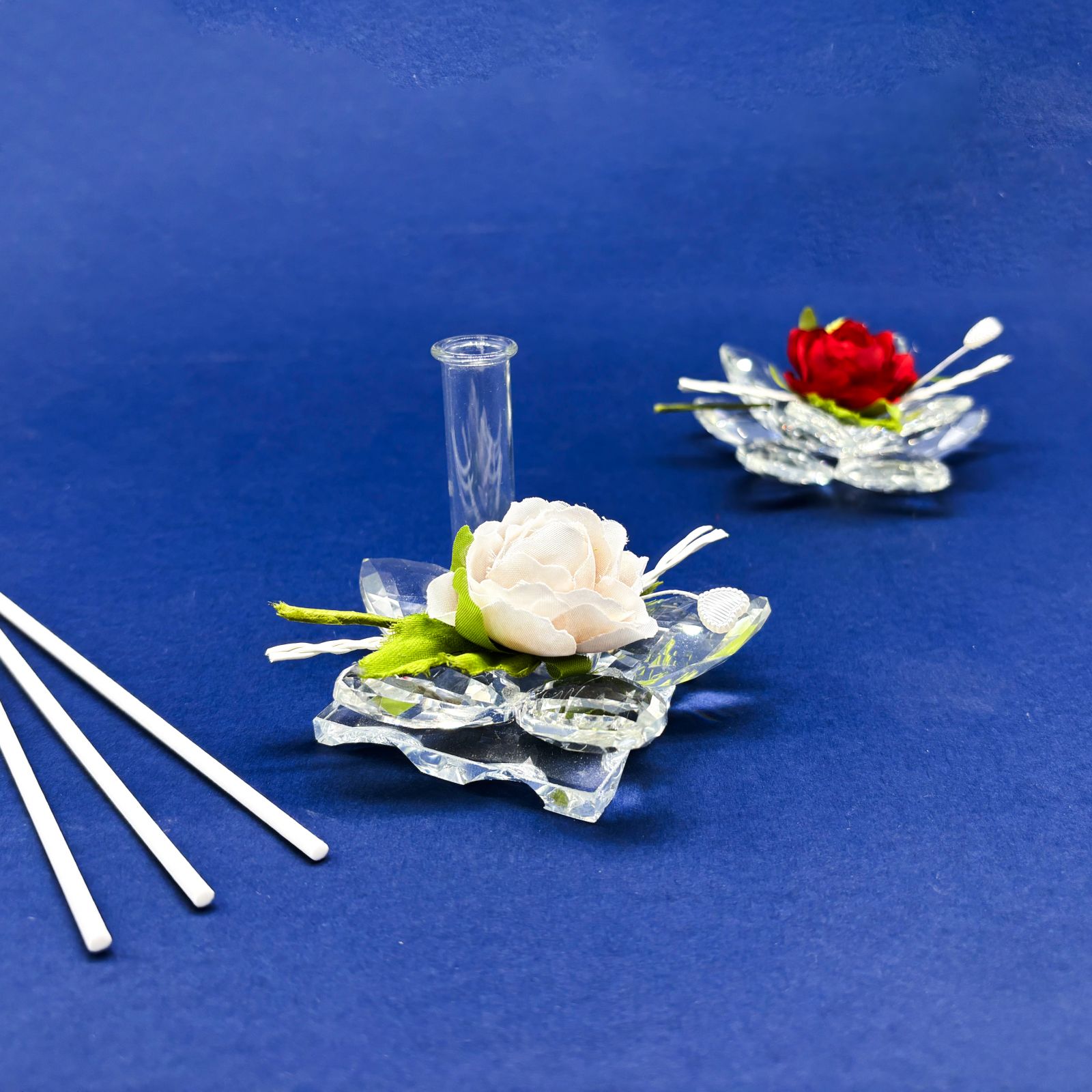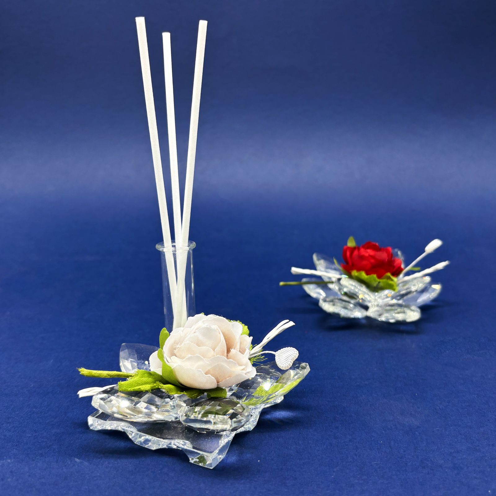 Realizzata in cristallo di alta qualità, questa bomboniera è composta da un profumatore d'ambiente con una fiala portaprofumo e una rosa con 5 petali. All'interno della rosa si trova una rosellina finta con foglie, una trecciolina e un cuoricino, che aggiungono un tocco di eleganza e romanticismo.