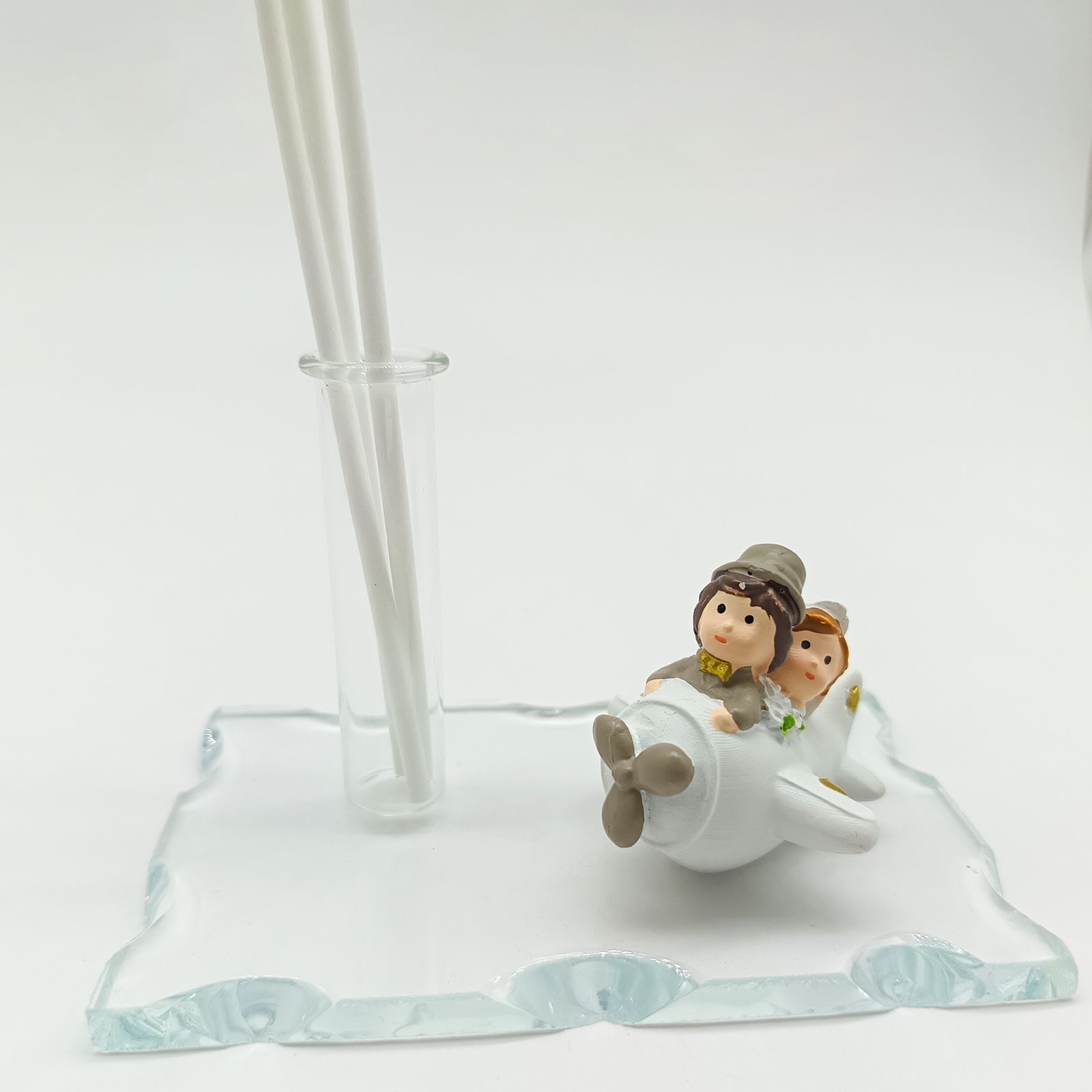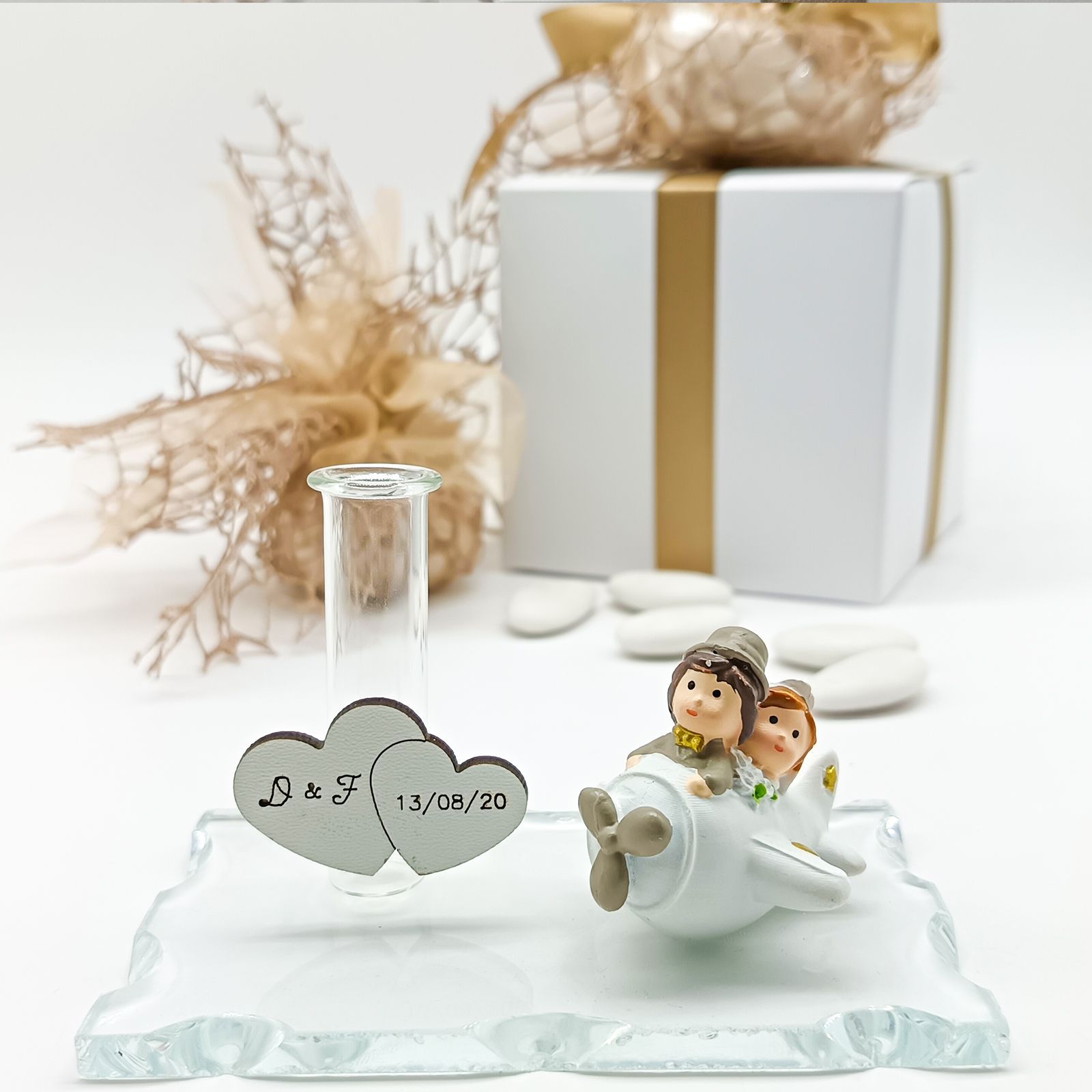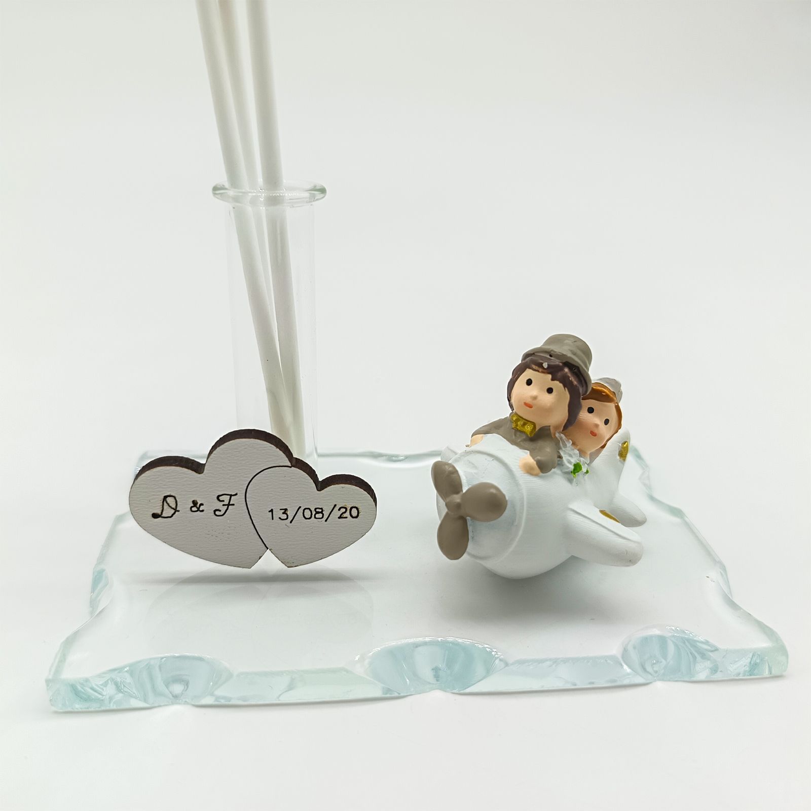 Un’elegante bomboniera personalizzabile con diffusore di essenze e base in vetro, ideale per matrimoni, anniversari e promesse. La statuina degli sposi su un aereo richiama il tema del viaggio, mentre la fiala può diventare portapenne o vasetto monofiore, rendendo la bomboniera pratica e originale.