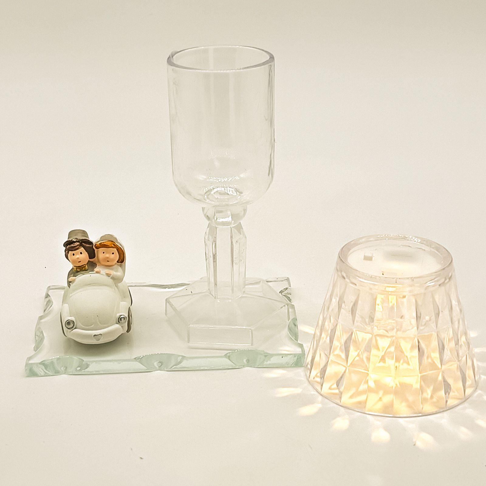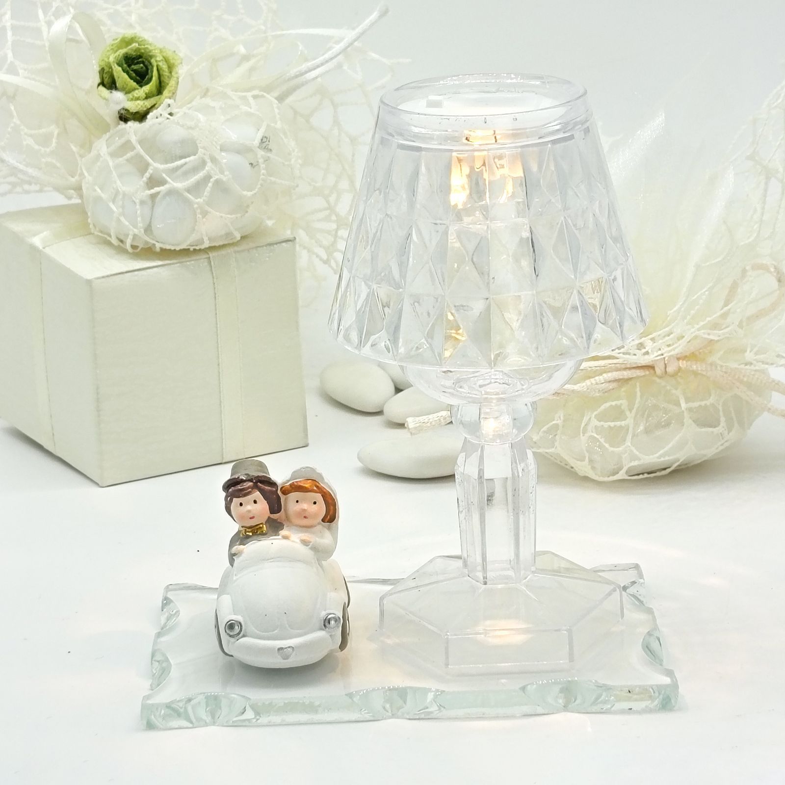 Nel giorno più importante della vostra vita, regalate ai vostri ospiti un ricordo speciale: la bomboniera con lumetto in plexiglass su base in vetro e statuina degli sposi in macchina. Un oggetto unico, simbolo di amore e felicità, perfetto per matrimoni, anniversari o promesse d’amore.