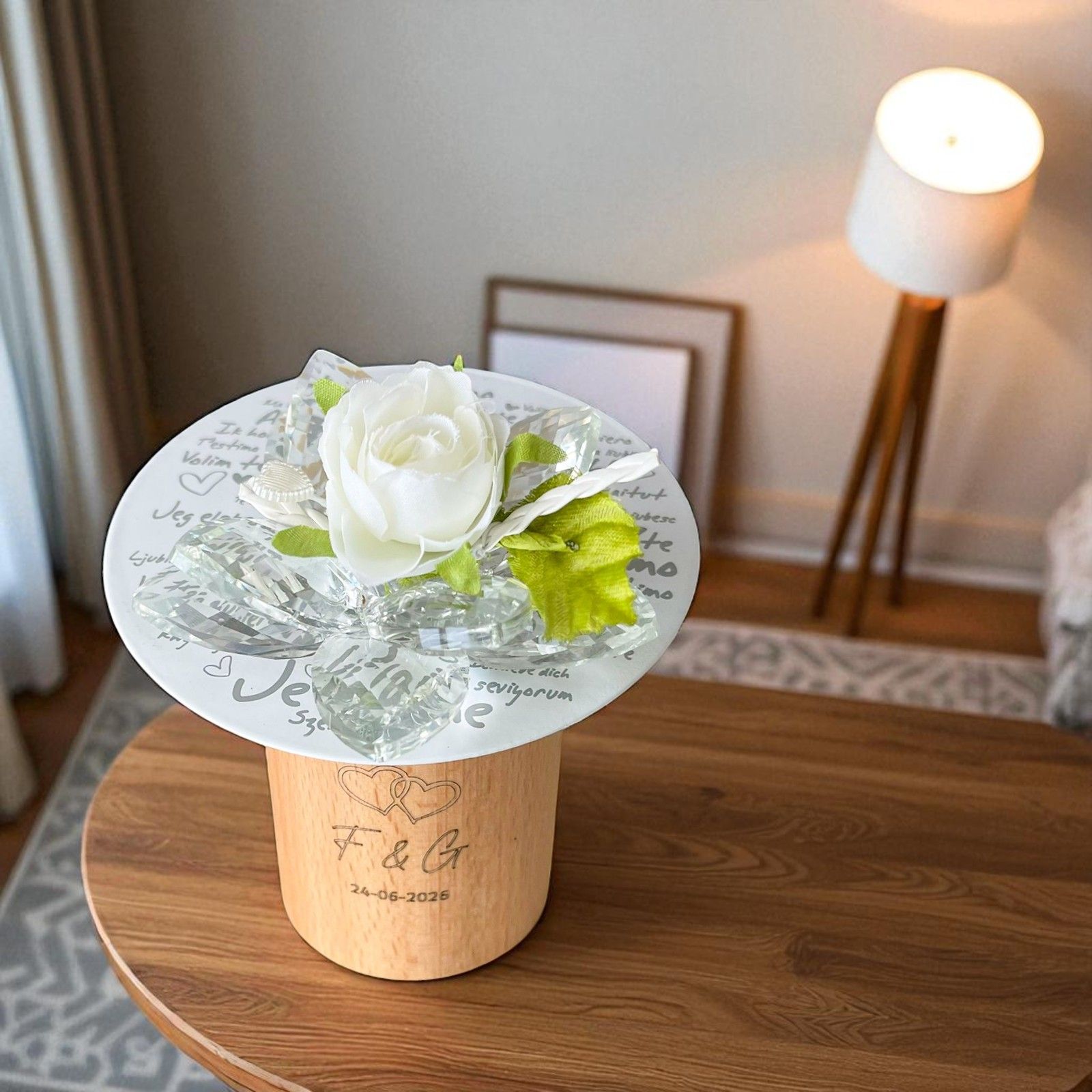 Realizzata con un abbinamento di legno e metallo, può essere personalizzata con nomi e data dell’evento. Sul metallo è incisa la frase “Ti amo” in diverse lingue, per un tocco romantico e internazionale. Completano il design i petali di cristallo e la rosa bianca. Dimensioni: circa 10 x 11 cm.