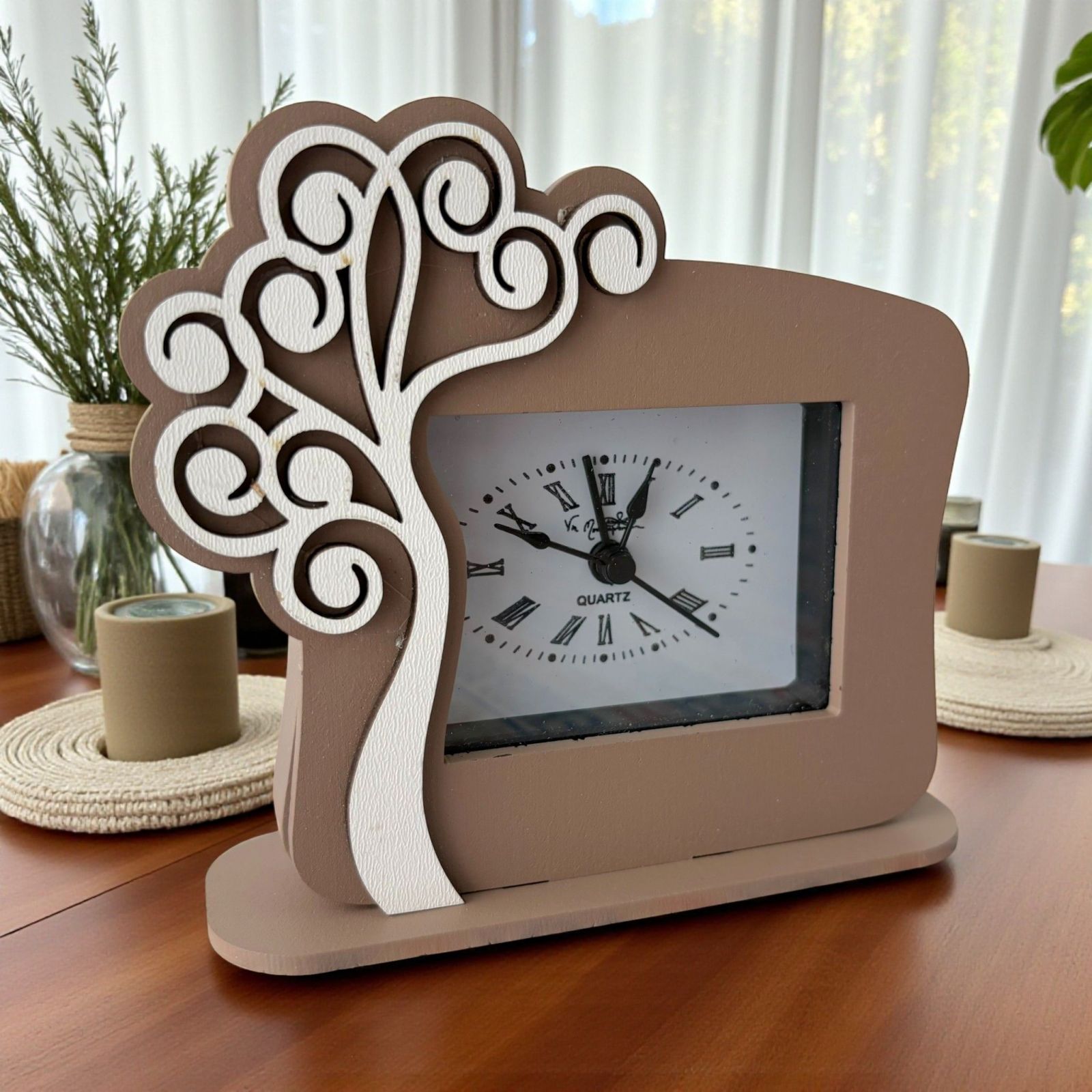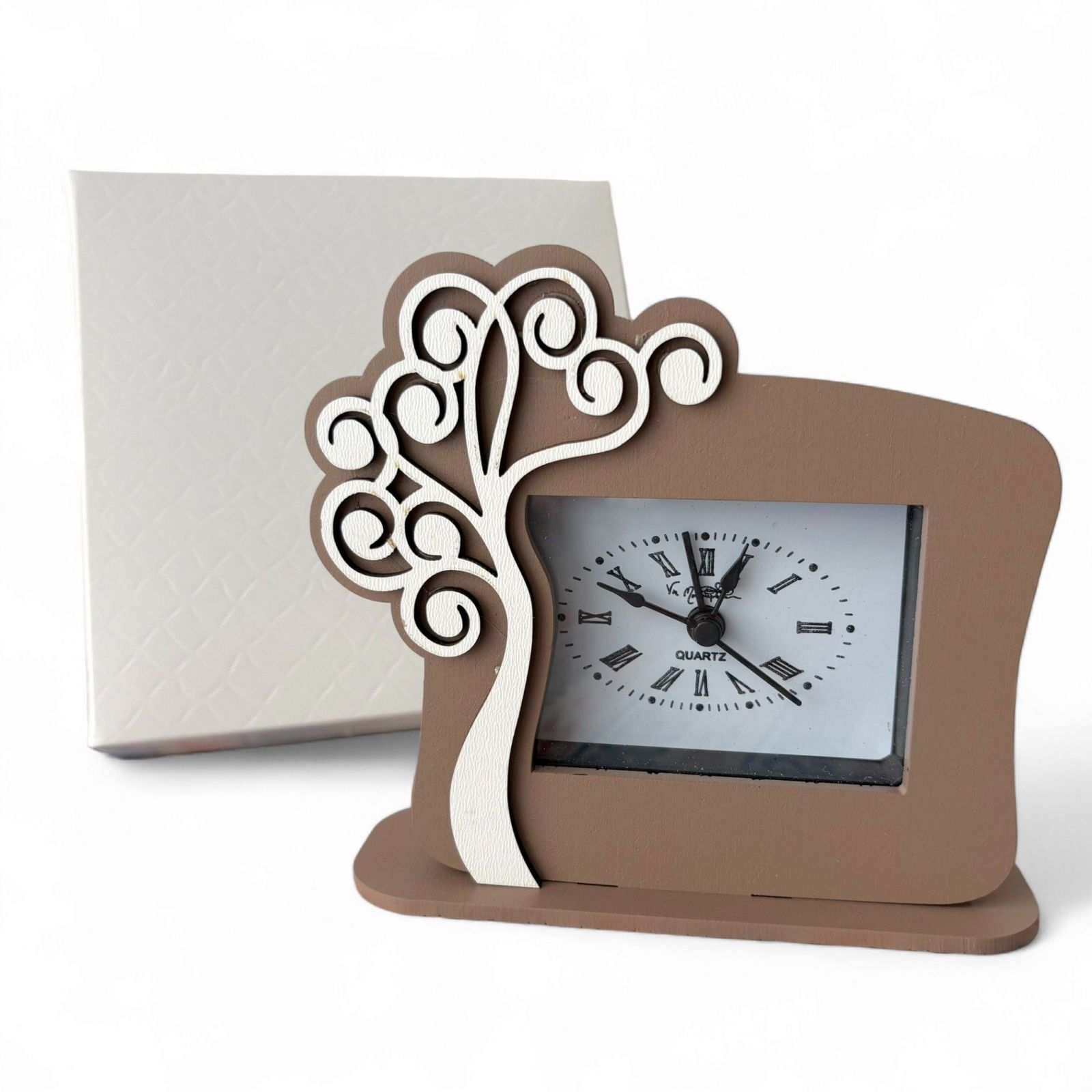 Realizzato in legno di alta qualità, questo orologio dalle tonalità tortora e dal design raffinato si adatta a qualsiasi stile di decorazione, aggiungendo un tocco di classe e originalità. È una delle nostre idee bomboniere matrimonio più apprezzate, ideale per chi cerca bomboniere matrimonio utili ma anche esteticamente piacevoli. Ogni pezzo viene fornito con una scatola regalo in omaggio, pronta per sorprendere i vostri invitati.
