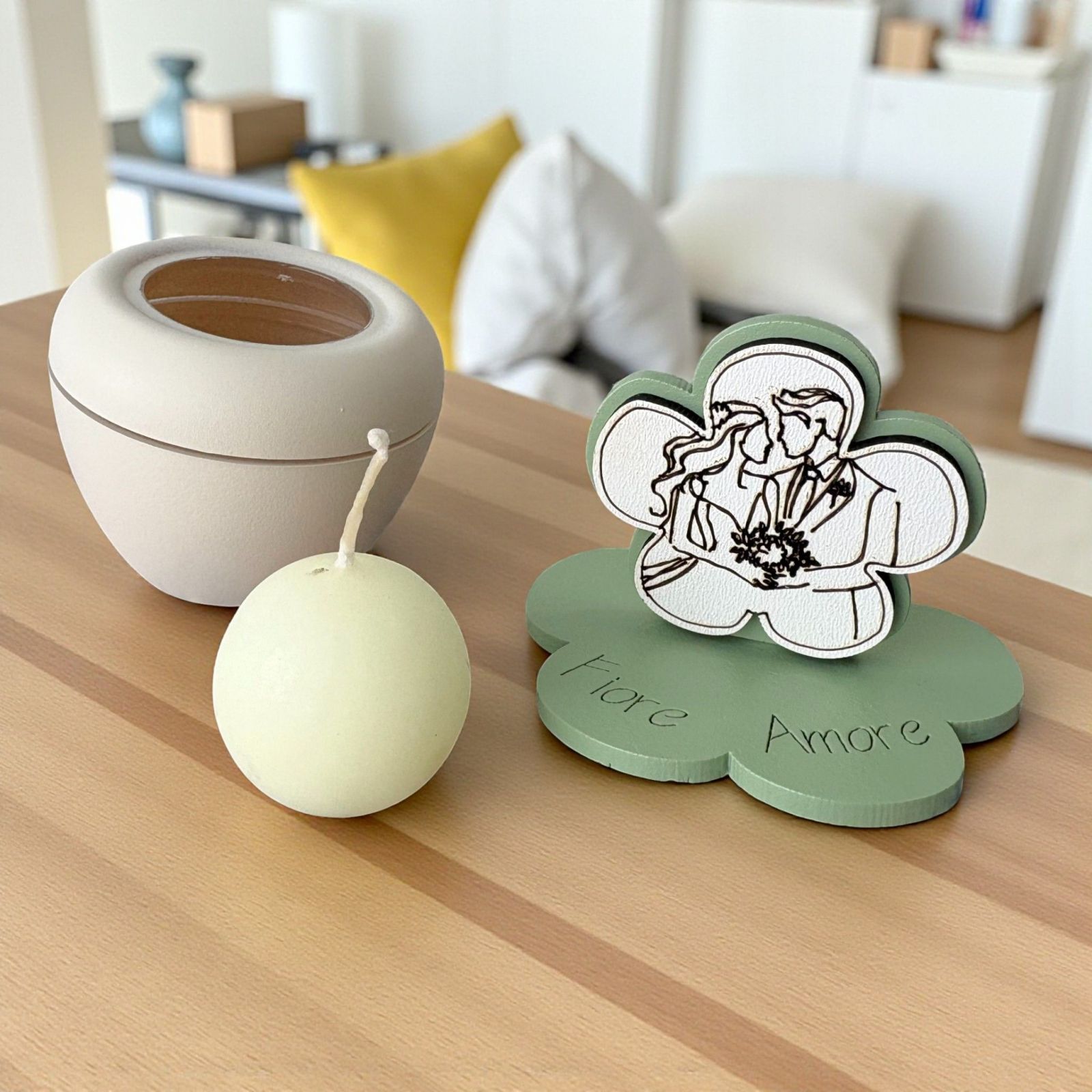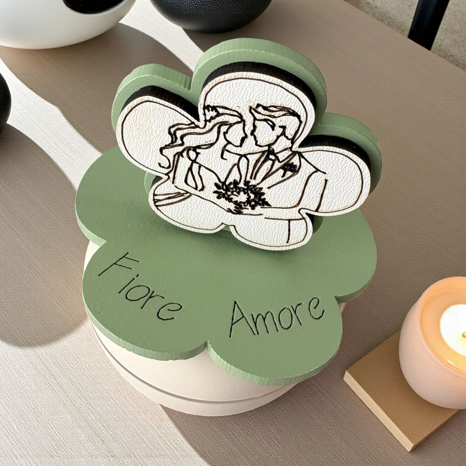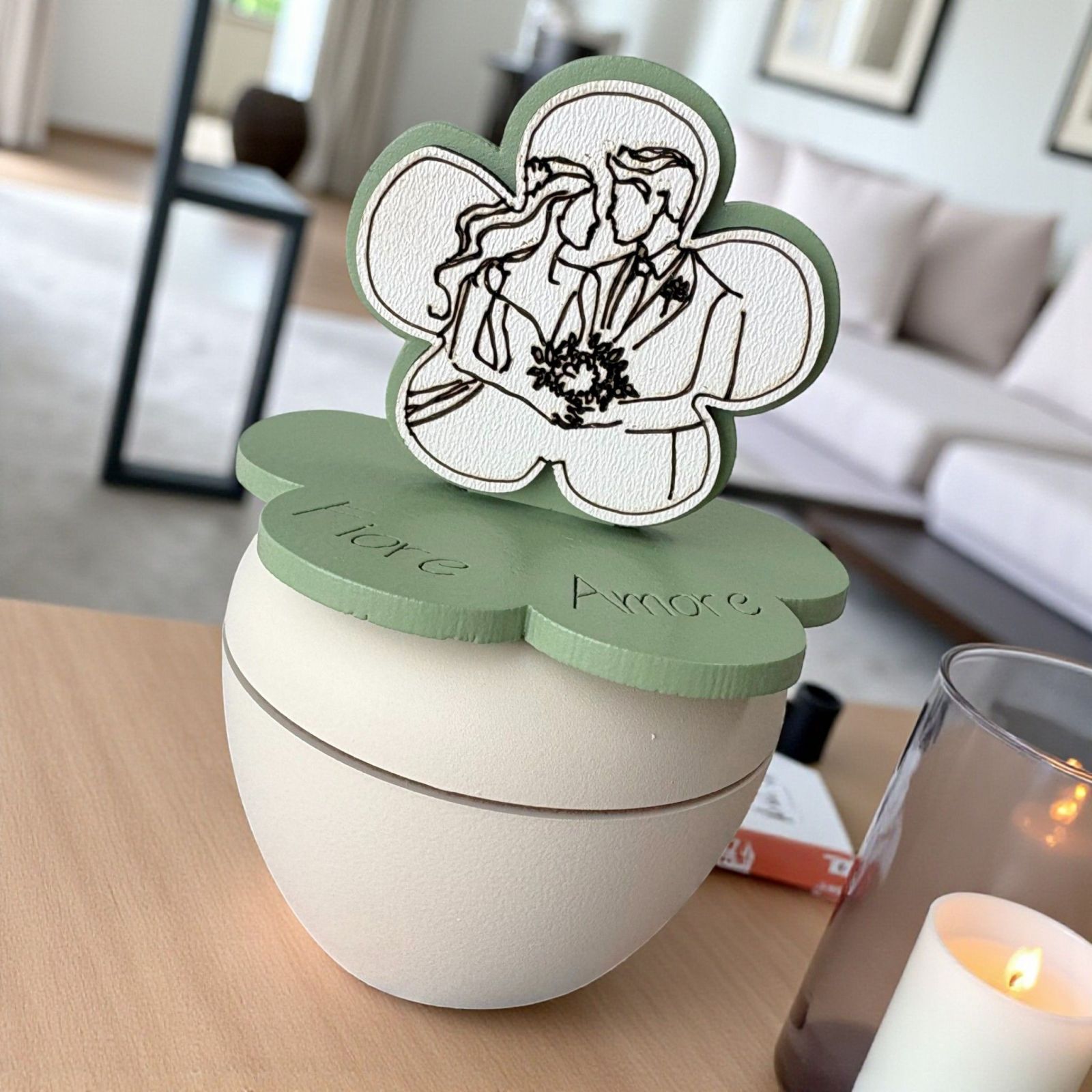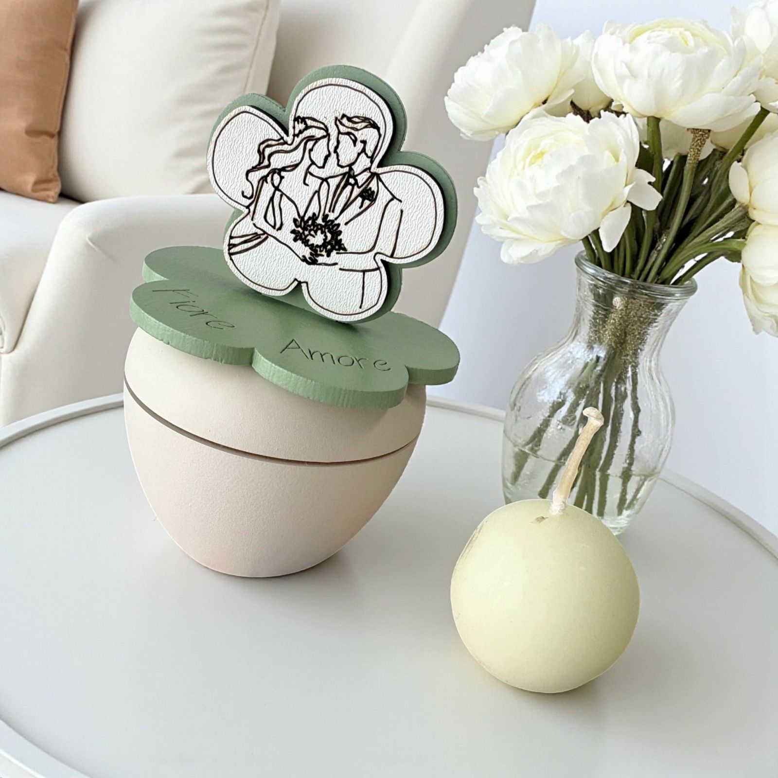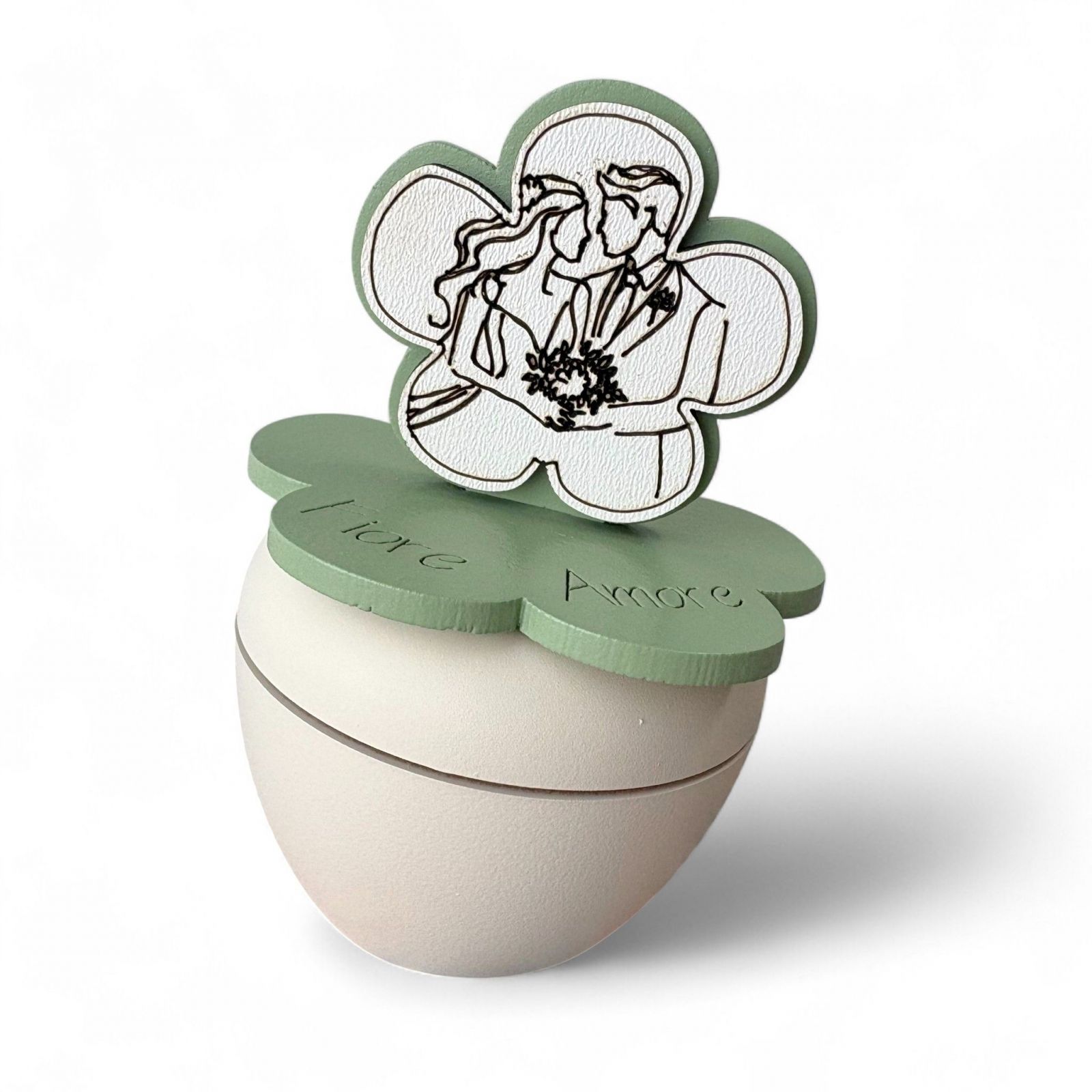 Scopri la nostra irresistibile bomboniera matrimonio, un portacandela che racchiude l'essenza dell'amore eterno. Sul coperchio, un delicato fiore abbellito da una dolce rappresentazione di sposi innamorati simboleggia l'inizio di un viaggio insieme, rendendo questo regalo un ricordo prezioso per i tuoi ospiti. Ogni volta che accenderanno la candela, saranno avvolti da calde emozioni e ricordi indimenticabili.