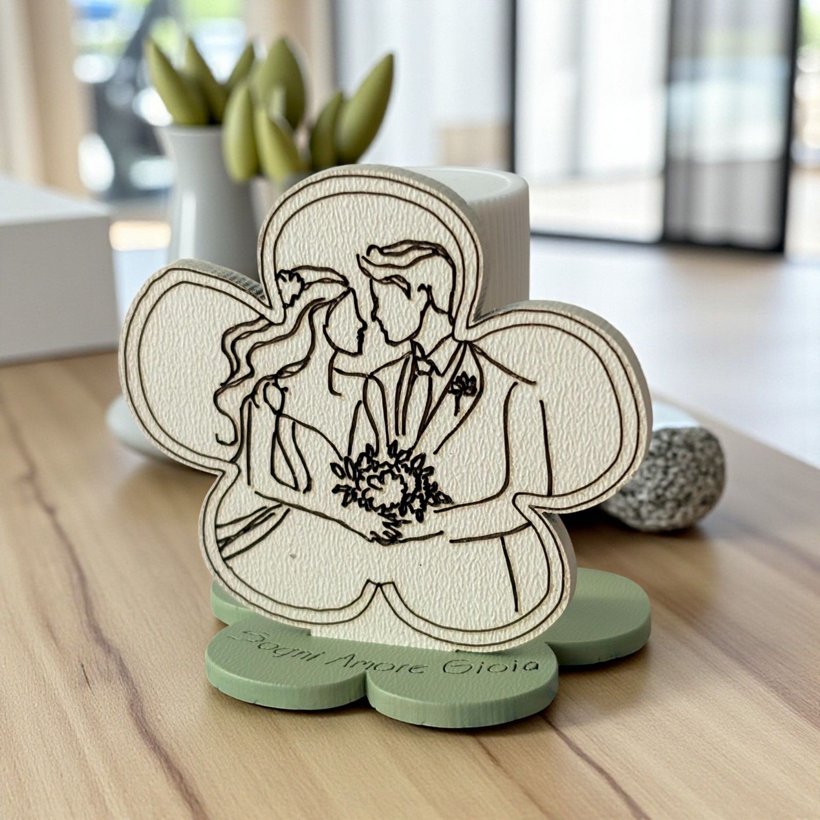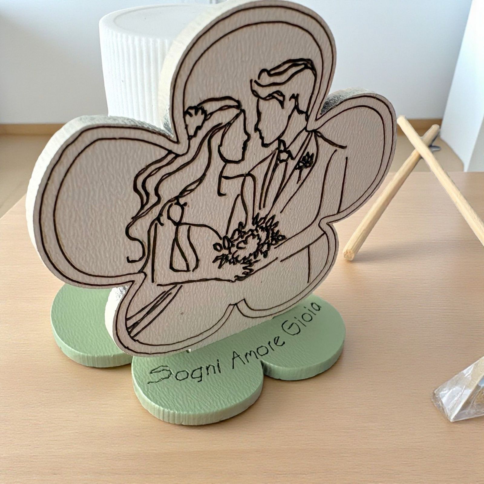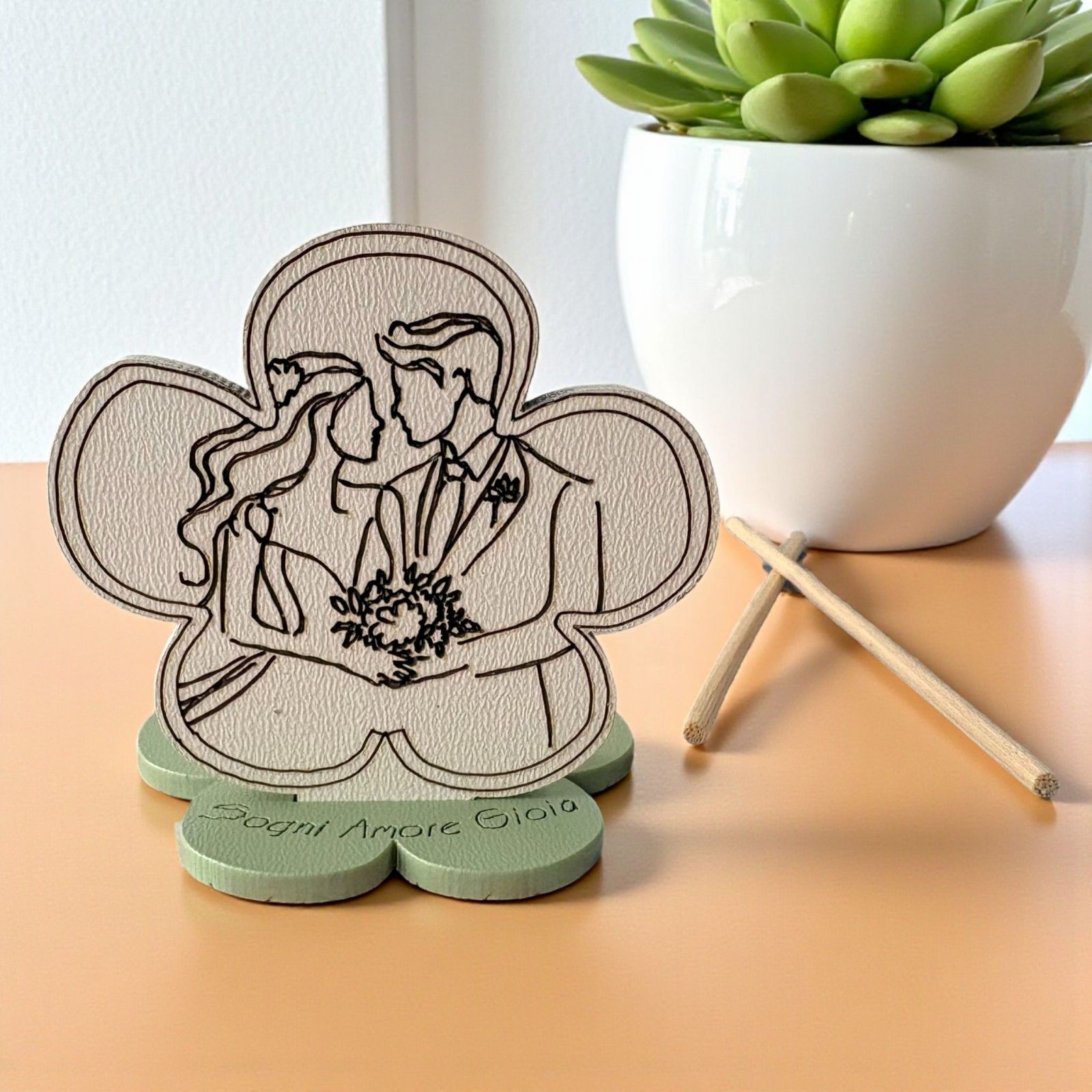 Regala ai tuoi ospiti un ricordo prezioso e profumato con questo diffusore essenza unico. La base a forma di fiore, color verde salvia, ospita al centro una delicata sagoma bianca con due sposi innamorati, mentre le parole "Sogni, Amore, Gioia" evocano emozioni e momenti indimenticabili. Perfetto come bomboniera per matrimonio, promessa o anniversario, questo dono trasmette affetto e gratitudine a chi partecipa alla vostra festa.
