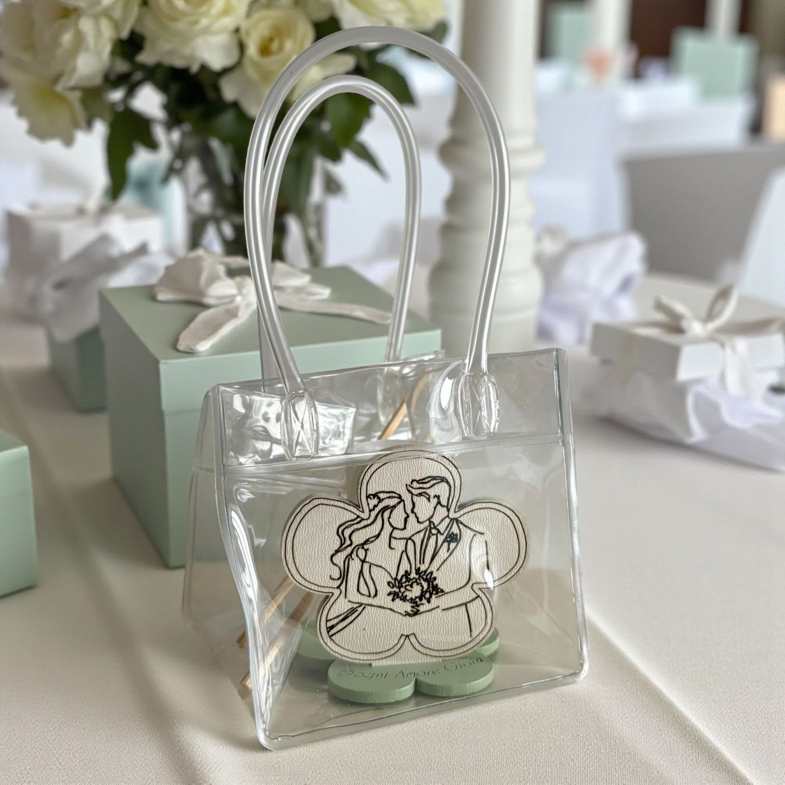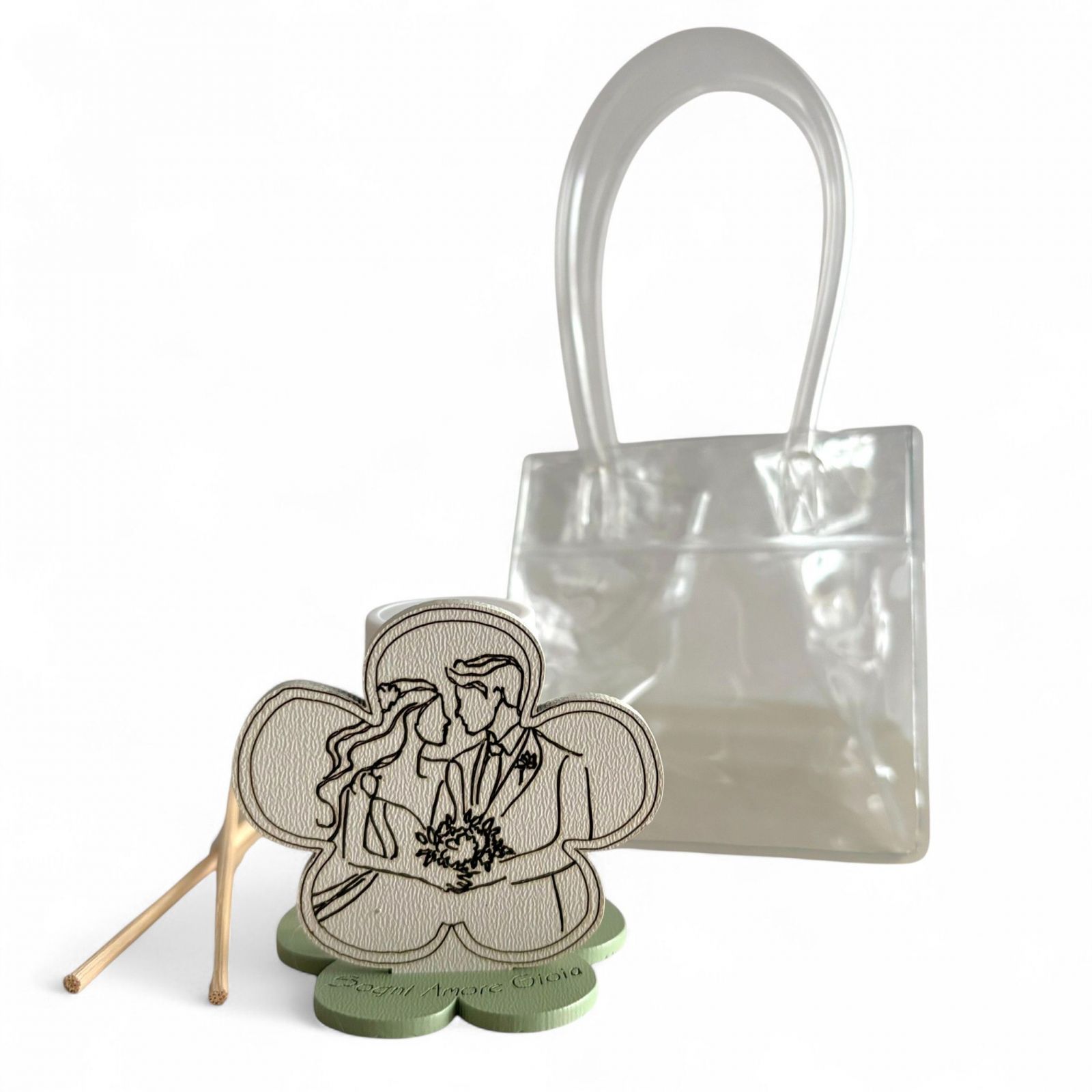 Realizzata in legno, questa bomboniera originale unisce estetica e funzionalità. Il set comprende una borsetta in PVC con manico e due bacchette profumate con essenza casuale in omaggio, trasformando il piccolo oggetto in un presente elegante e raffinato. Ideale anche come bomboniere utili, aggiunge un tocco di stile e profumo all’ambiente degli invitati.