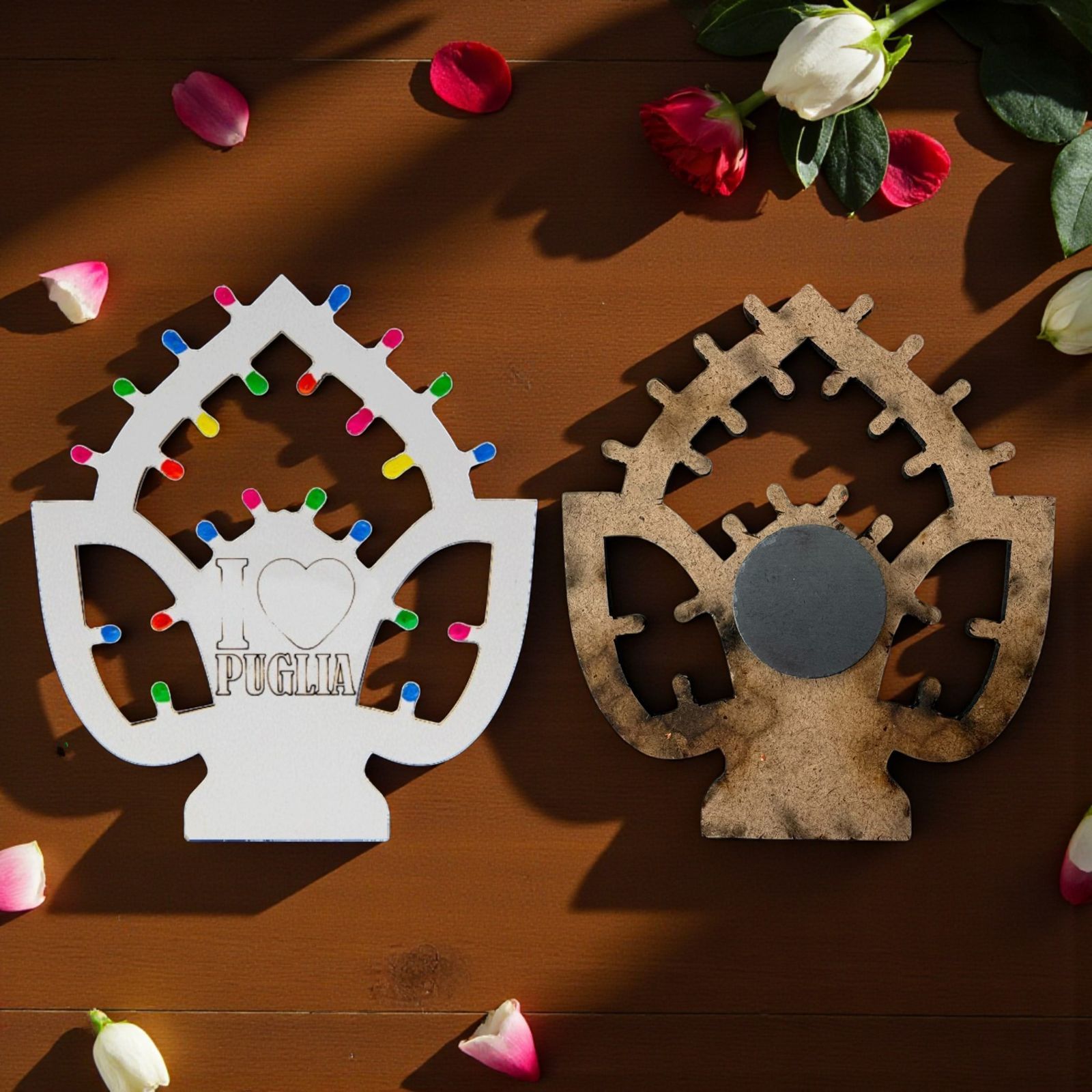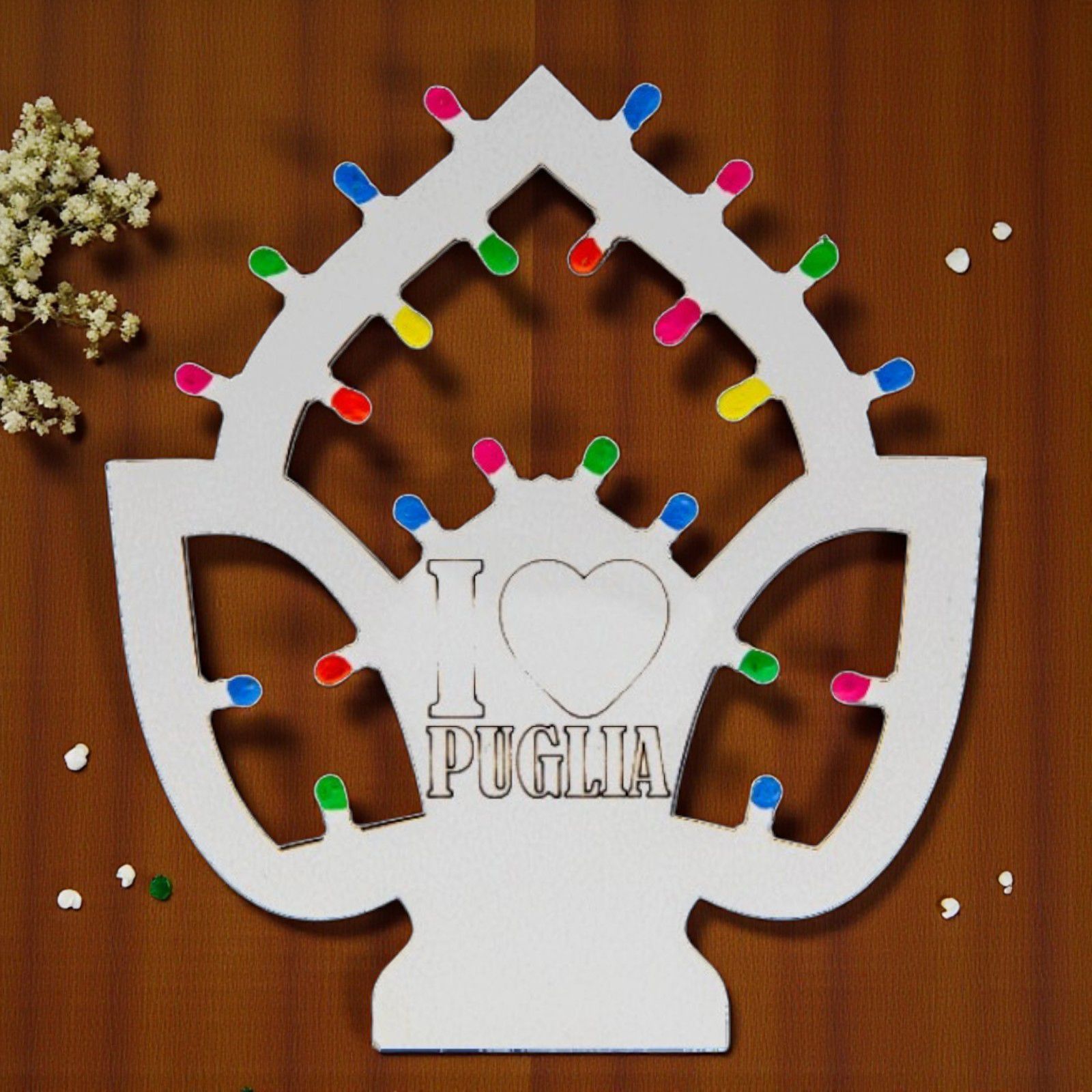 Realizzata in legno di alta qualità, questa bomboniera non è solo un segnaposto, ma anche un magnete che porterà con sé il calore della tradizione pugliese. Le "lucine" multicolor aggiungono un tocco di magia, rendendo questa calamita un perfetto ricordo da custodire con affetto. Ideale per chi cerca un modo originale e significativo di ringraziare i propri invitati.
