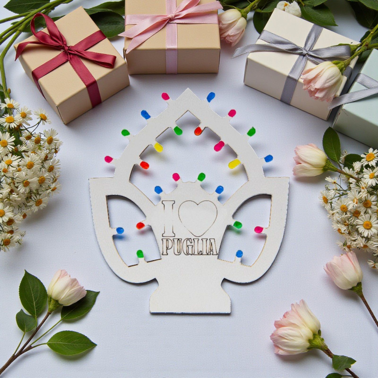 Immagina di rendere indimenticabile il tuo evento speciale con una bomboniera che racchiude l'essenza della Puglia. La nostra calamita a forma di pumo, ispirata alle luminarie, con l'incisione "I Love Puglia", non è solo un semplice regalo, ma un simbolo di amore e tradizione, perfetto per matrimoni, battesimi, comunioni, cresime e compleanni. Ogni volta che i tuoi ospiti la osserveranno, saranno trasportati in una delle terre più belle e affascinanti d'Italia.