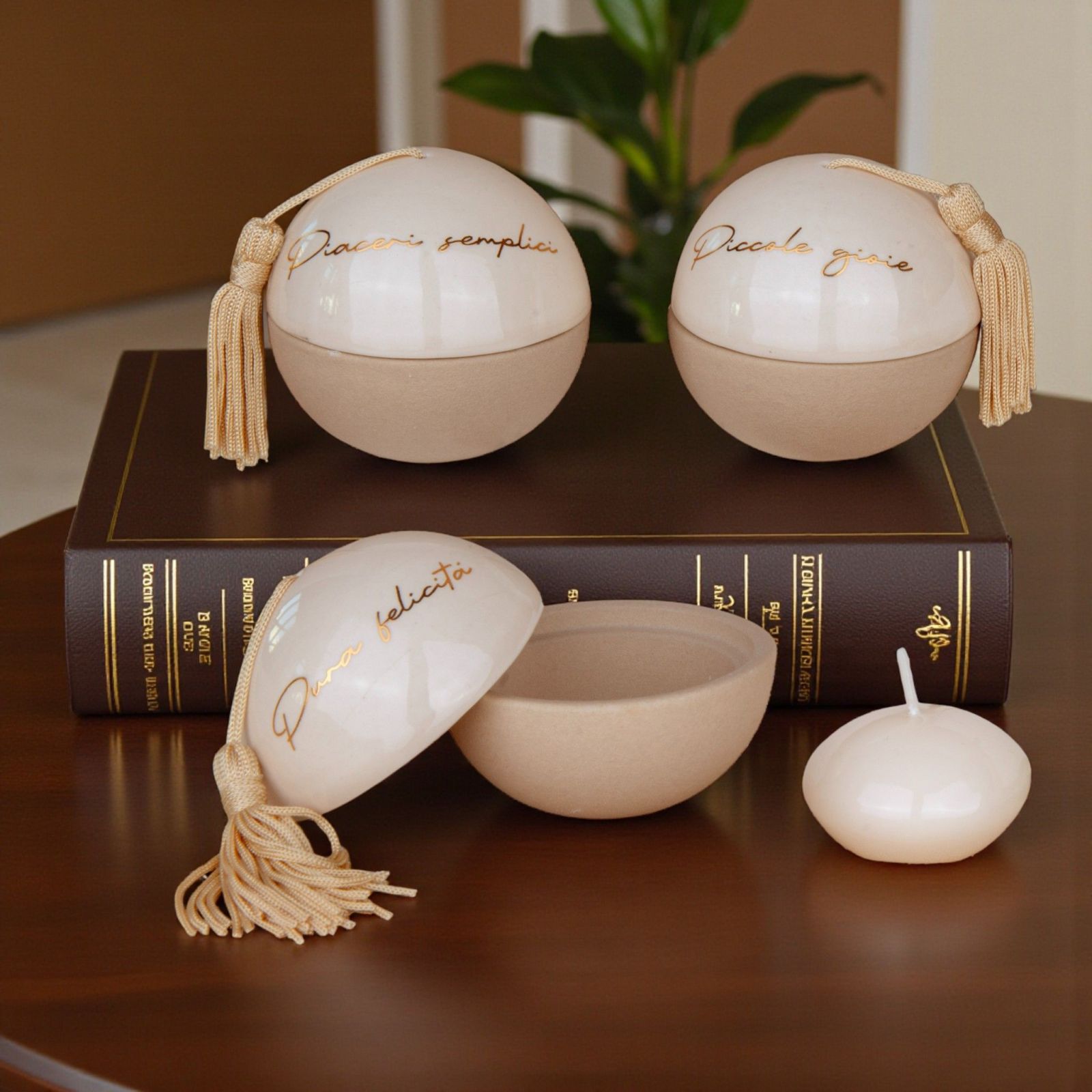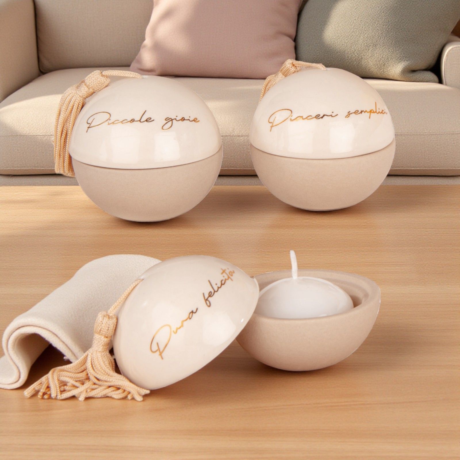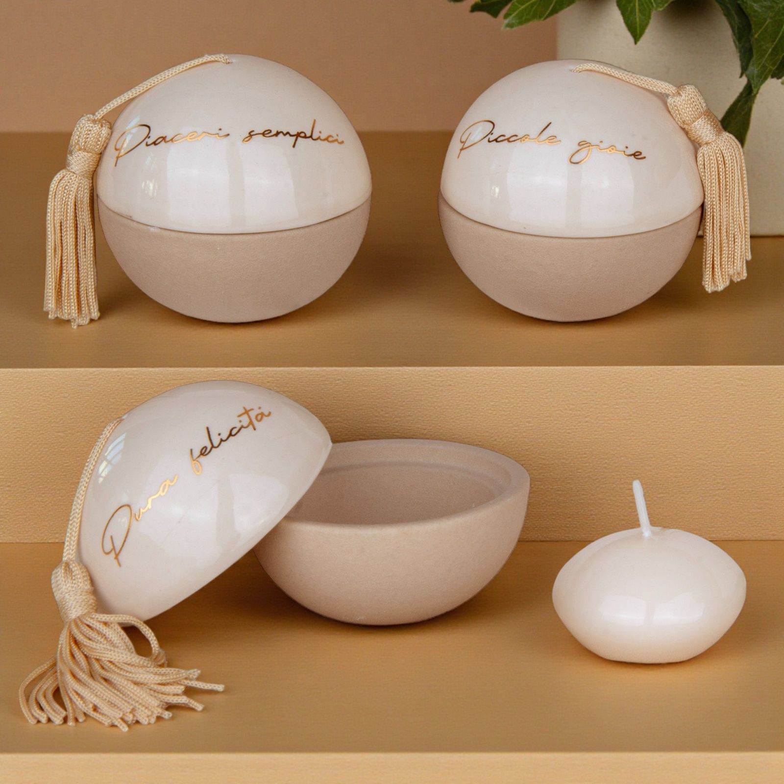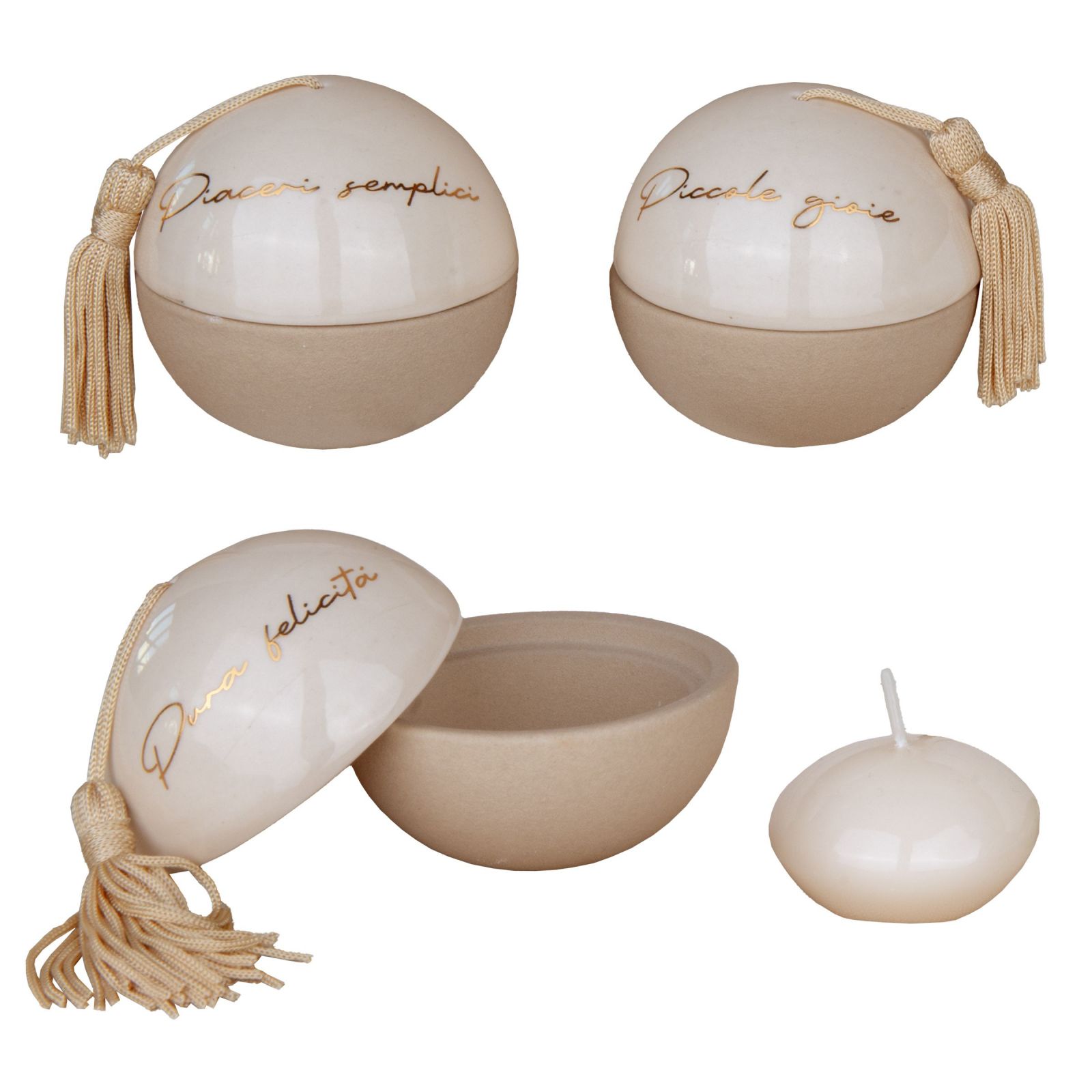 Un piccolo tesoro da condividere con i tuoi ospiti: questo raffinato portacandela a forma di sfera, con nappina e scritte dorate "Piccole Gioie", "Pura felicità" e "Piaceri semplici", diventa una bomboniera preziosa per comunione, cresima, matrimonio o anniversario, capace di trasmettere emozione e gratitudine.
