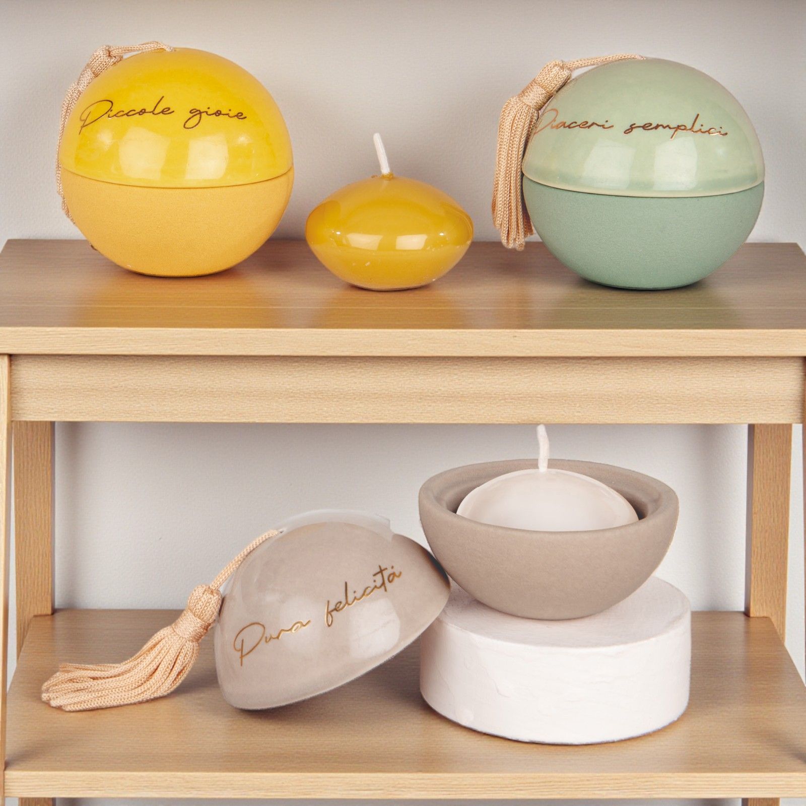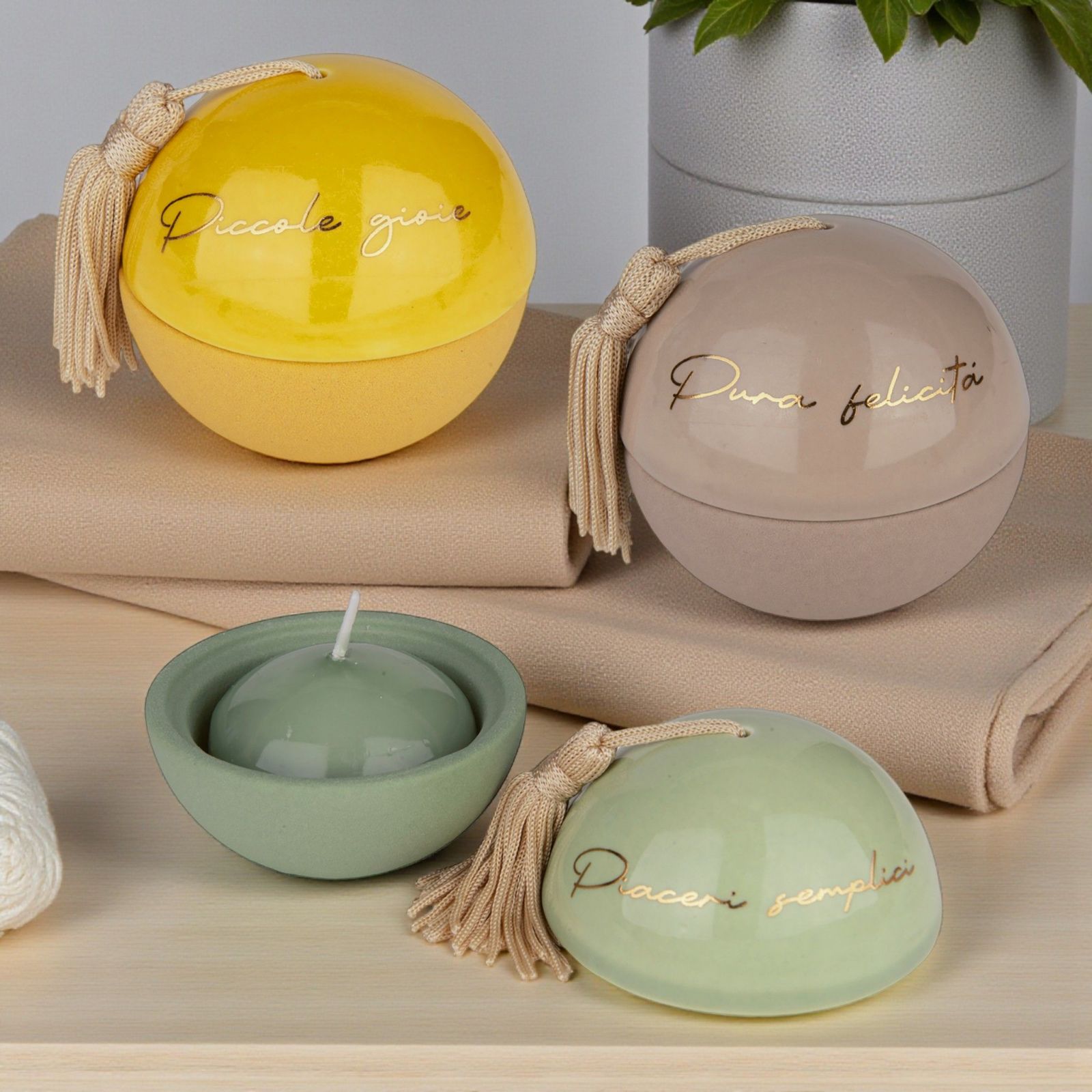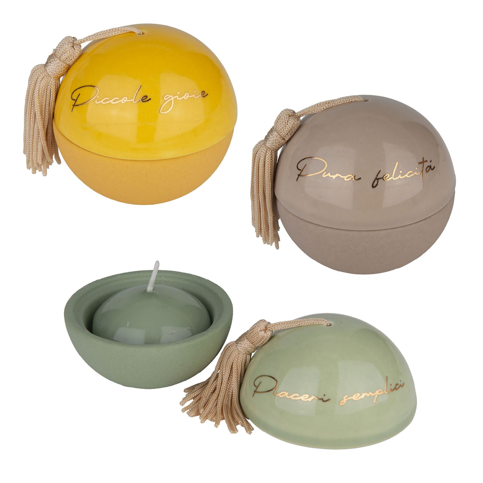 Sorprendi i tuoi ospiti con un dono che racchiude emozioni: questo portacandela a forma di sfera, con nappina e scritte dorate assortite "Piccole Gioie", "Pura felicità" e "Piaceri semplici", è una bomboniera pensata per essere condivisa, perfetta per comunione, cresima, matrimonio o anniversario.
