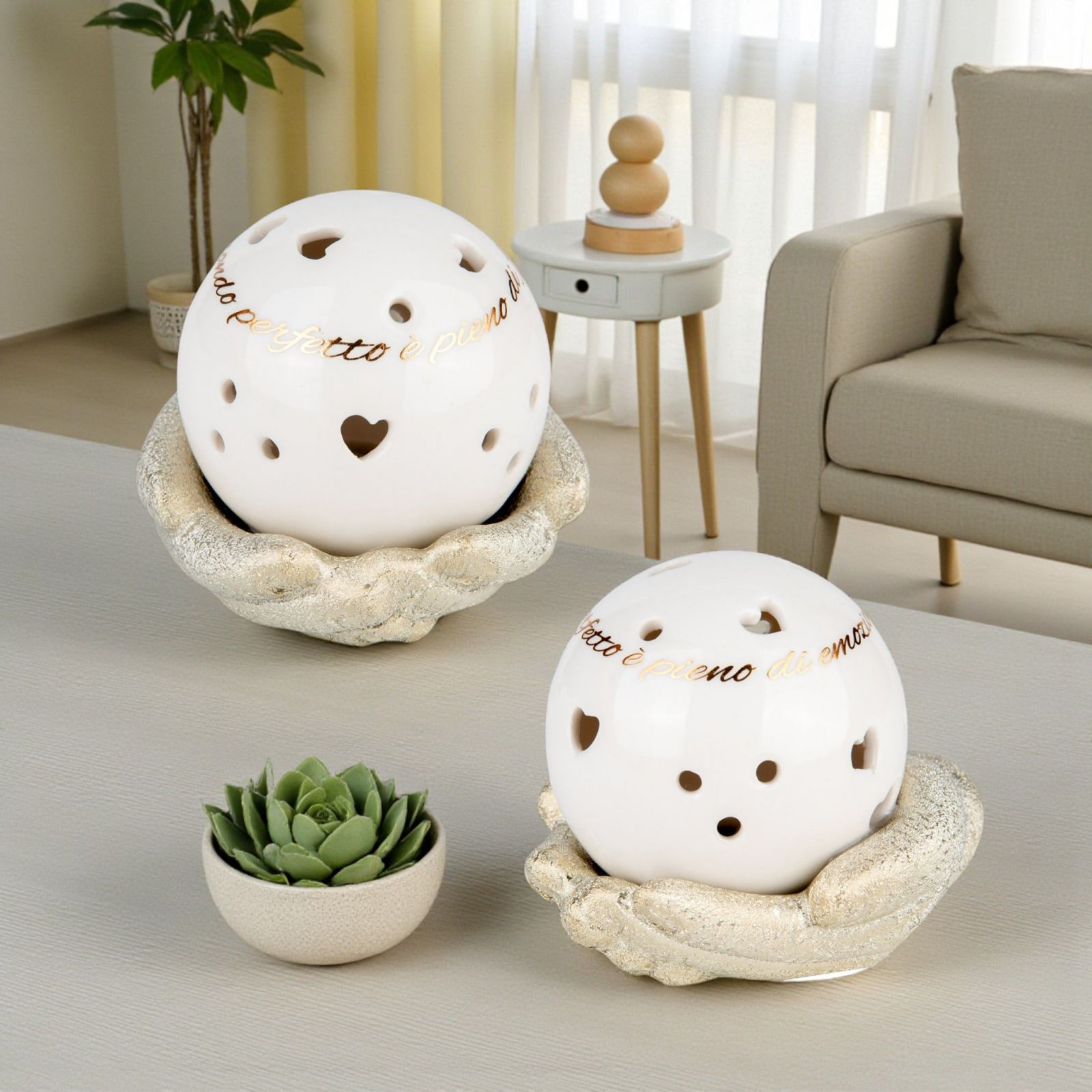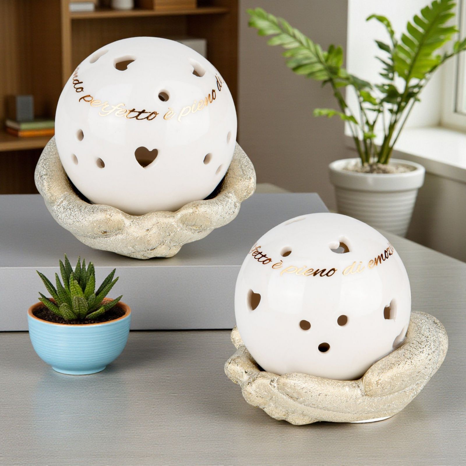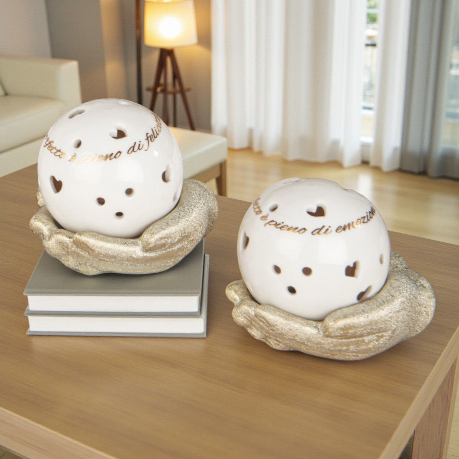 Realizzata in porcellana di alta qualità, con sfera bianca, frase color oro e mani dorate, questa bomboniera emana una luce led calda che cattura lo sguardo e riscalda il cuore, rendendo ogni evento ancora più memorabile per gli invitati.