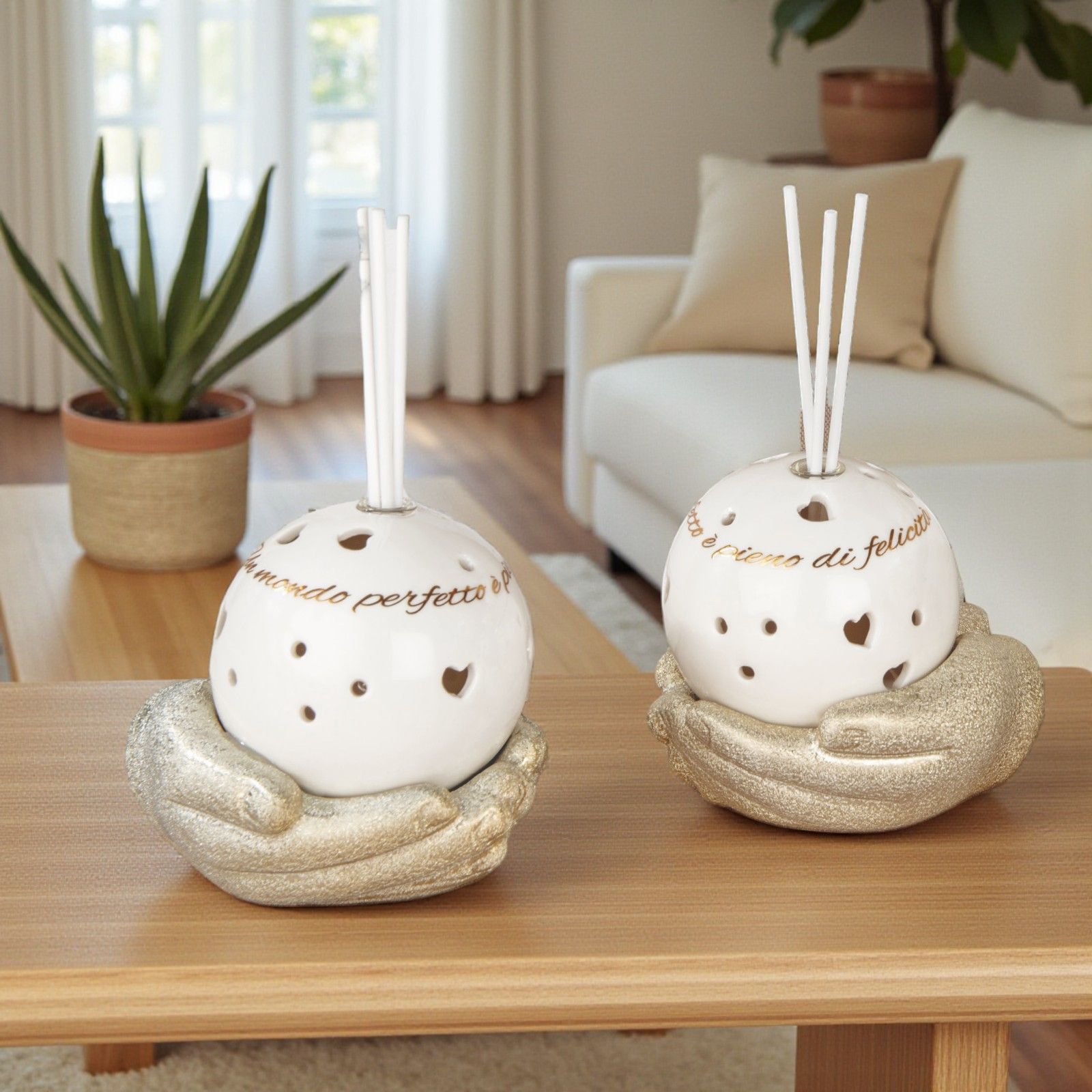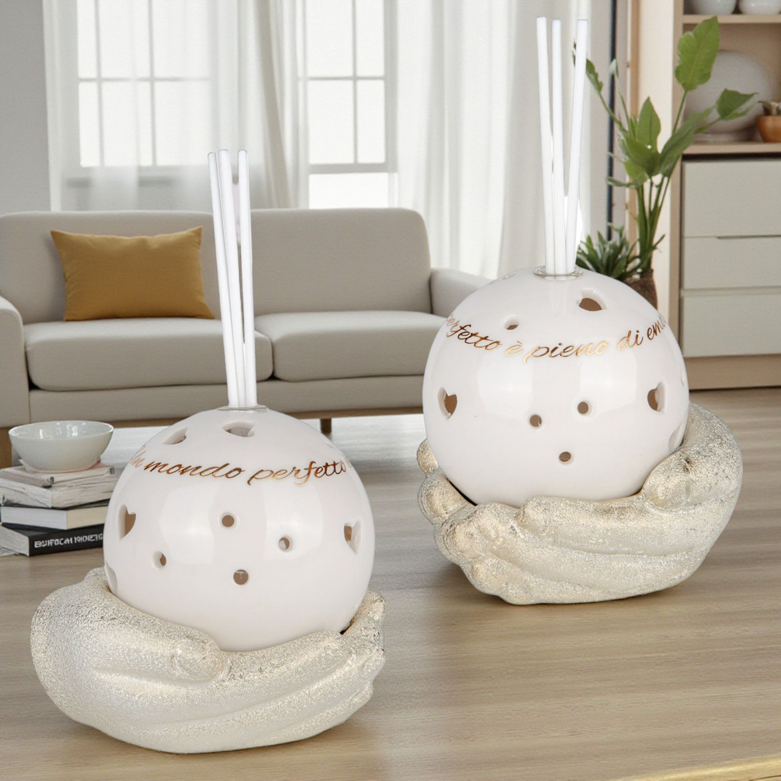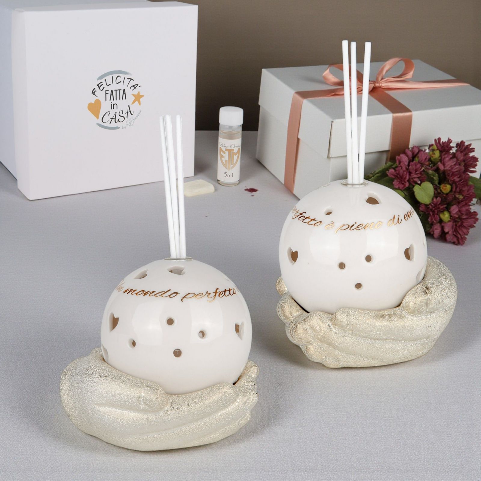 Regala un frammento di felicità e emozione ai tuoi cari in un giorno speciale con il nostro profumatore per ambiente con sfera. Questo elegante oggetto non è solo un diffusore, ma un simbolo di amore e condivisione, perfetto per celebrare matrimoni, anniversari o qualsiasi momento indimenticabile. Il profumatore è assortito con due frasi: "Il mondo è pieno di felicità" e "Il mondo è pieno di emozioni".