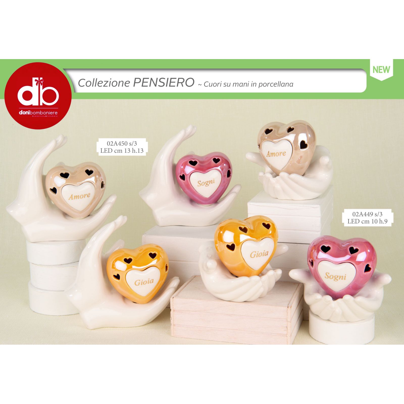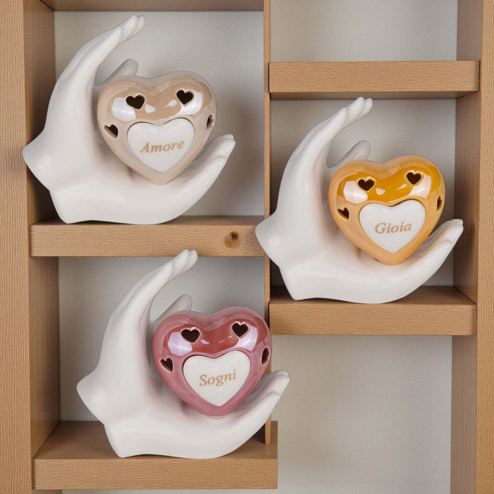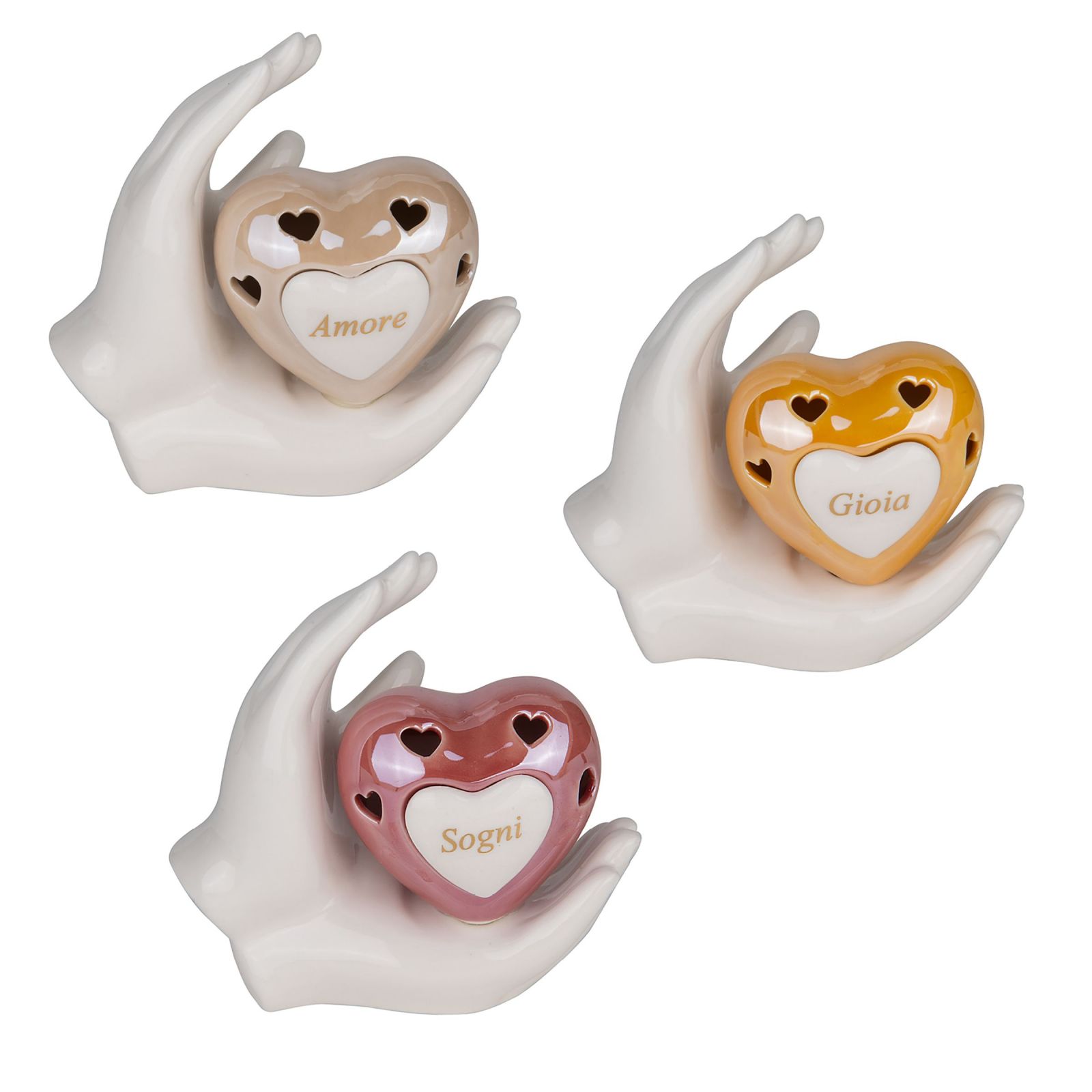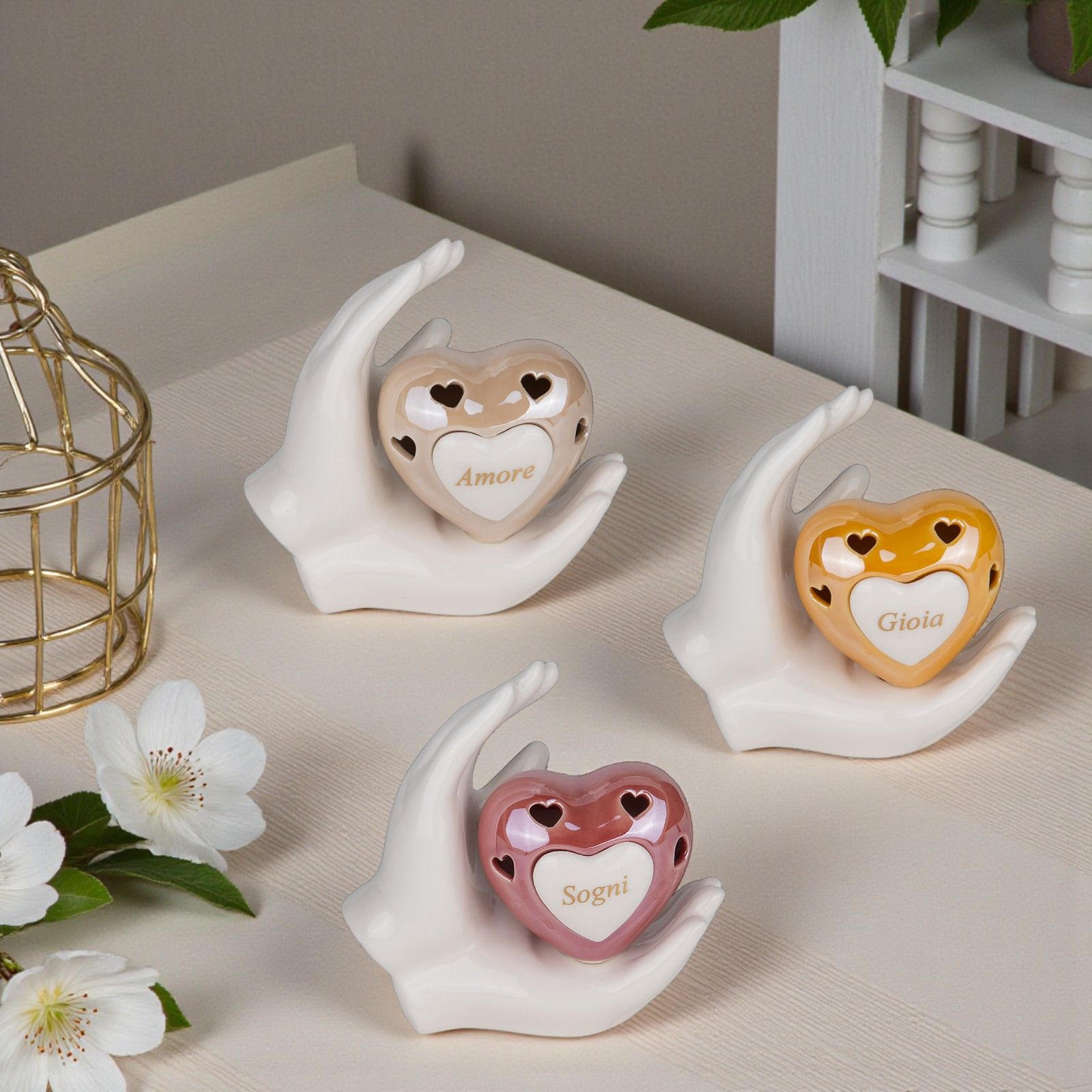 Regala un ricordo unico ai tuoi invitati con questa elegante lampada led a forma di cuore traforato posata su una mano bianca e decorata con le parole assortite "Amore" "Sogni" e "Gioia". Una bomboniera perfetta per matrimonio pensata per trasmettere affetto e momenti speciali condivisi.