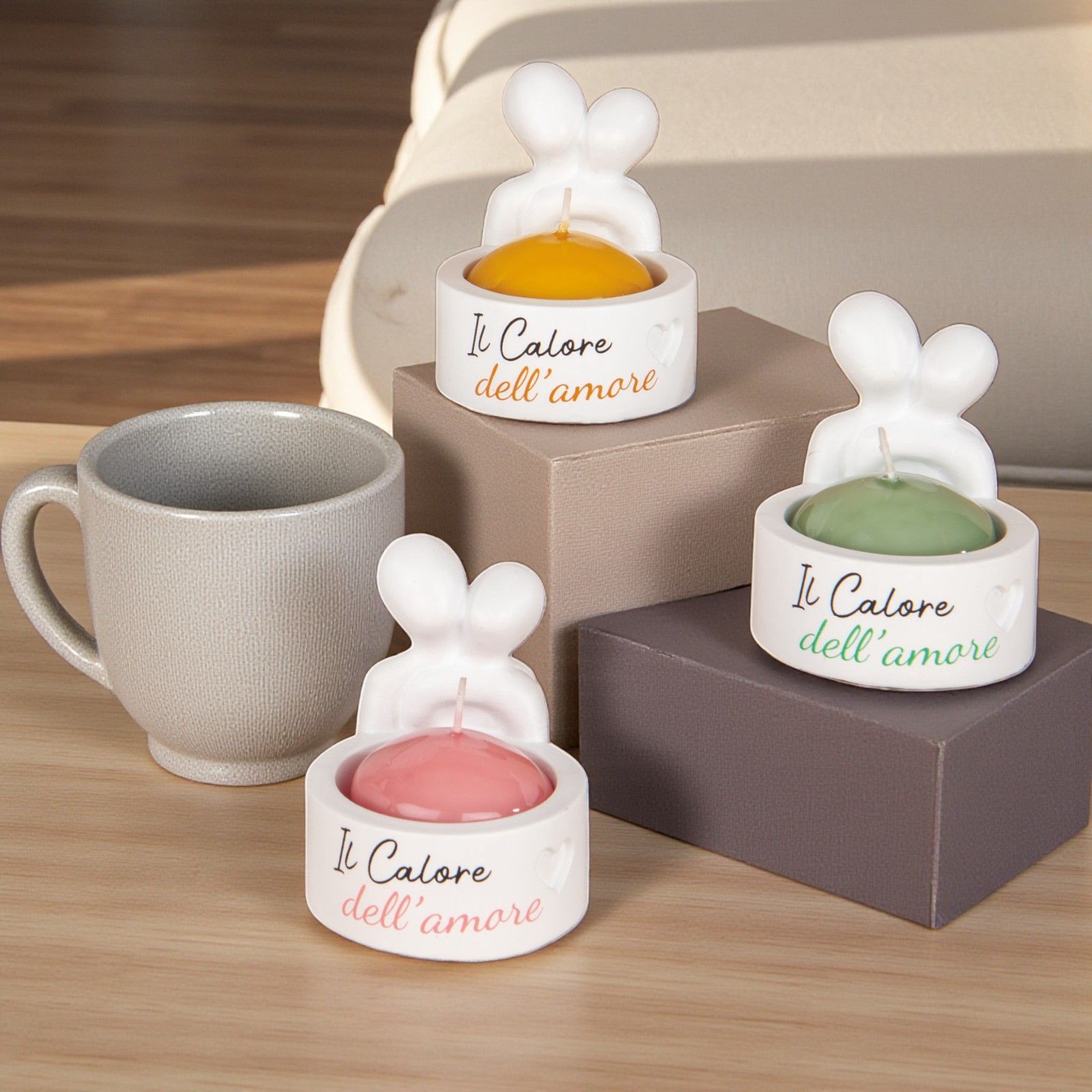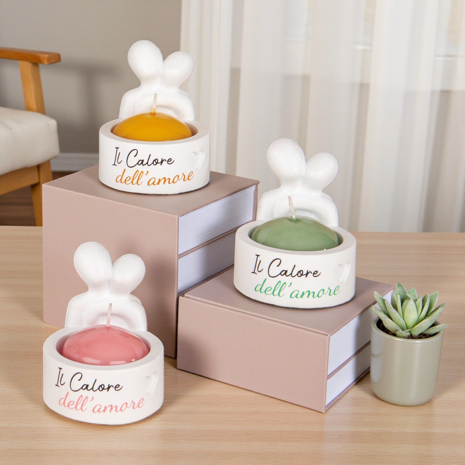 Vuoi lasciare un ricordo romantico e speciale ai tuoi invitati? Questo portacandela con innamorati abbracciati con tre frase "il calore dell'amore" è la bomboniera perfetta per matrimonio o anniversario. Realizzato in terracotta, trasmette dolcezza e intimità, diventando un pensiero emozionante che scalda il cuore di chi lo riceve.