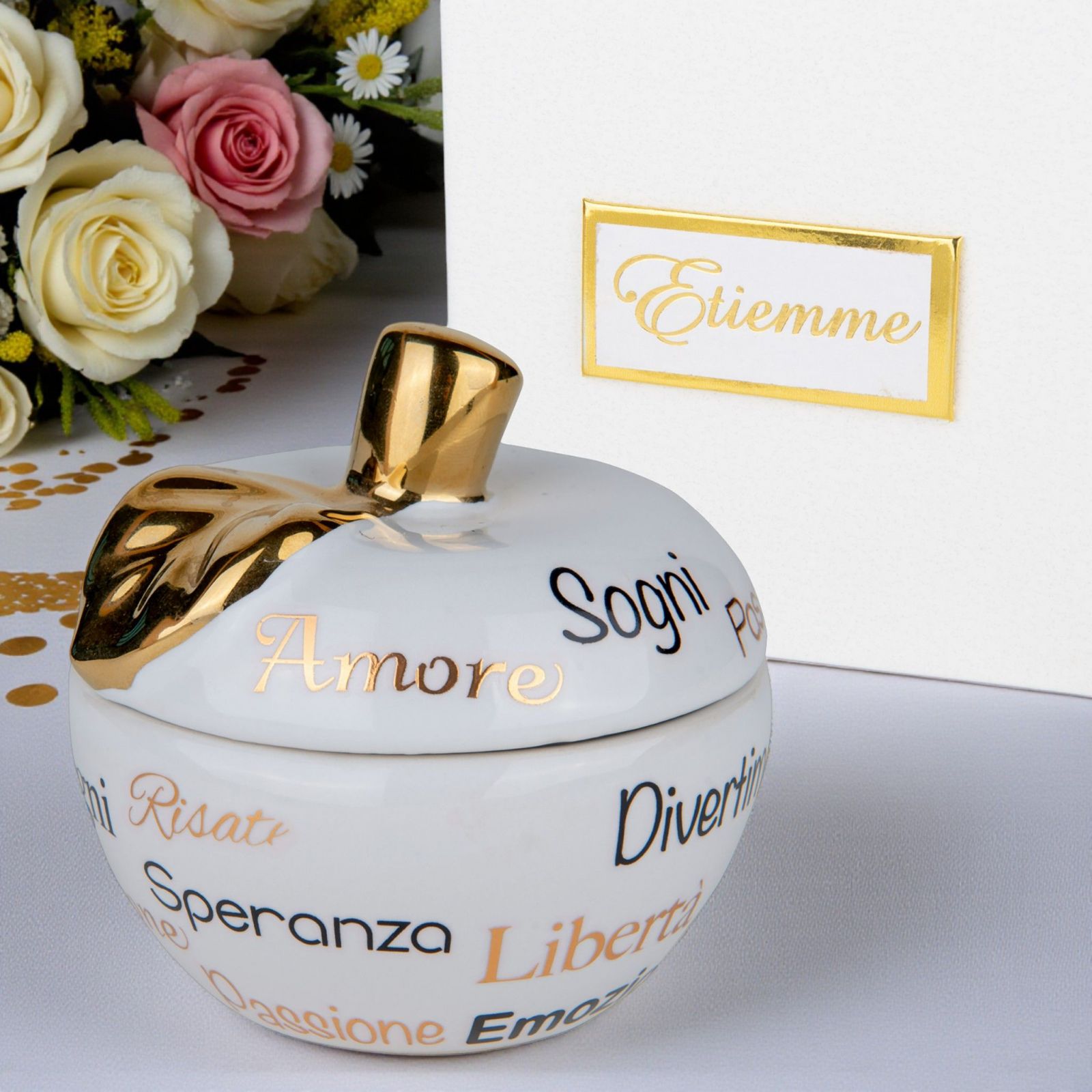 Realizzato in delicata porcellana, il portacandela si presenta in una raffinata tonalità bianca, adornato con scritte nere e dettagli dorati, che lo rendono un'idea bomboniera originale e di classe. La sua eleganza discreta si adatta perfettamente a qualsiasi stile di arredamento.
