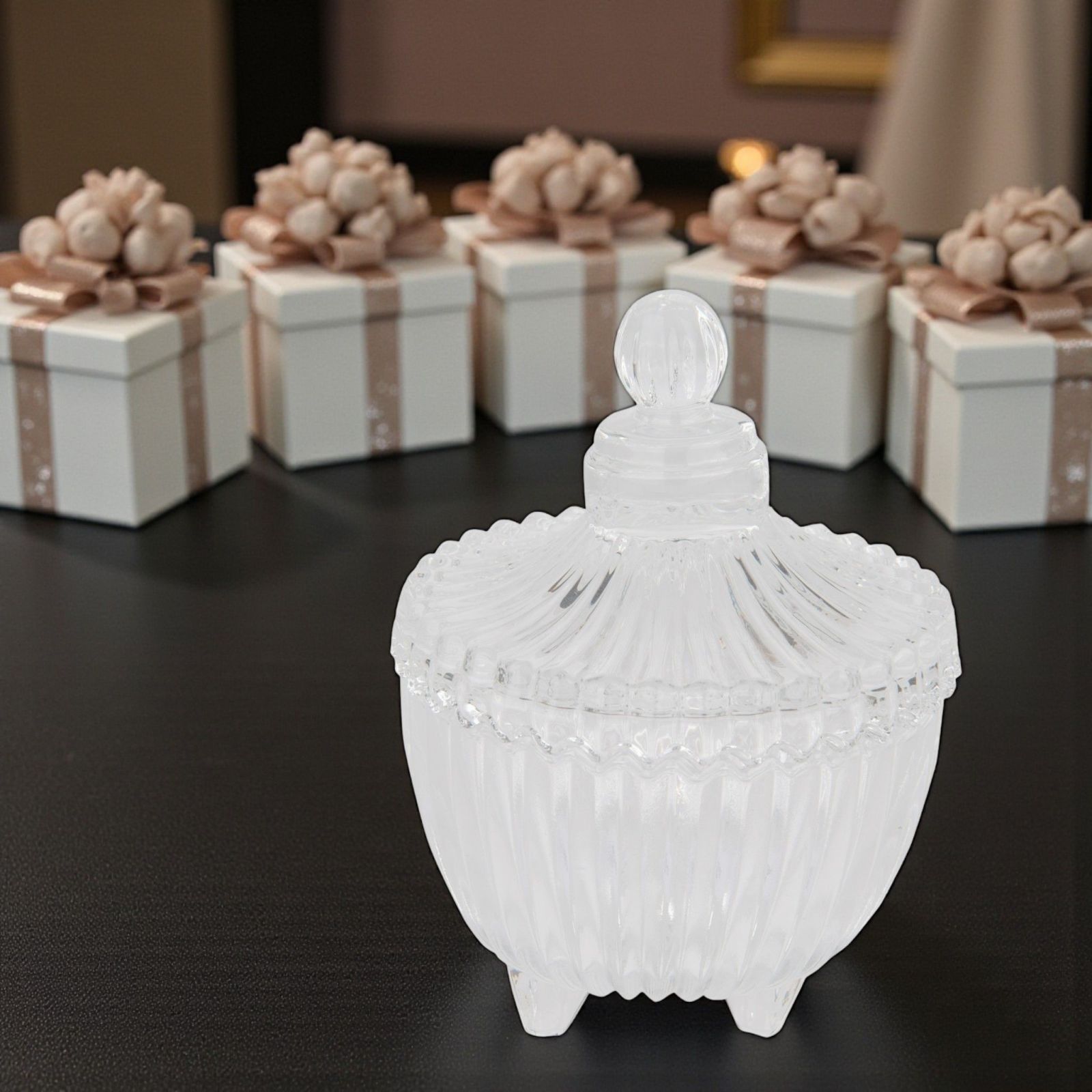 Se stai cercando un modo per rendere il tuo anniversario o le tue nozze indimenticabili, la nostra scatola in vetro con tre piedi e coperchio è la scelta perfetta. Questo elegante accessorio non è solo una bomboniera, ma un simbolo di amore e di ricordi preziosi, da custodire con cura. Ogni scatola racconta una storia, e quelle storie possono diventare parte del tuo grande giorno, donando un tocco di classe e originalità.