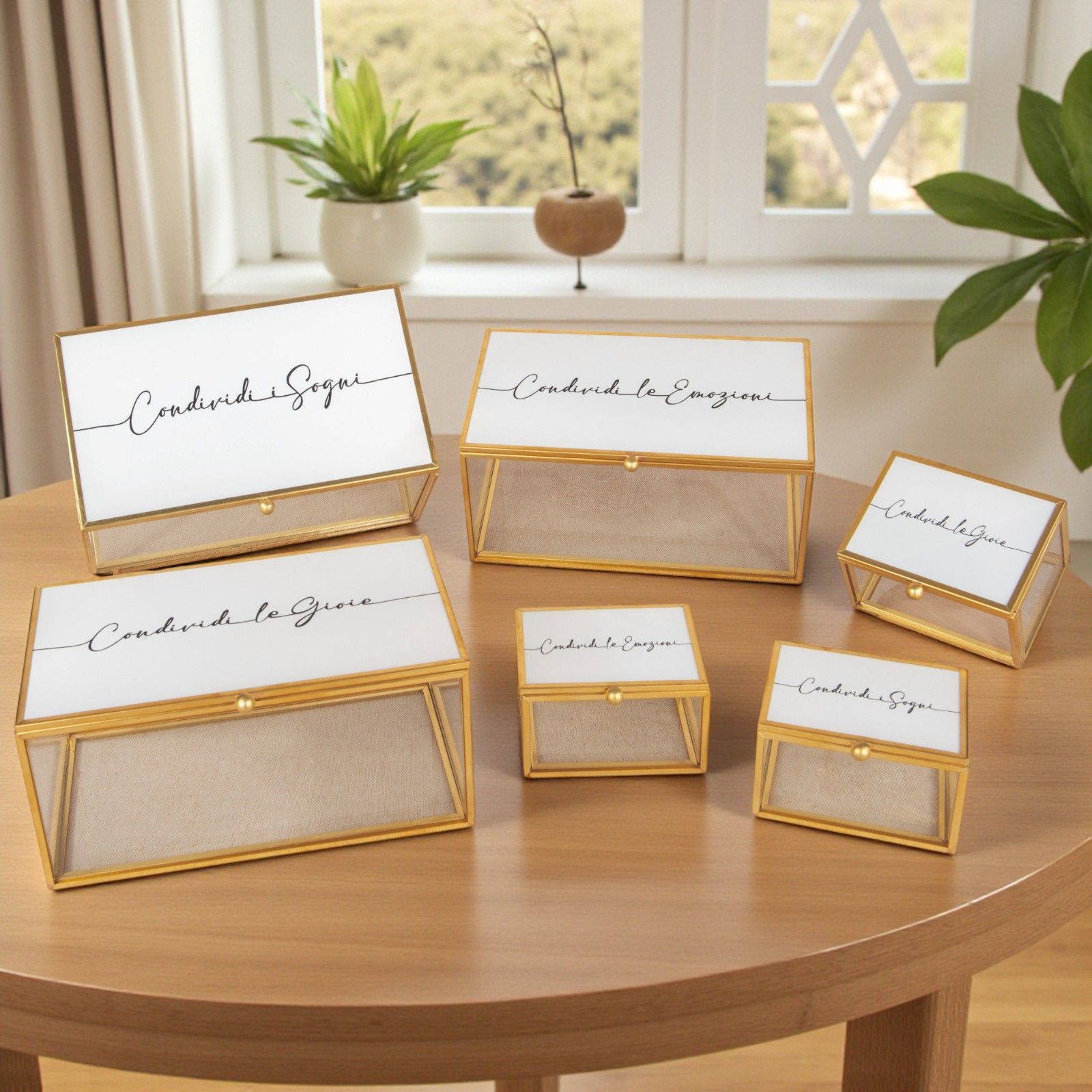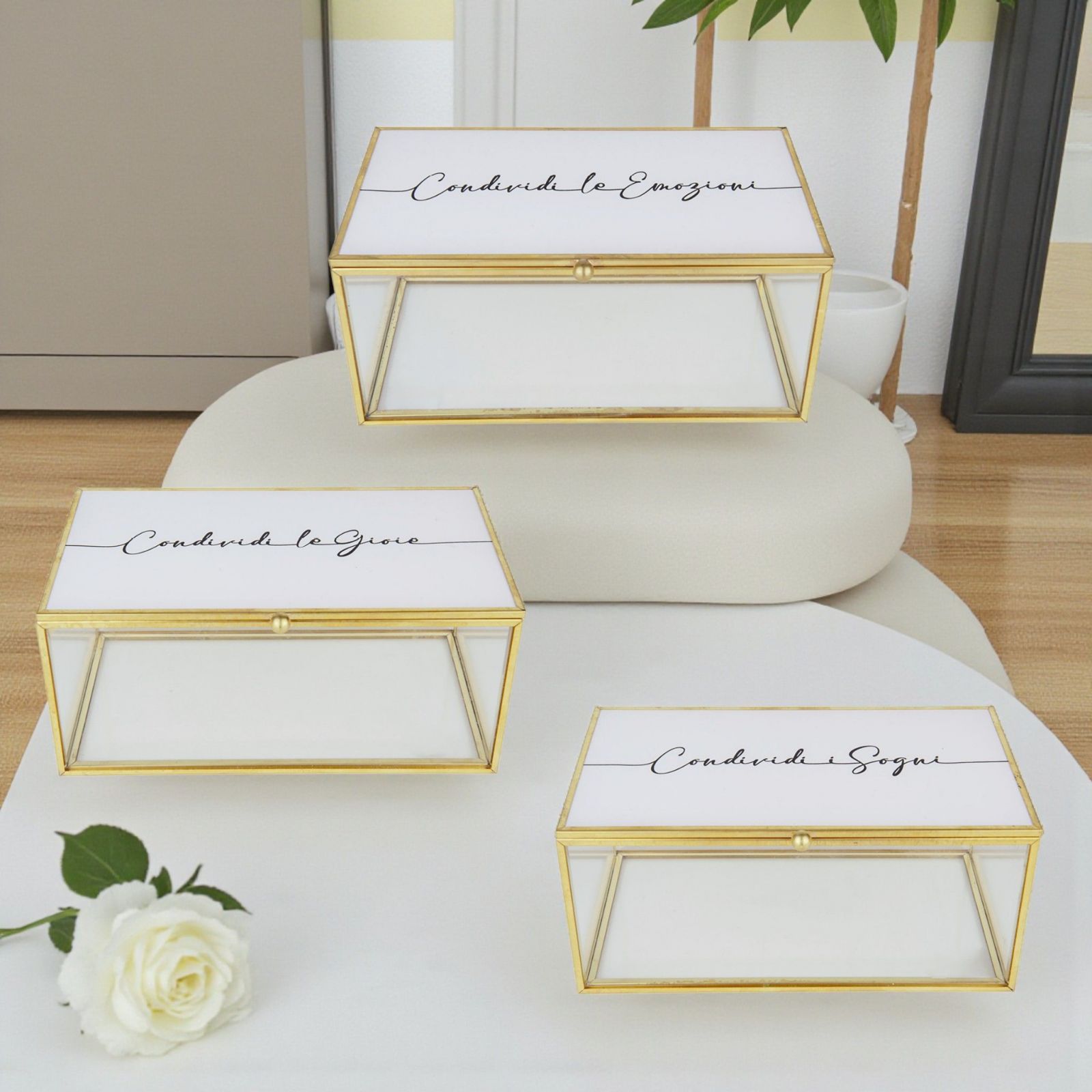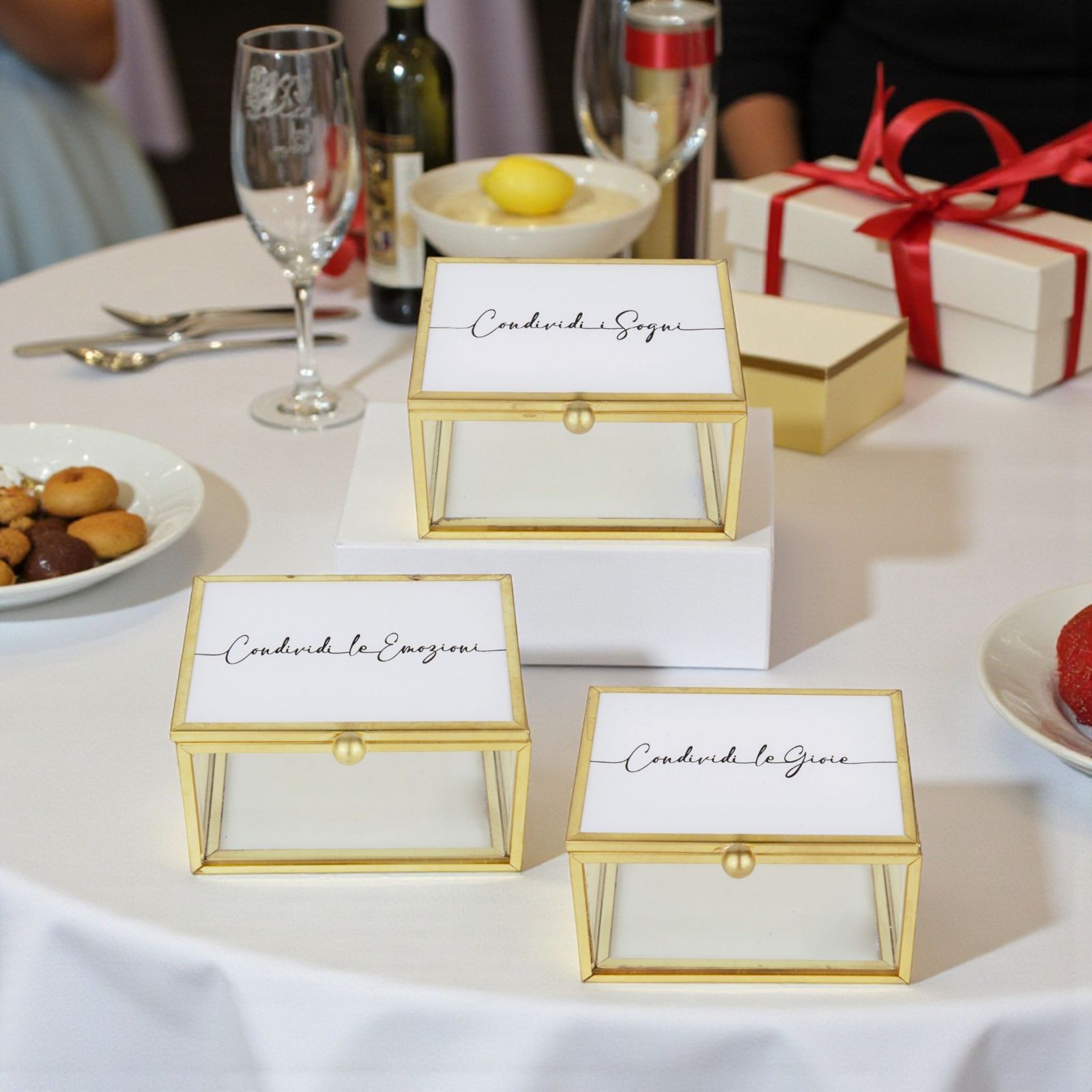 Realizzate in vetro trasparente con bordi dorati e una scritta nera elegante, queste bomboniere nozze sono un'ottima soluzione per chi cerca idee originali ed economiche. Ogni scatola racconta una storia, quella della festa e dei legami che si intrecciano, permettendo a tutti di portare a casa un pezzo di felicità e di riflessione.